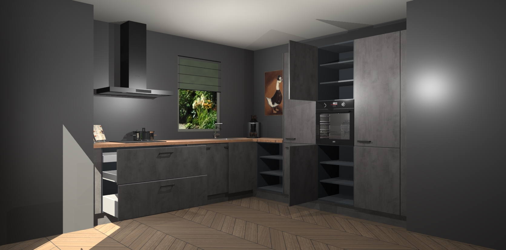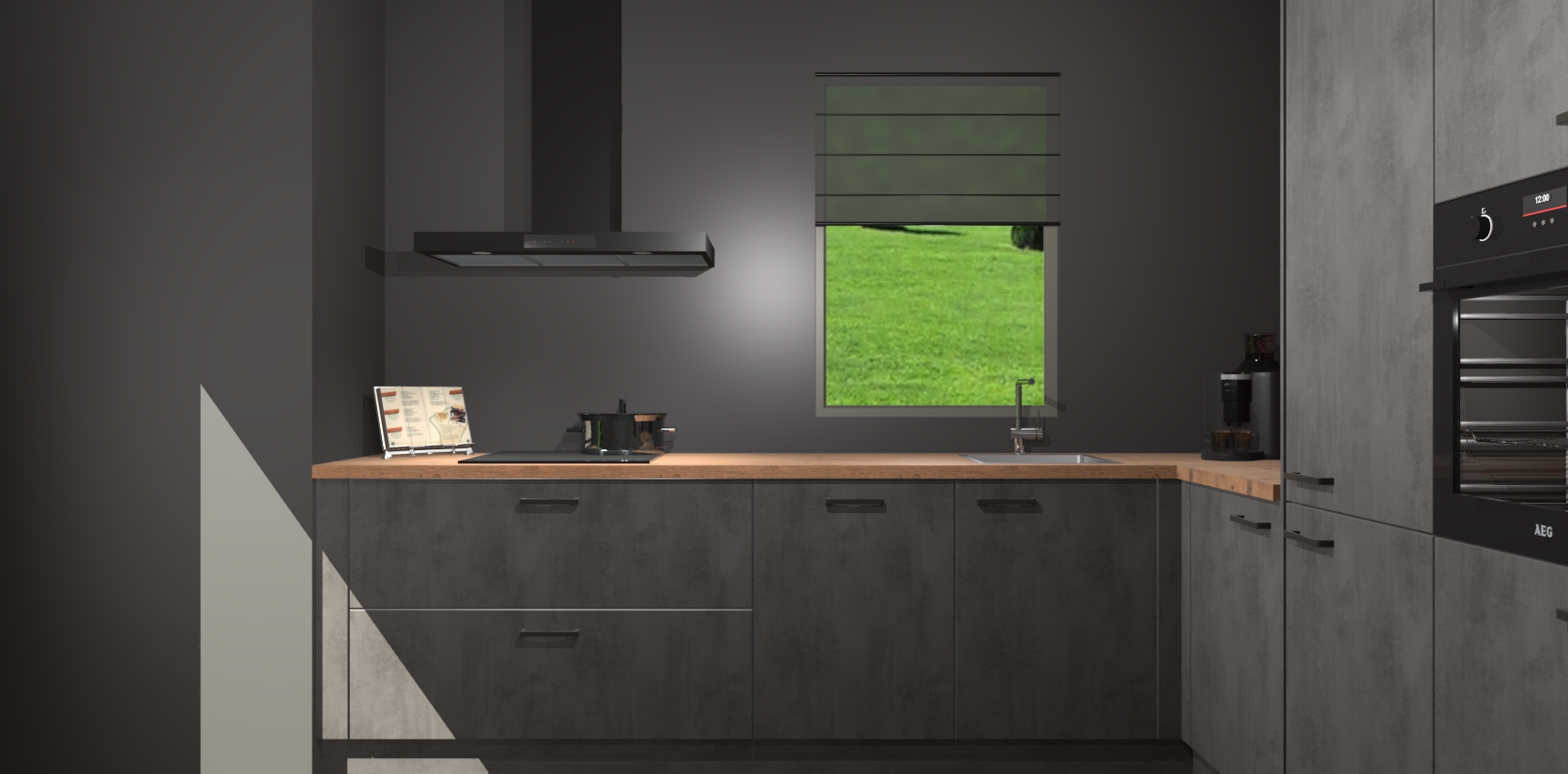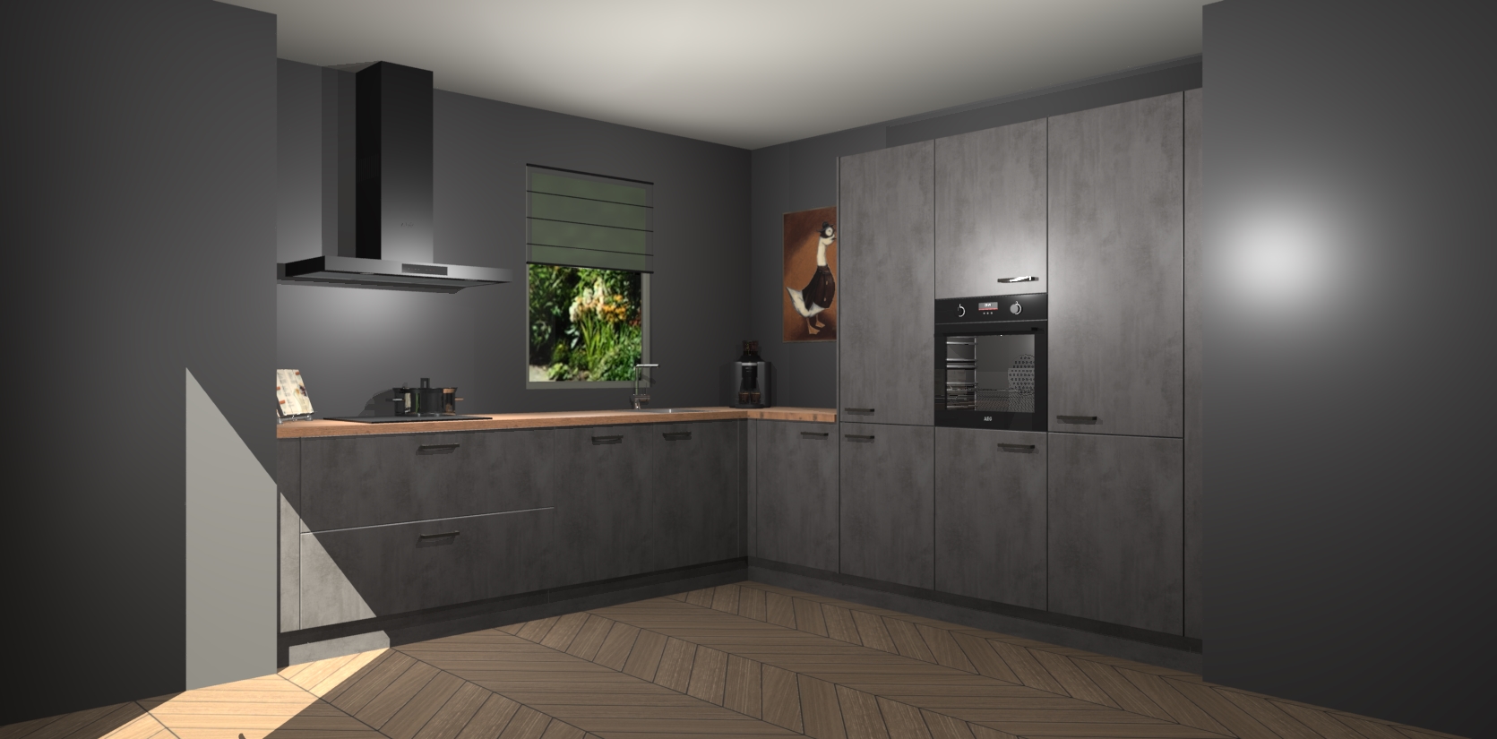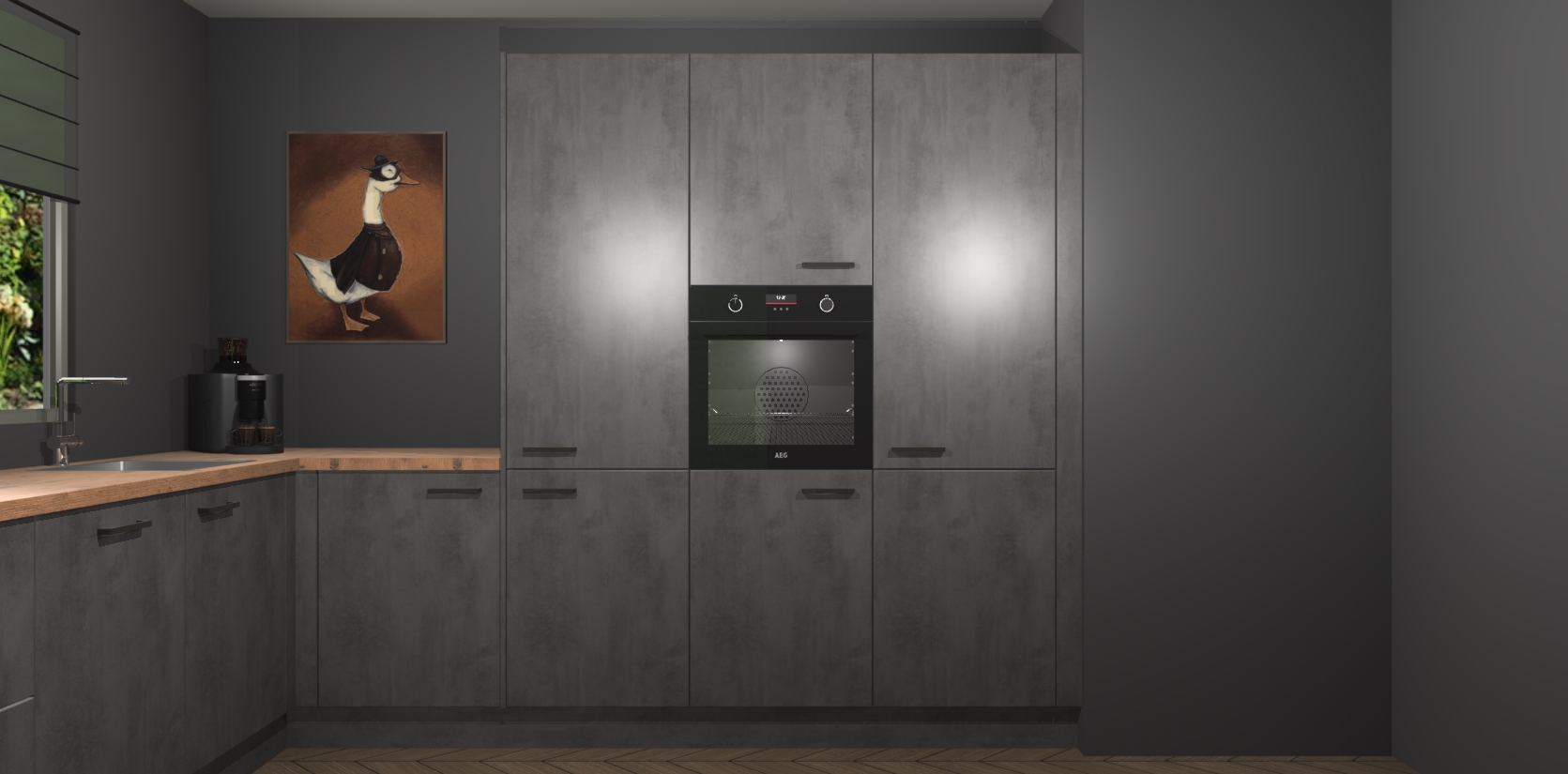 Welkom bij de Beton Antraciet keuken Laos. Deze prachtige keuken zal de komende jaren het middelpunt van de belangstelling in uw huis zijn. Uitgerust met vijf inbouwapparaten komt u nooit kookgereedschap tekort. Bovendien geeft de warme houtlook elke ruimte een uitnodigende en tijdloze uitstraling.