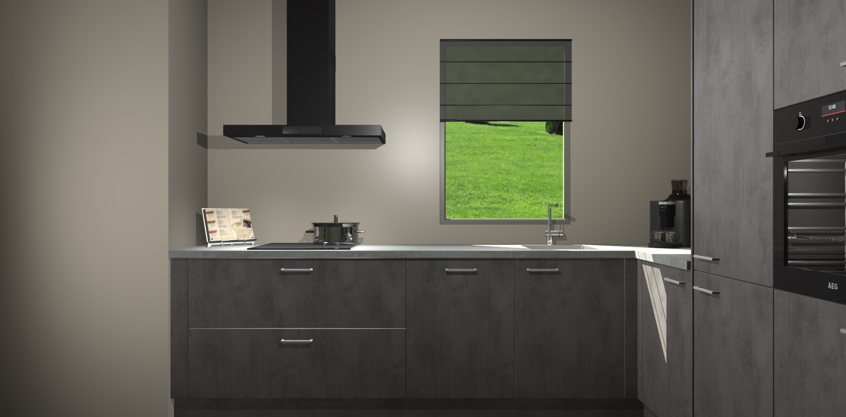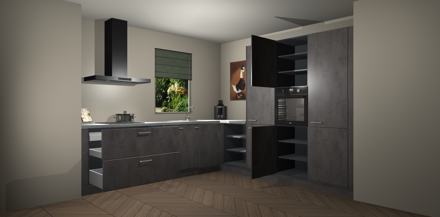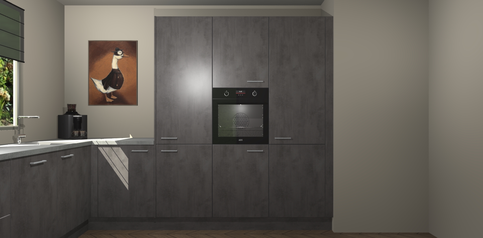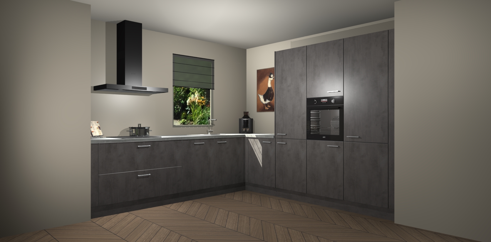 Welkom bij de Beton Antraciet keuken Laos. Deze prachtige keuken zal de komende jaren het middelpunt van de belangstelling in uw huis zijn. Uitgerust met vijf inbouwapparaten komt u nooit kookgereedschap tekort. Bovendien geeft de warme houtlook elke ruimte een uitnodigende en tijdloze uitstraling.