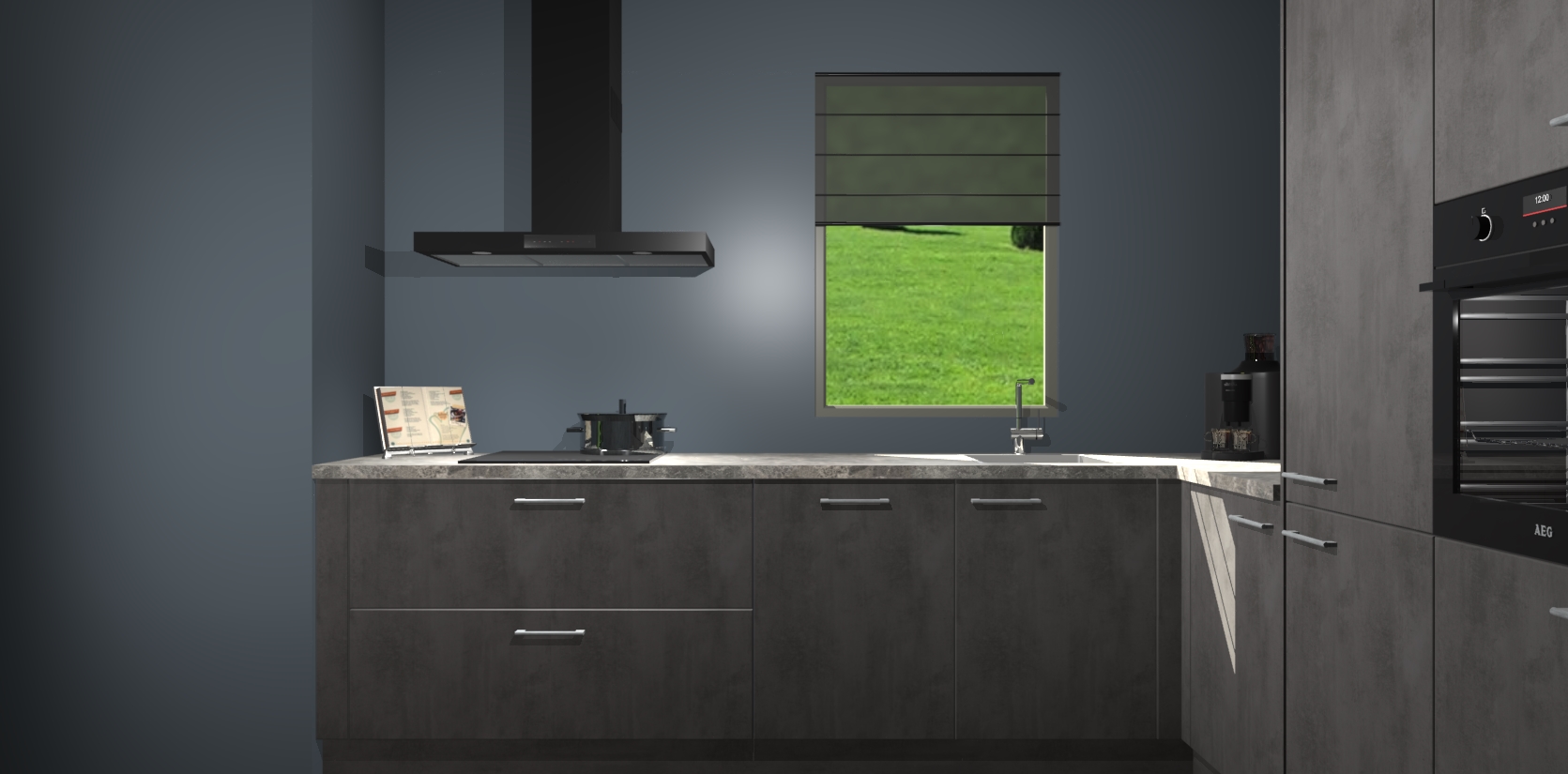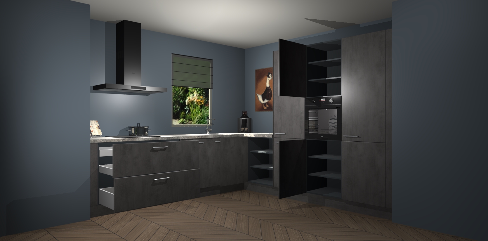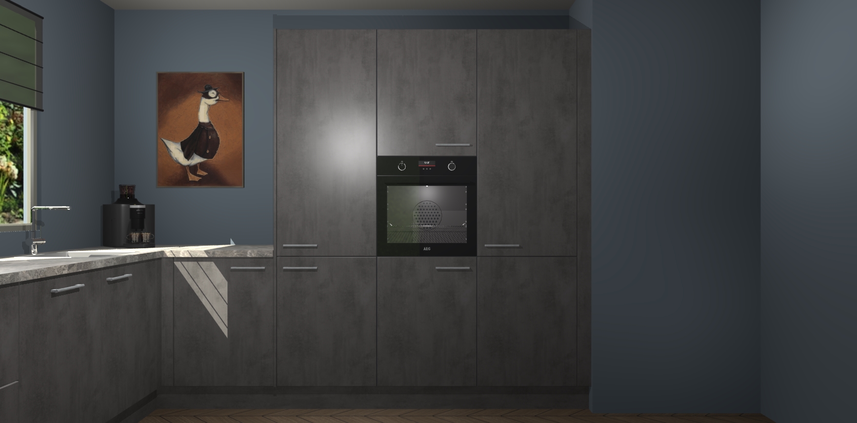 Welkom bij de Beton Antraciet keuken Laos. Deze prachtige keuken zal de komende jaren het middelpunt van de belangstelling in uw huis zijn. Uitgerust met vijf inbouwapparaten komt u nooit kookgereedschap tekort. Bovendien geeft de warme houtlook elke ruimte een uitnodigende en tijdloze uitstraling.