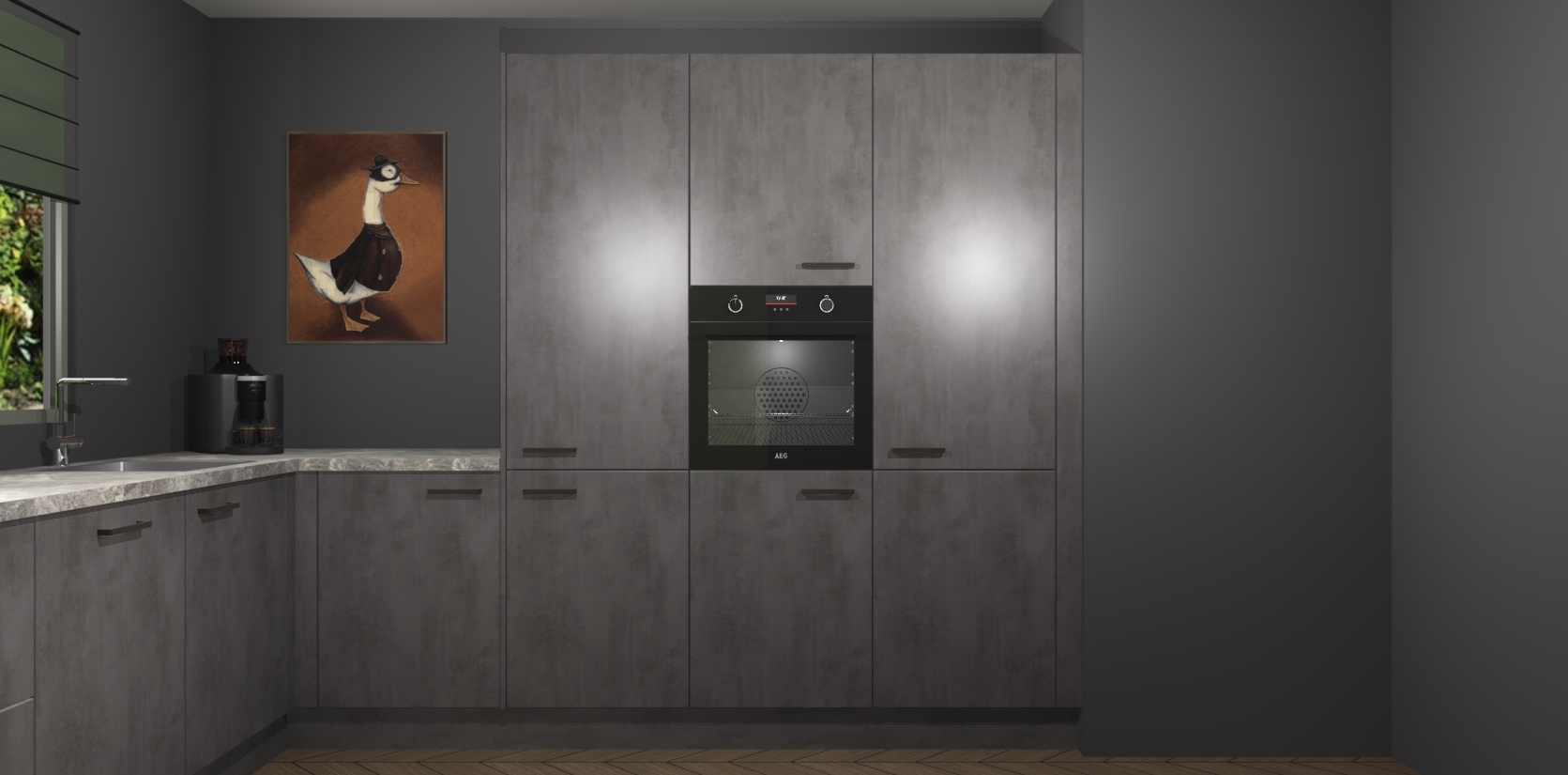 Welkom bij de Beton Antraciet keuken Laos. Deze prachtige keuken zal de komende jaren het middelpunt van de belangstelling in uw huis zijn. Uitgerust met vijf inbouwapparaten komt u nooit kookgereedschap tekort. Bovendien geeft de warme houtlook elke ruimte een uitnodigende en tijdloze uitstraling.