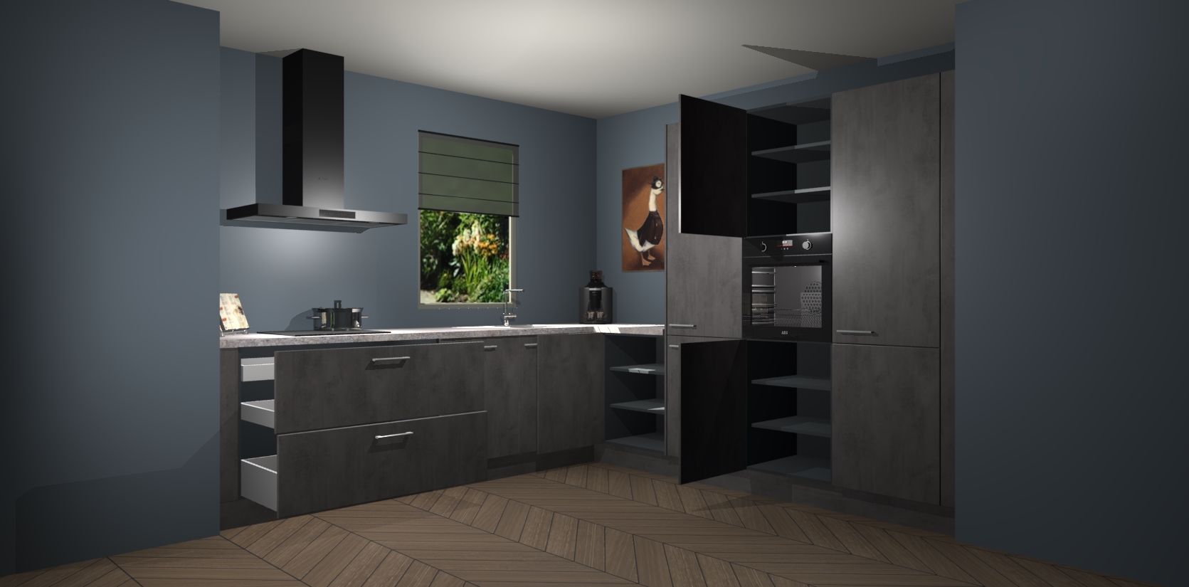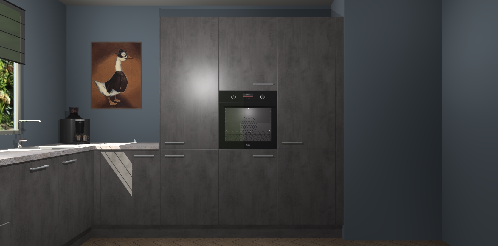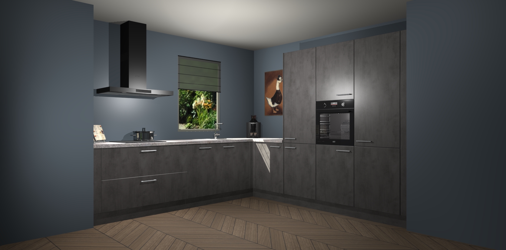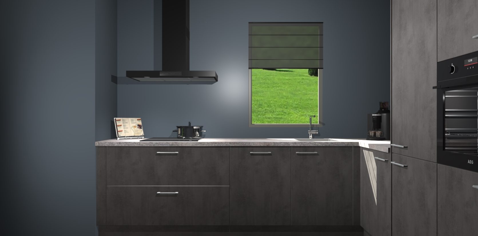 Welkom bij de Beton Antraciet keuken Laos. Deze prachtige keuken zal de komende jaren het middelpunt van de belangstelling in uw huis zijn. Uitgerust met vijf inbouwapparaten komt u nooit kookgereedschap tekort. Bovendien geeft de warme houtlook elke ruimte een uitnodigende en tijdloze uitstraling.