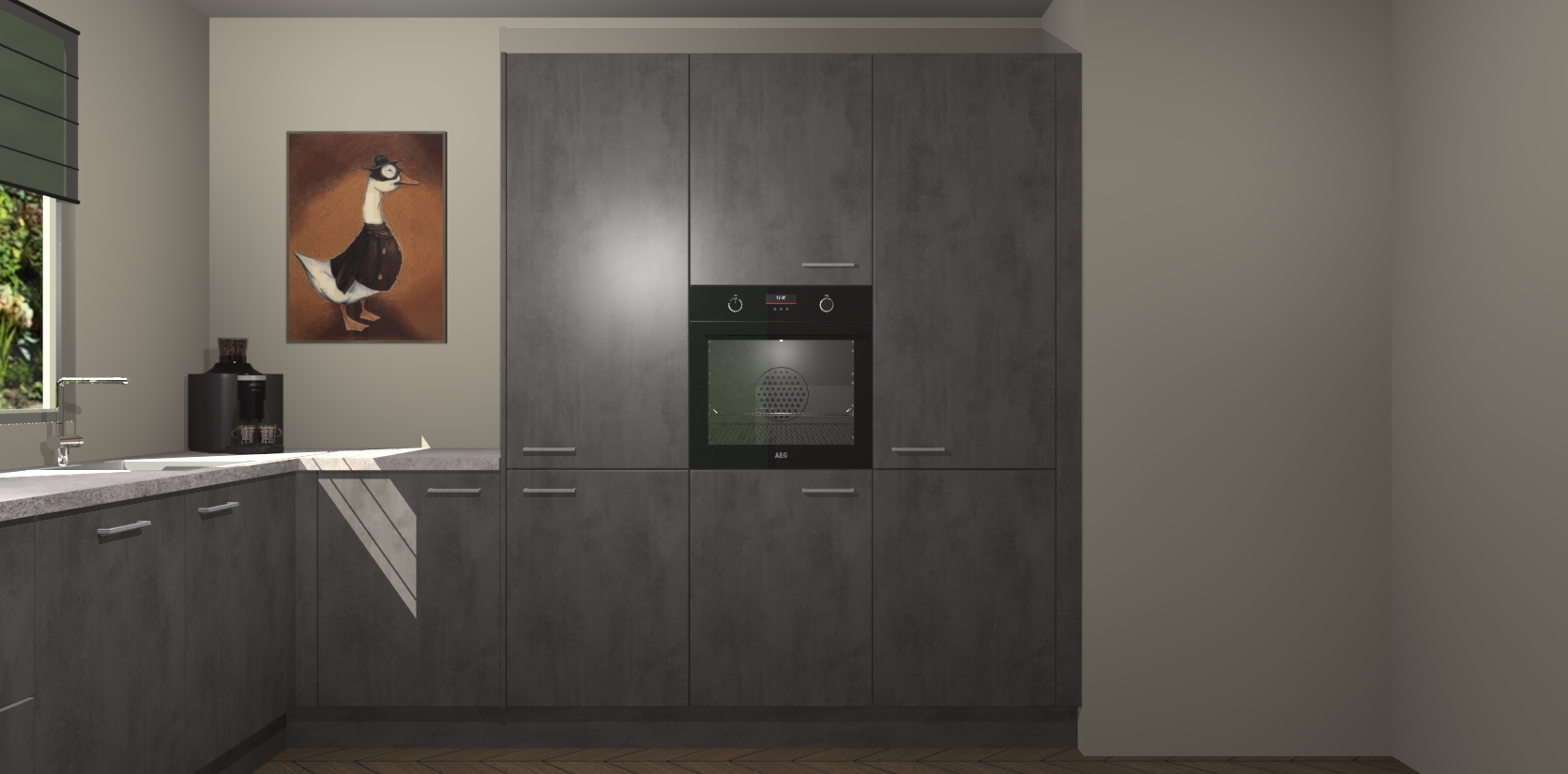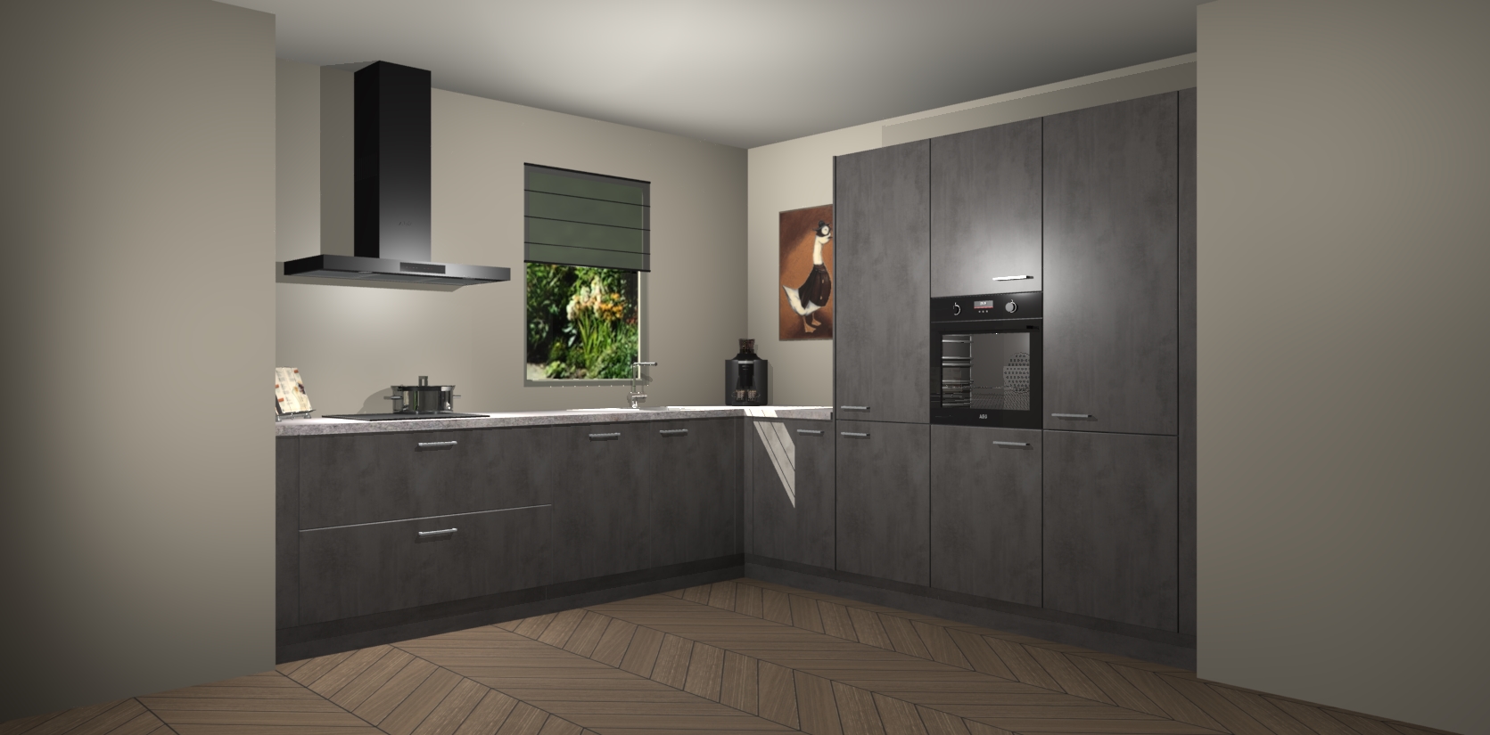 Welkom bij de Beton Antraciet keuken Laos. Deze prachtige keuken zal de komende jaren het middelpunt van de belangstelling in uw huis zijn. Uitgerust met vijf inbouwapparaten komt u nooit kookgereedschap tekort. Bovendien geeft de warme houtlook elke ruimte een uitnodigende en tijdloze uitstraling.