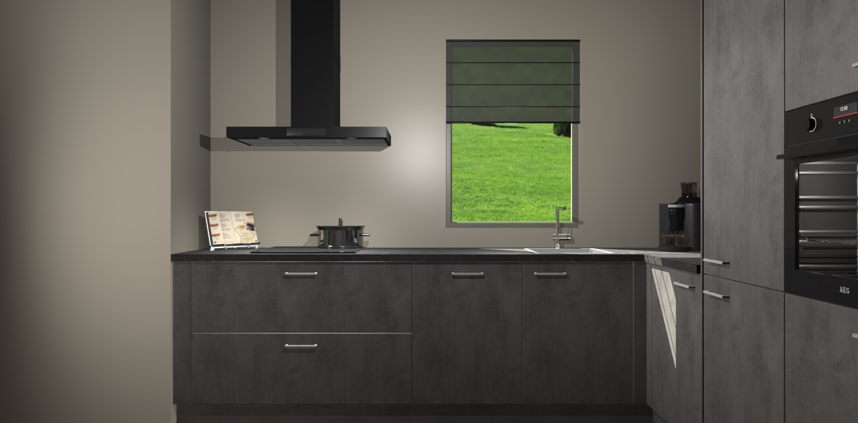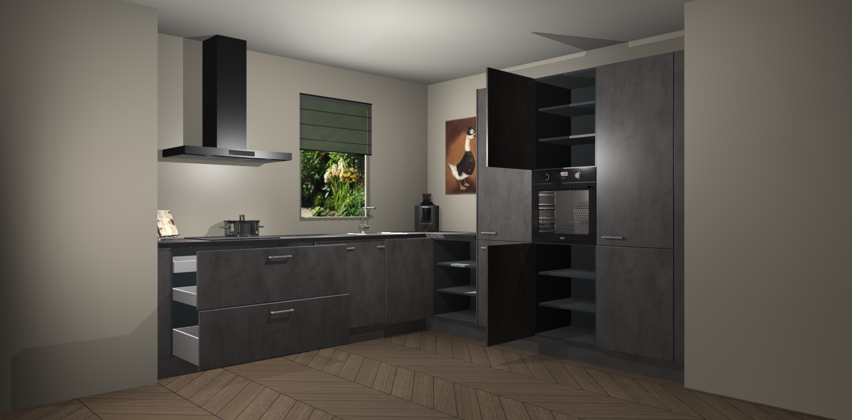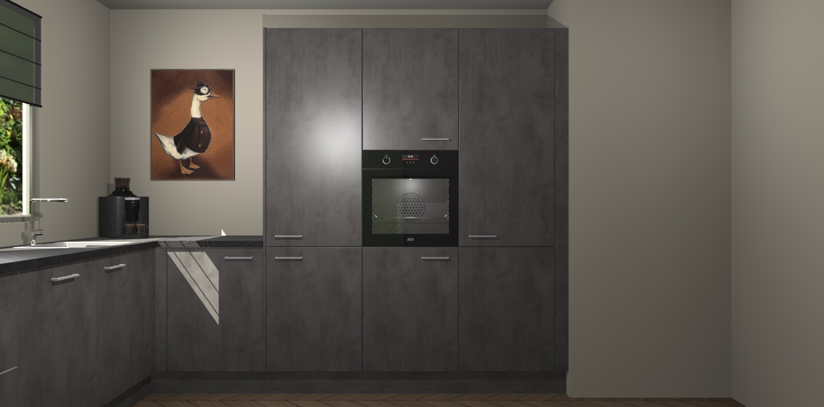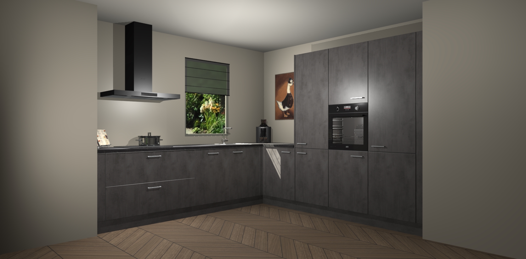 Welkom bij de Beton Antraciet keuken Laos. Deze prachtige keuken zal de komende jaren het middelpunt van de belangstelling in uw huis zijn. Uitgerust met vijf inbouwapparaten komt u nooit kookgereedschap tekort. Bovendien geeft de warme houtlook elke ruimte een uitnodigende en tijdloze uitstraling.