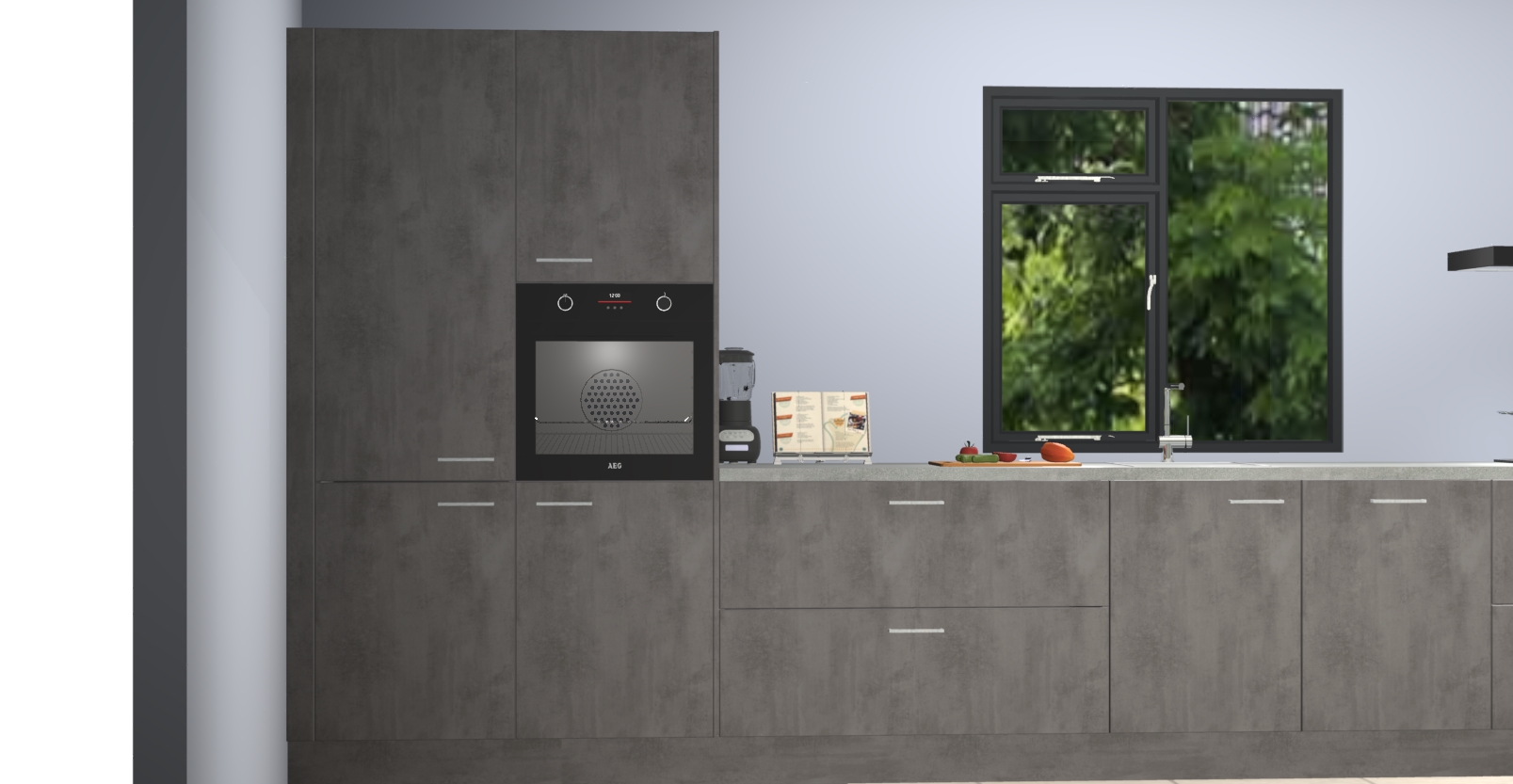 De Beton antraciet keuken Lille wordt geleverd met vijf inbouwapparaten - een oven, inductiekookplaat, afzuigkap, vaatwasser en koelkast. Maar dat is nog niet alles! Na bestelling kunnen deze apparaten eenvoudig worden geüpgraded naar premium AEG-apparatuur. Bovendien is er zelfs de optie om de oven te vervangen door een combimagnetron of uw inductiekookplaat te vervangen door een kookplaat met geïntegreerde afzuiging.
