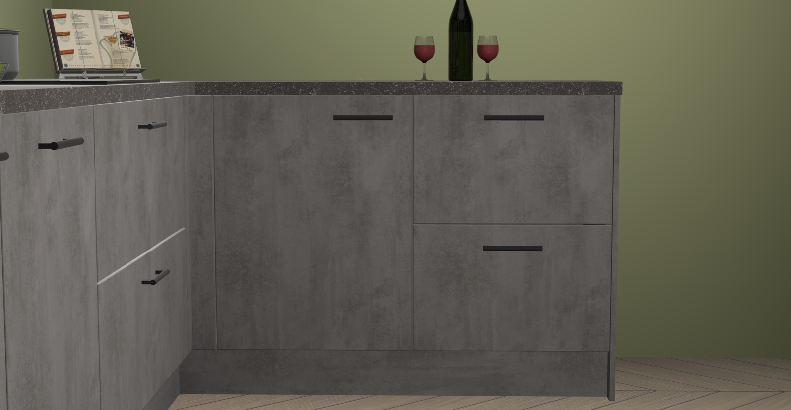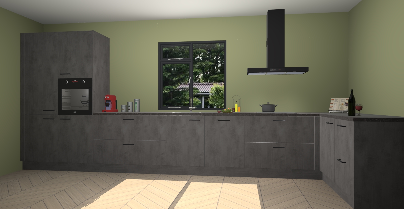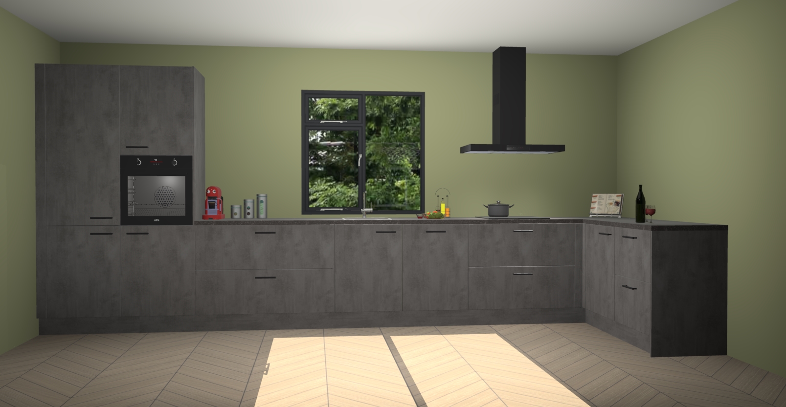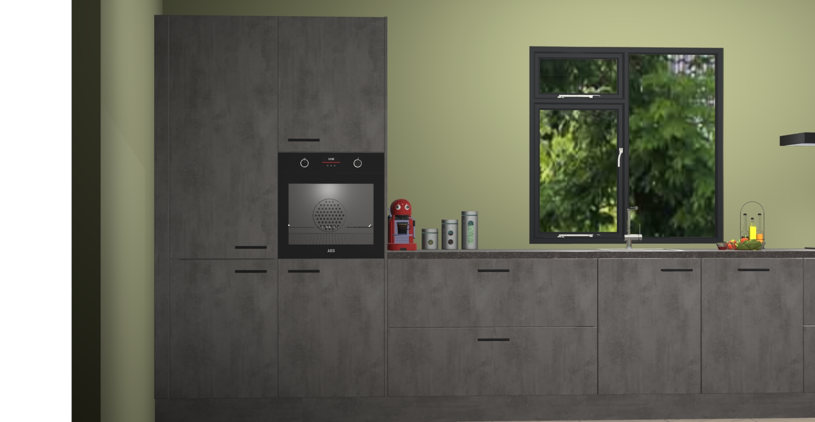 De Beton antraciet keuken Lille wordt geleverd met vijf inbouwapparaten - een oven, inductiekookplaat, afzuigkap, vaatwasser en koelkast. Maar dat is nog niet alles! Na bestelling kunnen deze apparaten eenvoudig worden geüpgraded naar premium AEG-apparatuur. Bovendien is er zelfs de optie om de oven te vervangen door een combimagnetron of uw inductiekookplaat te vervangen door een kookplaat met geïntegreerde afzuiging.