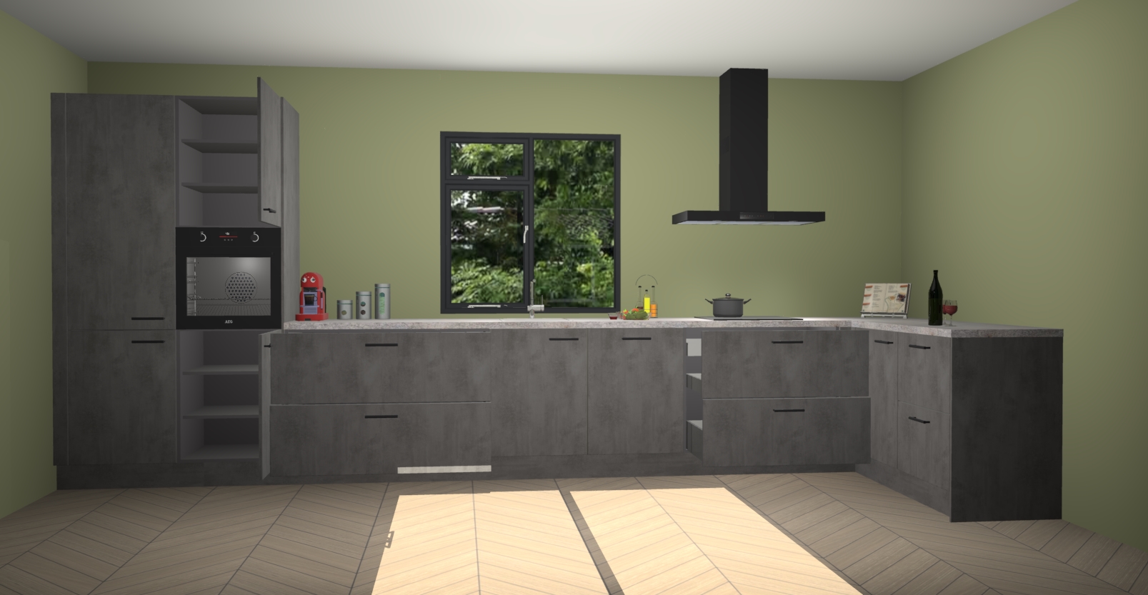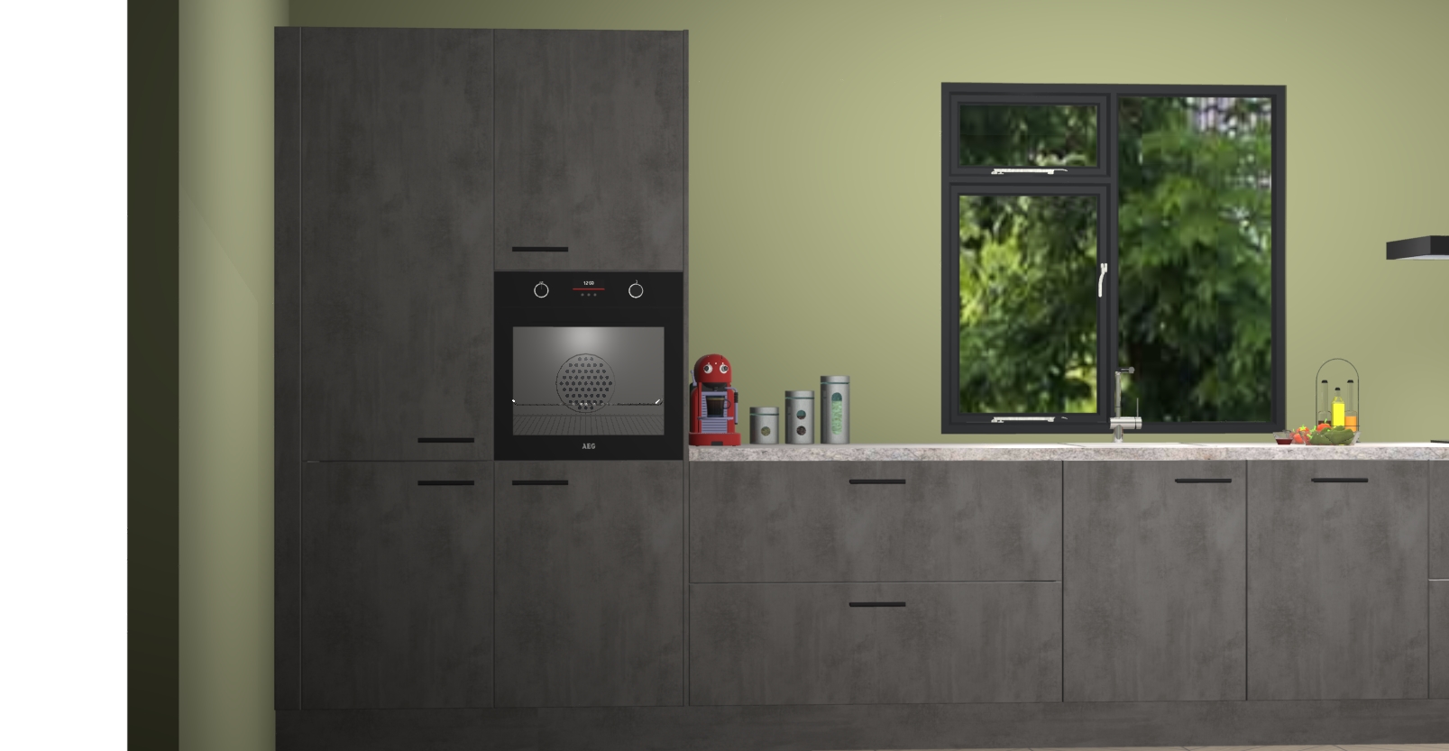 De Beton antraciet keuken Lille wordt geleverd met vijf inbouwapparaten - een oven, inductiekookplaat, afzuigkap, vaatwasser en koelkast. Maar dat is nog niet alles! Na bestelling kunnen deze apparaten eenvoudig worden geüpgraded naar premium AEG-apparatuur. Bovendien is er zelfs de optie om de oven te vervangen door een combimagnetron of uw inductiekookplaat te vervangen door een kookplaat met geïntegreerde afzuiging.