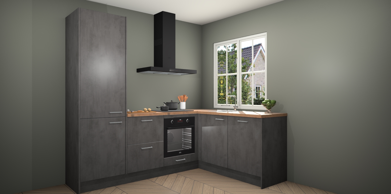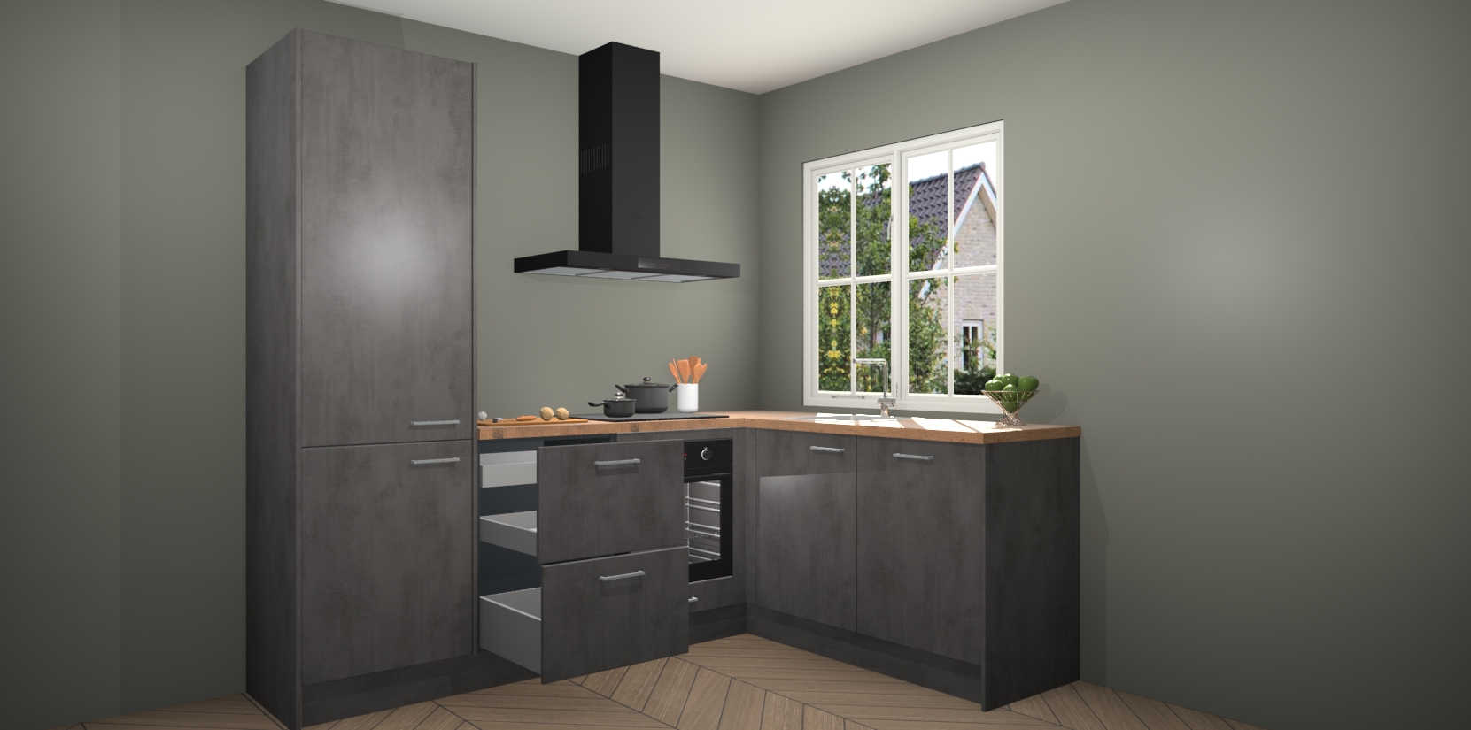De Beton Antraciet keuken Linz is de perfecte keuze voor uw nieuwe moderne en tijdloze keuken. Ga voor moderne en tijdloze elegantie in uw keuken. De prachtige hoekkeuken biedt een verfrissende kijk op de manier waarop we ons vertrouwde keukenontwerp kunnen aanpassen in een nieuwe stijl. Één blik om alles te zien: zo mooi dat het bijna magisch lijkt.