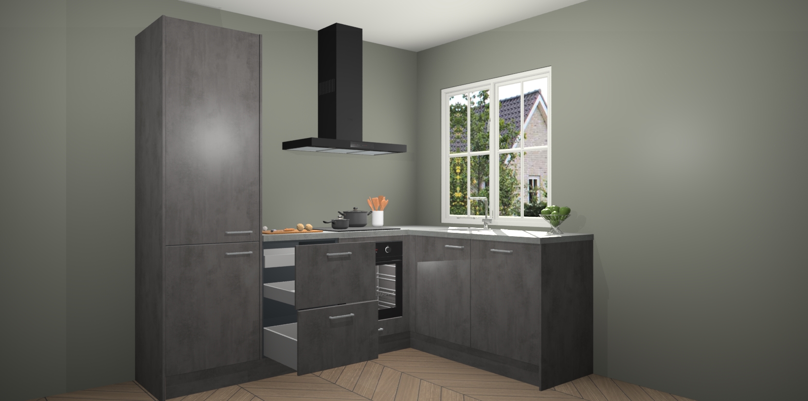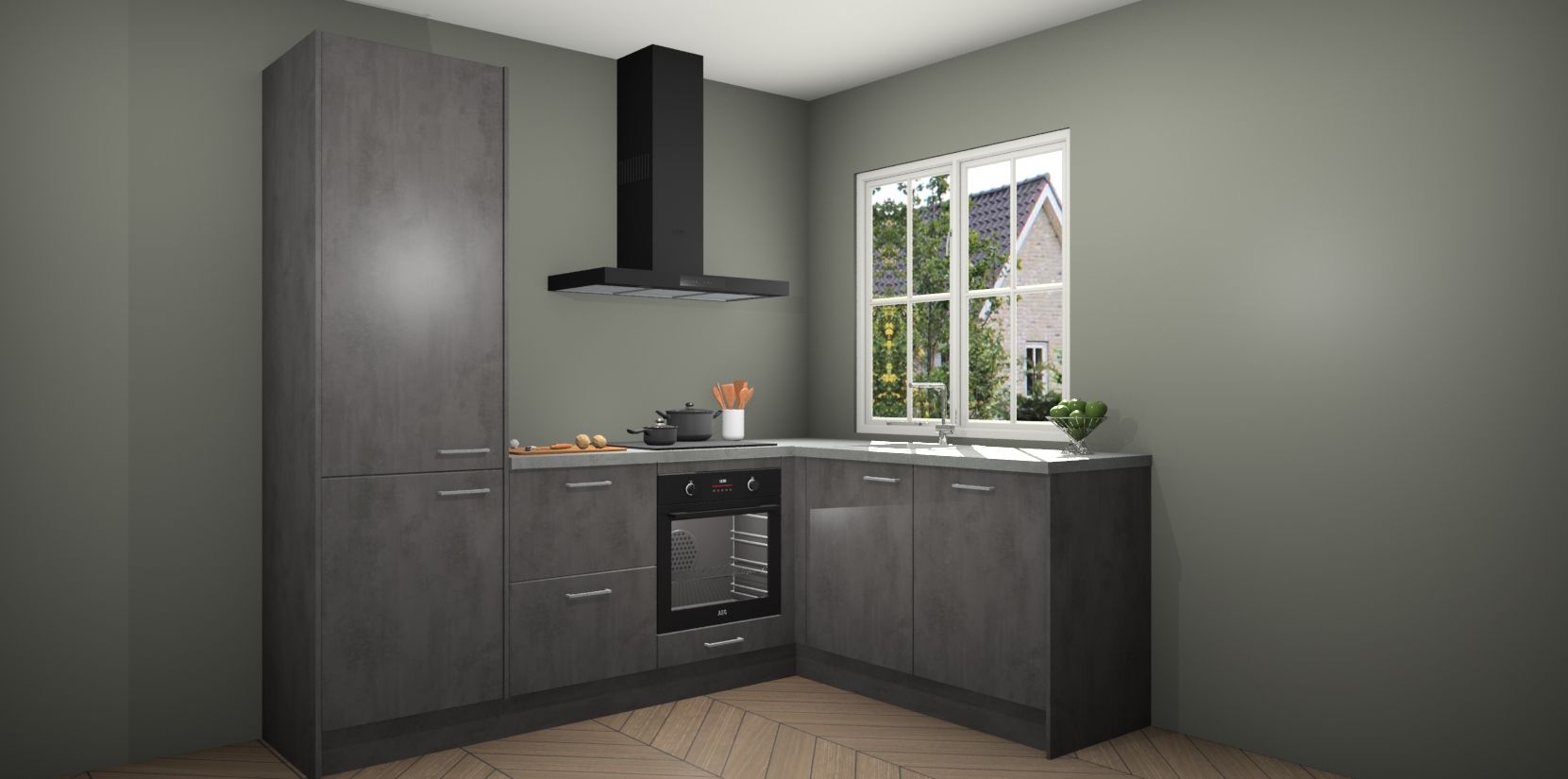 De Beton Antraciet keuken Linz is de perfecte keuze voor uw nieuwe moderne en tijdloze keuken. Ga voor moderne en tijdloze elegantie in uw keuken. De prachtige hoekkeuken biedt een verfrissende kijk op de manier waarop we ons vertrouwde keukenontwerp kunnen aanpassen in een nieuwe stijl. Één blik om alles te zien: zo mooi dat het bijna magisch lijkt.