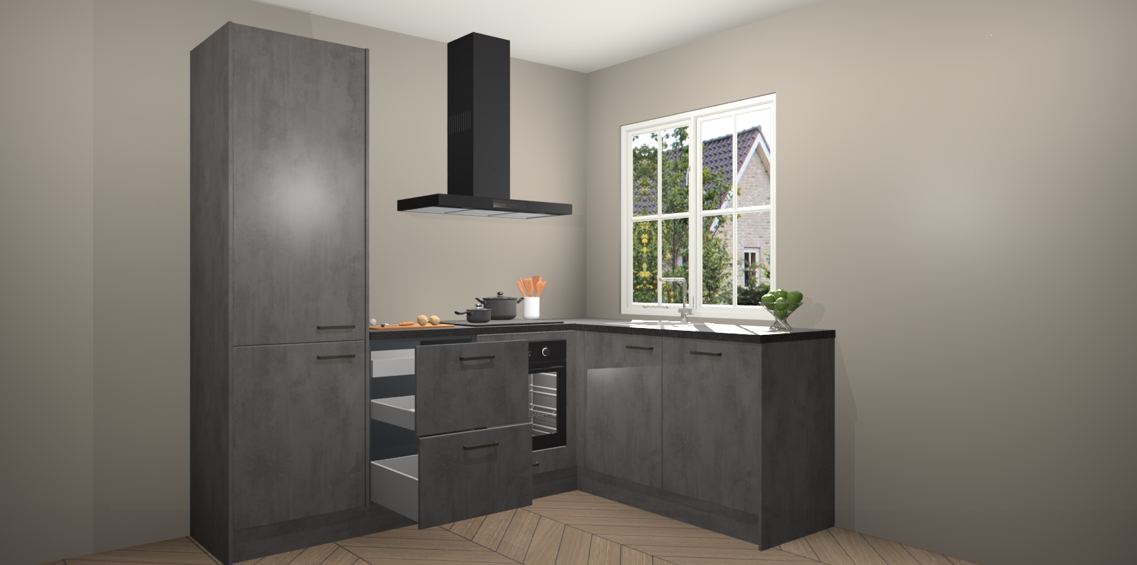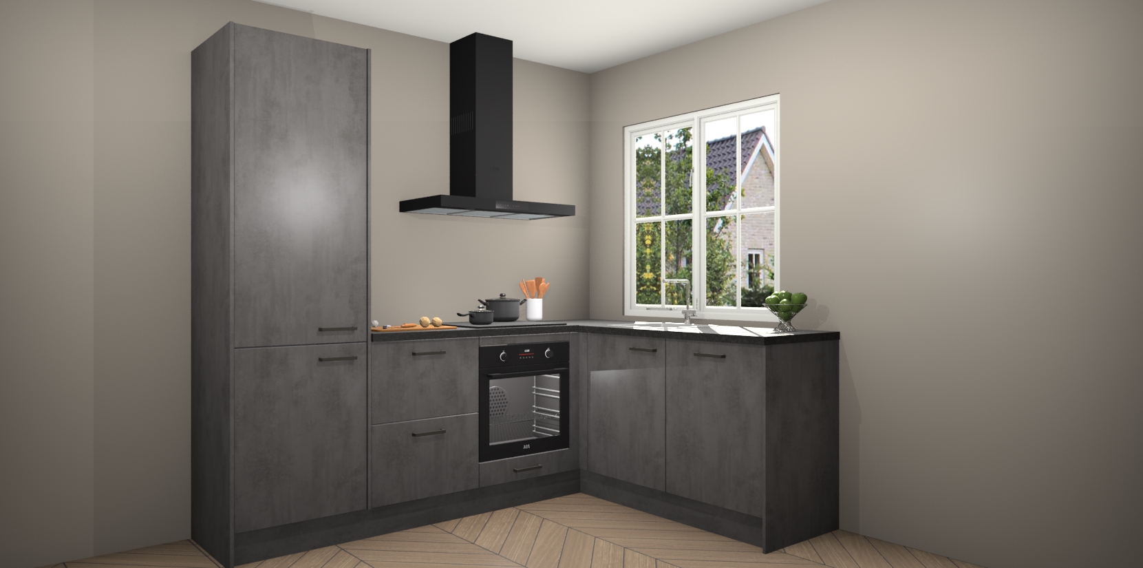 De Beton Antraciet keuken Linz is de perfecte keuze voor uw nieuwe moderne en tijdloze keuken. Ga voor moderne en tijdloze elegantie in uw keuken. De prachtige hoekkeuken biedt een verfrissende kijk op de manier waarop we ons vertrouwde keukenontwerp kunnen aanpassen in een nieuwe stijl. Één blik om alles te zien: zo mooi dat het bijna magisch lijkt.