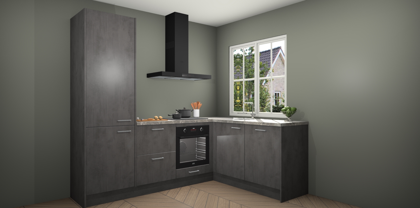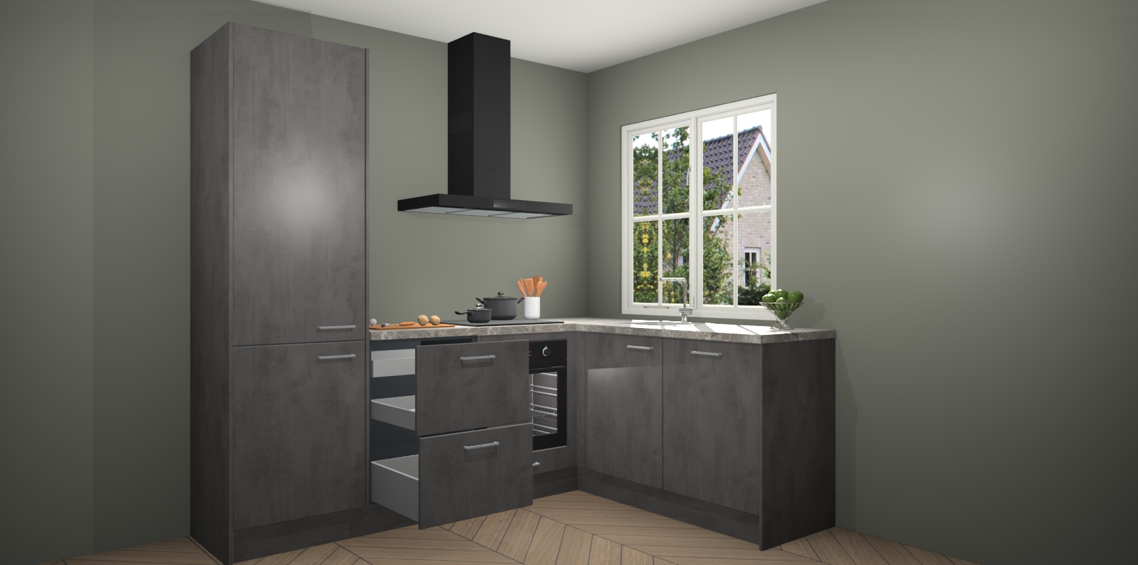 De Beton Antraciet keuken Linz is de perfecte keuze voor uw nieuwe moderne en tijdloze keuken. Ga voor moderne en tijdloze elegantie in uw keuken. De prachtige hoekkeuken biedt een verfrissende kijk op de manier waarop we ons vertrouwde keukenontwerp kunnen aanpassen in een nieuwe stijl. Één blik om alles te zien: zo mooi dat het bijna magisch lijkt.