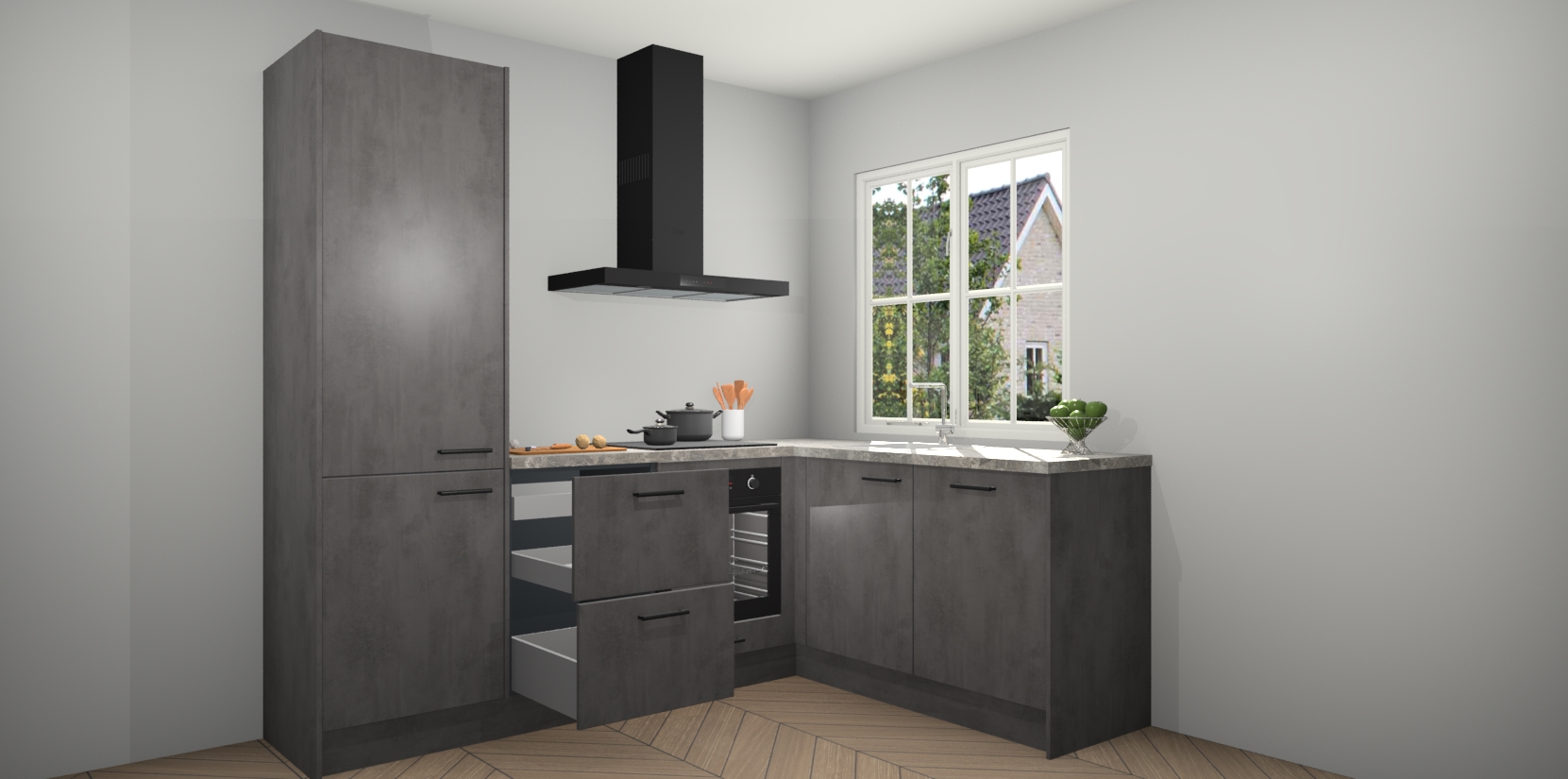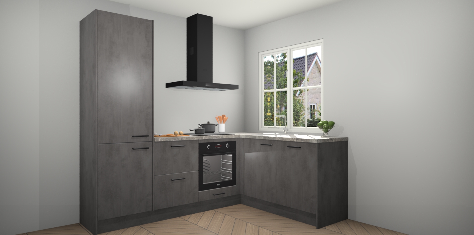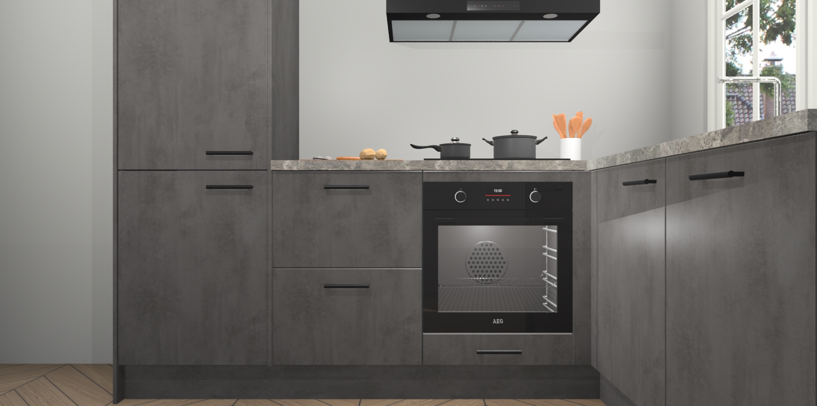 De Beton Antraciet keuken Linz is de perfecte keuze voor uw nieuwe moderne en tijdloze keuken. Ga voor moderne en tijdloze elegantie in uw keuken. De prachtige hoekkeuken biedt een verfrissende kijk op de manier waarop we ons vertrouwde keukenontwerp kunnen aanpassen in een nieuwe stijl. Één blik om alles te zien: zo mooi dat het bijna magisch lijkt.