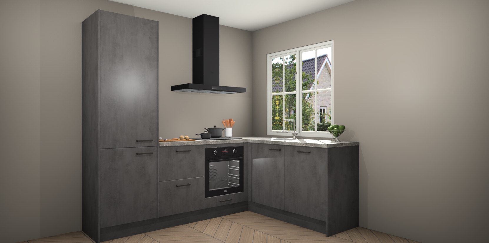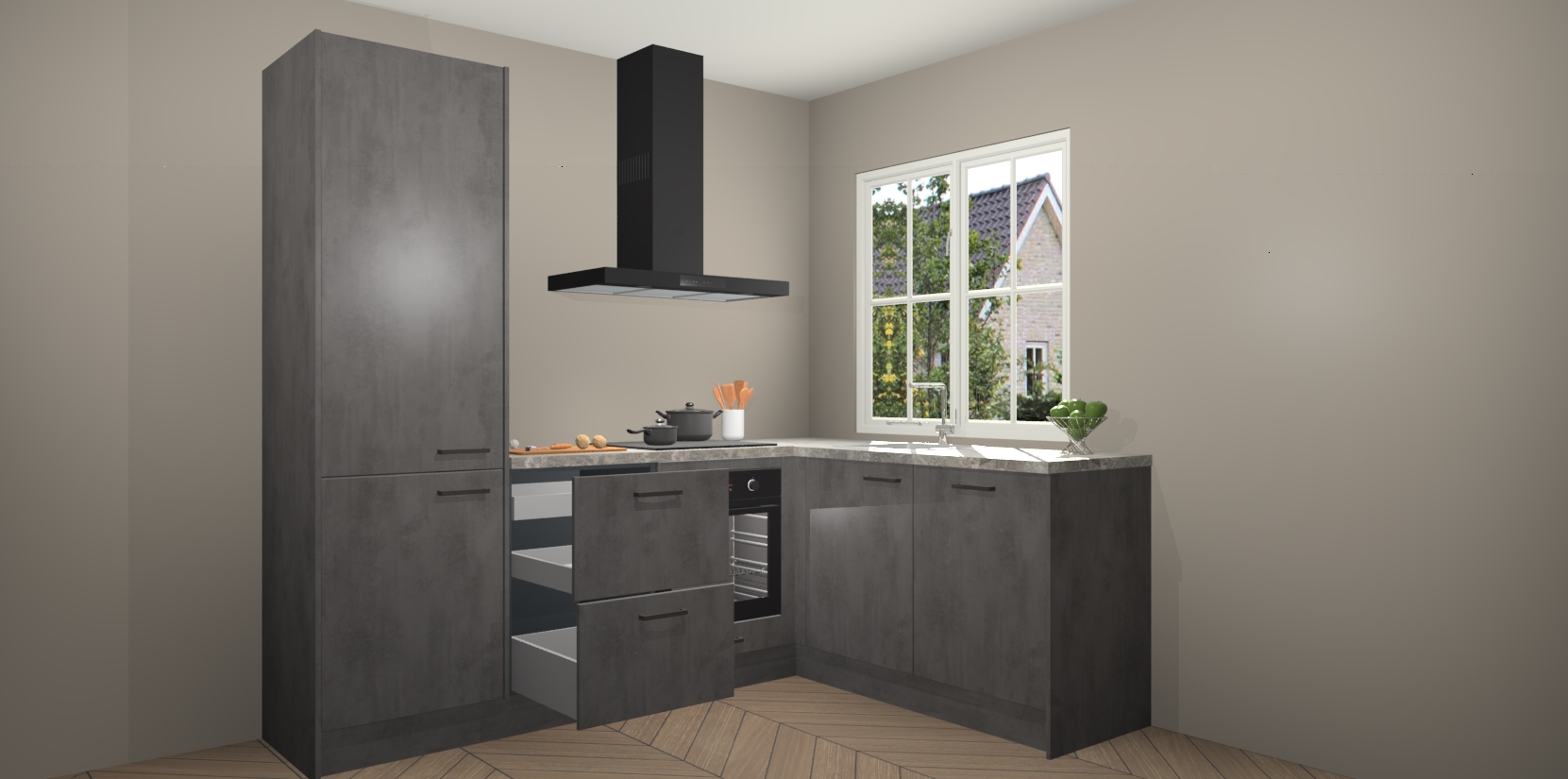 De Beton Antraciet keuken Linz is de perfecte keuze voor uw nieuwe moderne en tijdloze keuken. Ga voor moderne en tijdloze elegantie in uw keuken. De prachtige hoekkeuken biedt een verfrissende kijk op de manier waarop we ons vertrouwde keukenontwerp kunnen aanpassen in een nieuwe stijl. Één blik om alles te zien: zo mooi dat het bijna magisch lijkt.