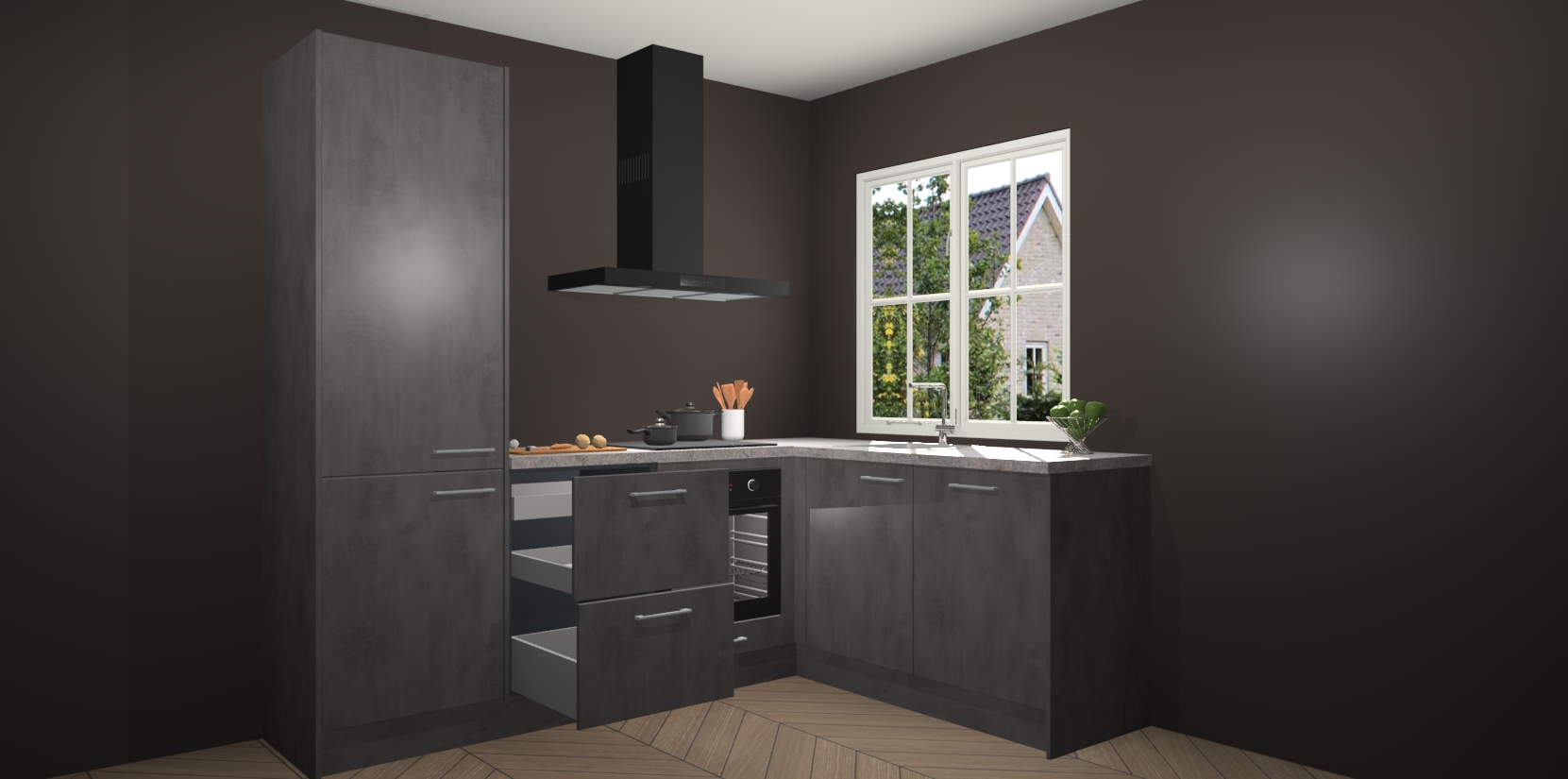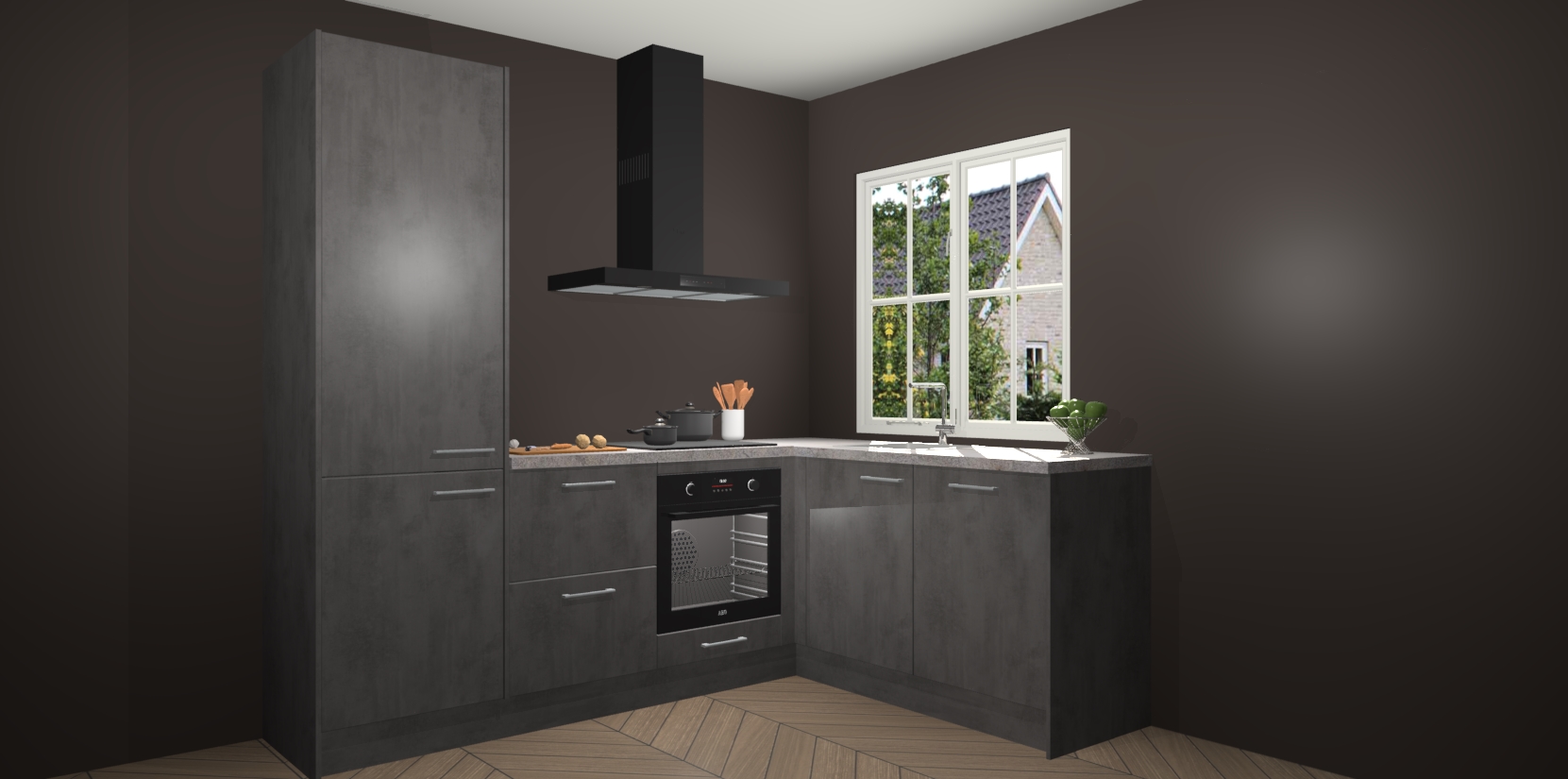 De Beton Antraciet keuken Linz is de perfecte keuze voor uw nieuwe moderne en tijdloze keuken. Ga voor moderne en tijdloze elegantie in uw keuken. De prachtige hoekkeuken biedt een verfrissende kijk op de manier waarop we ons vertrouwde keukenontwerp kunnen aanpassen in een nieuwe stijl.  Één blik om alles te zien: zo mooi dat het bijna magisch lijkt.