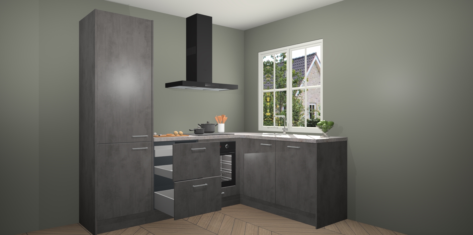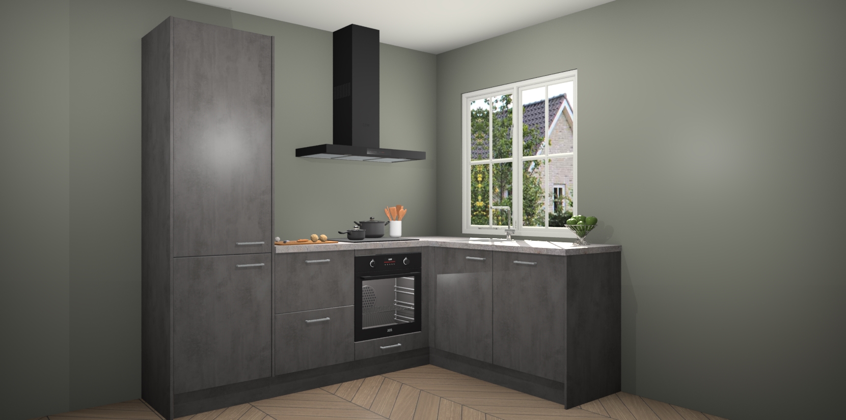 De Beton Antraciet keuken Linz is de perfecte keuze voor uw nieuwe moderne en tijdloze keuken. Ga voor moderne en tijdloze elegantie in uw keuken. De prachtige hoekkeuken biedt een verfrissende kijk op de manier waarop we ons vertrouwde keukenontwerp kunnen aanpassen in een nieuwe stijl. Één blik om alles te zien: zo mooi dat het bijna magisch lijkt.