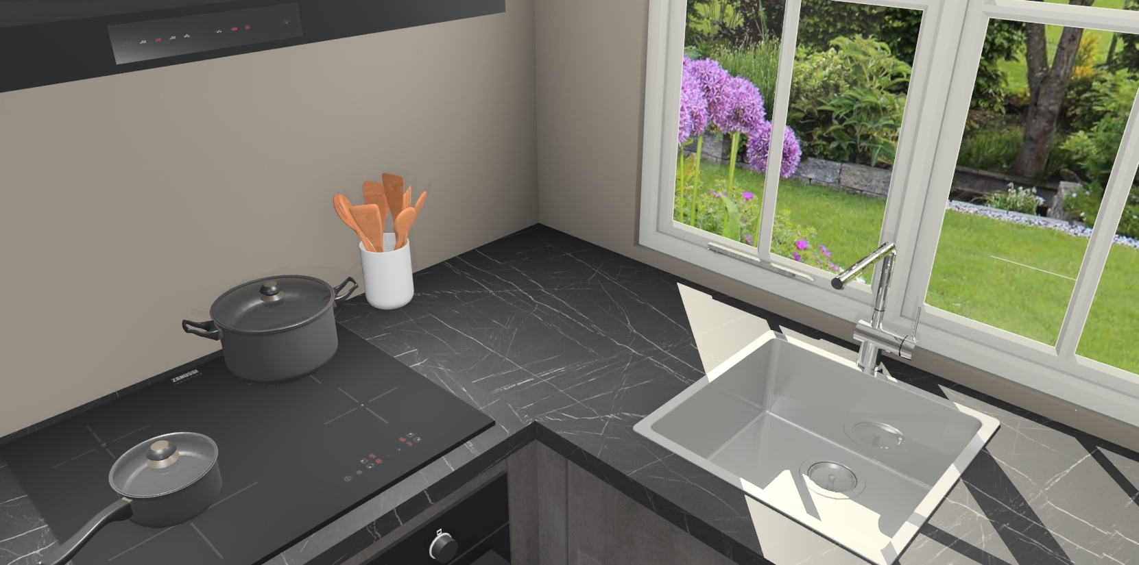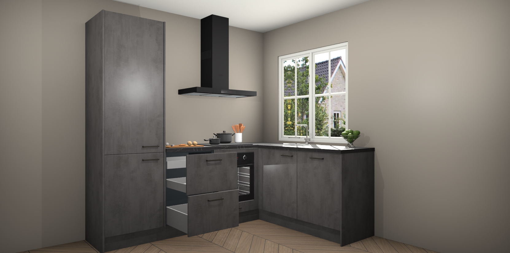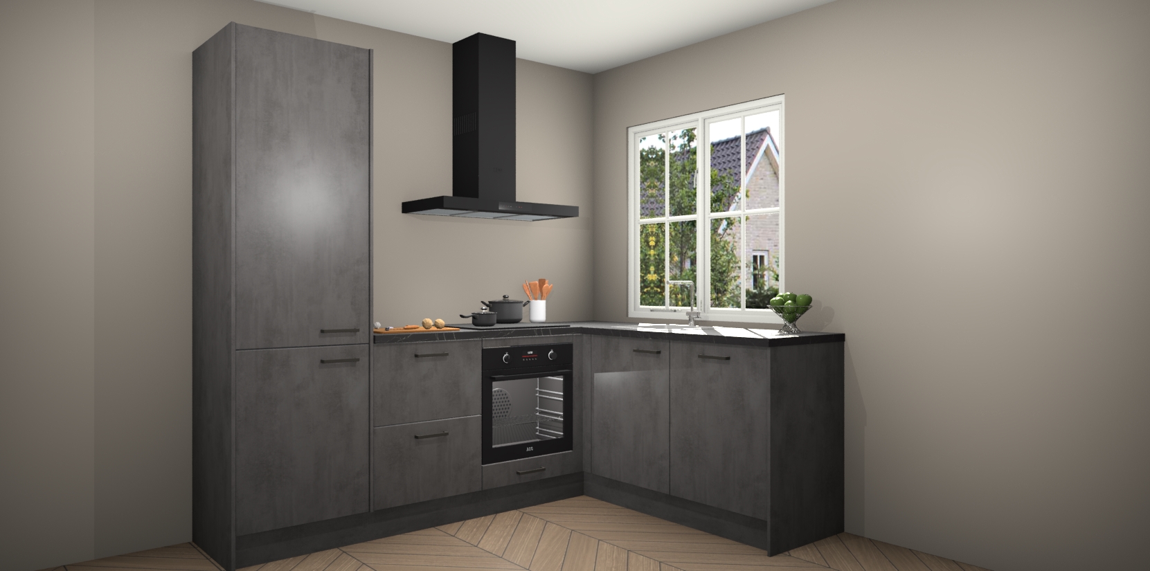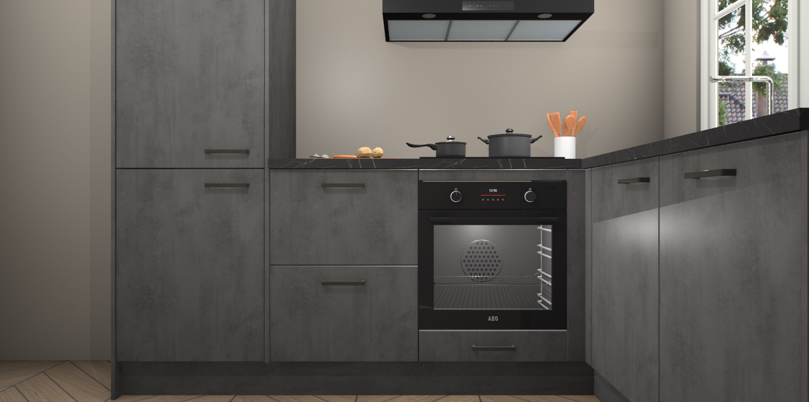 De Beton Antraciet keuken Linz is de perfecte keuze voor uw nieuwe moderne en tijdloze keuken. Ga voor moderne en tijdloze elegantie in uw keuken. De prachtige hoekkeuken biedt een verfrissende kijk op de manier waarop we ons vertrouwde keukenontwerp kunnen aanpassen in een nieuwe stijl. Één blik om alles te zien: zo mooi dat het bijna magisch lijkt.