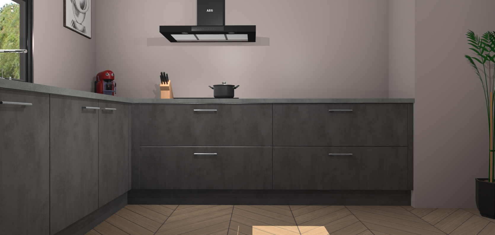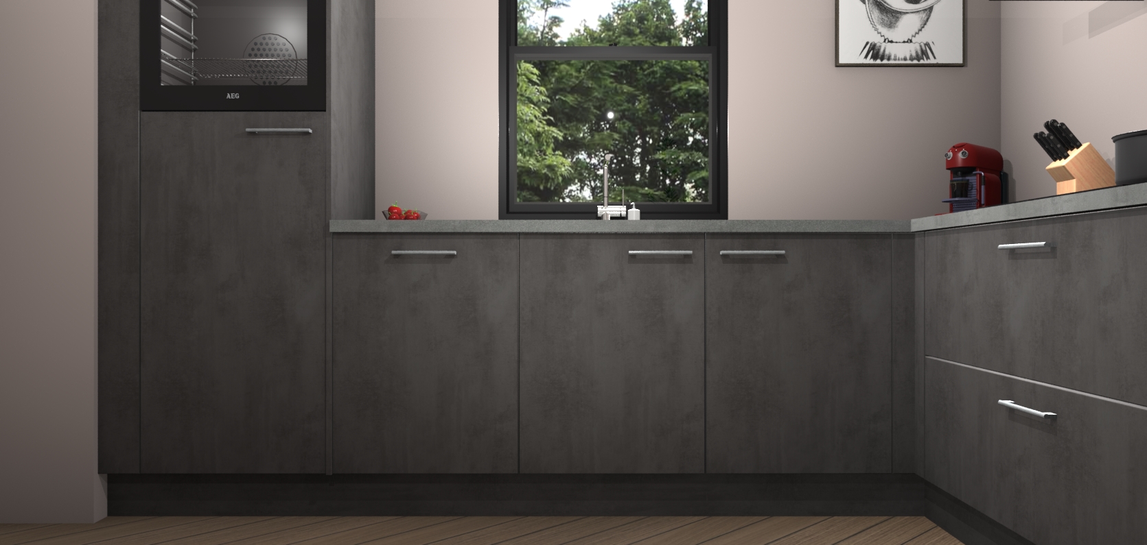 Welkom bij de Beton antraciet keuken Lublin. Deze prachtige keuken zal de komende jaren het middelpunt van de belangstelling in uw huis zijn. Uitgerust met vijf inbouwapparaten komt u nooit kookgereedschap tekort. Bovendien geeft de warme houtlook elke ruimte een uitnodigende en tijdloze uitstraling.