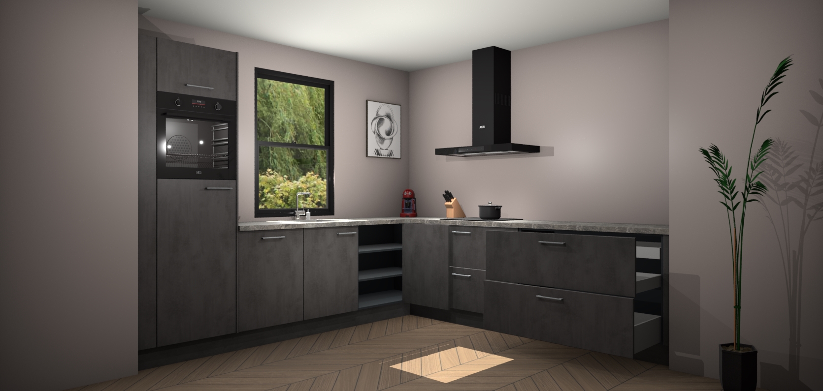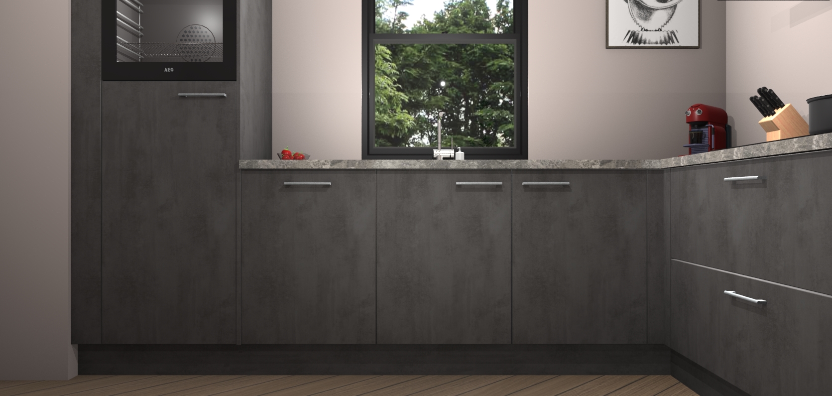 Welkom bij de Beton antraciet keuken Lublin. Deze prachtige keuken zal de komende jaren het middelpunt van de belangstelling in uw huis zijn. Uitgerust met vijf inbouwapparaten komt u nooit kookgereedschap tekort. Bovendien geeft de warme houtlook elke ruimte een uitnodigende en tijdloze uitstraling.