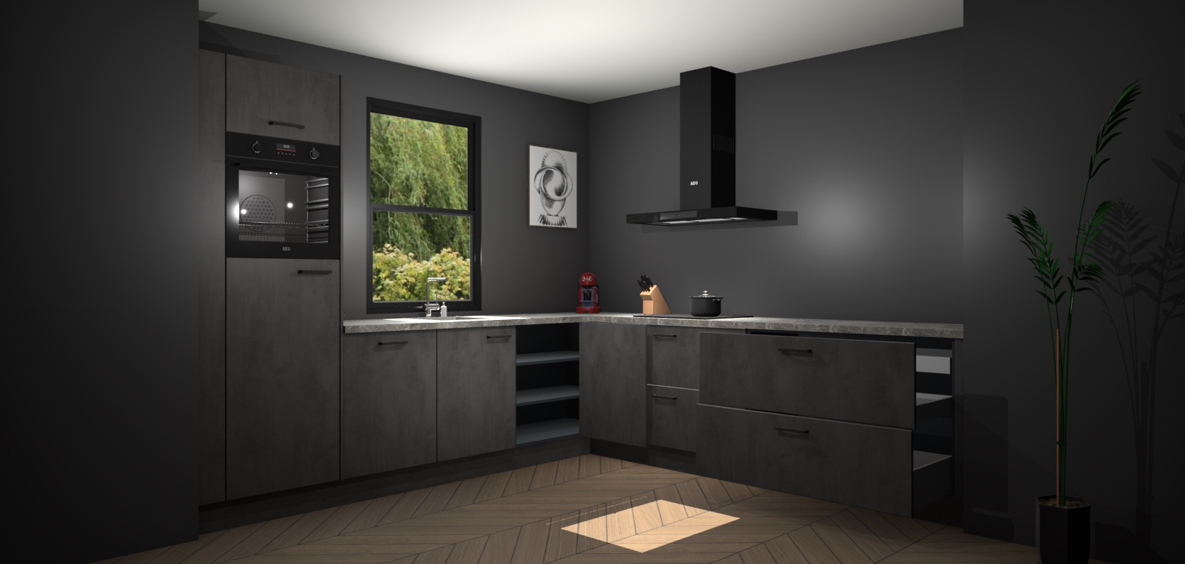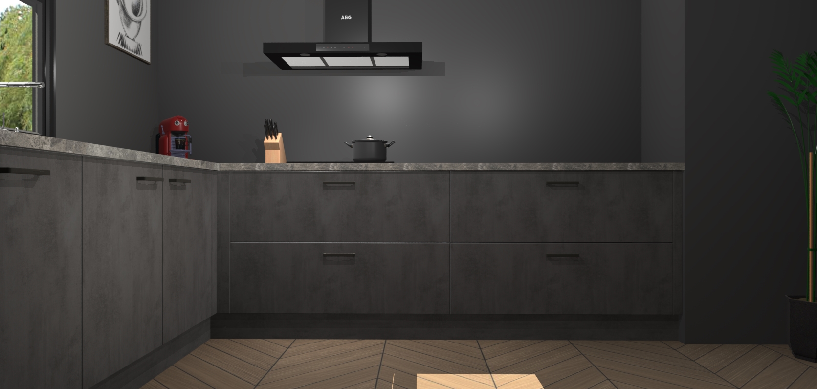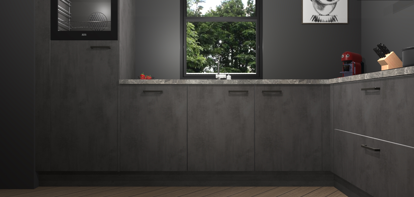 Welkom bij de Beton antraciet keuken Lublin. Deze prachtige keuken zal de komende jaren het middelpunt van de belangstelling in uw huis zijn. Uitgerust met vijf inbouwapparaten komt u nooit kookgereedschap tekort. Bovendien geeft de warme houtlook elke ruimte een uitnodigende en tijdloze uitstraling.