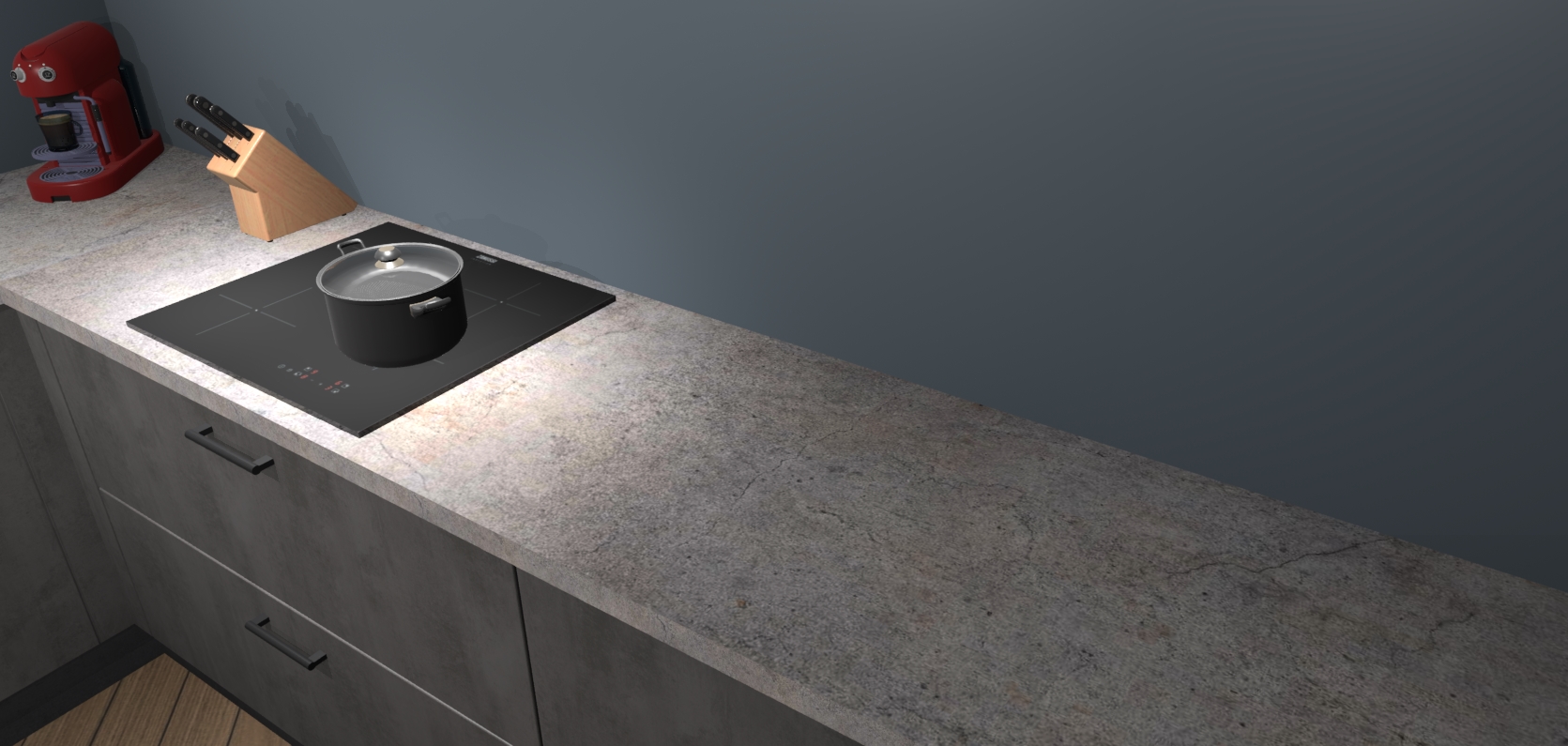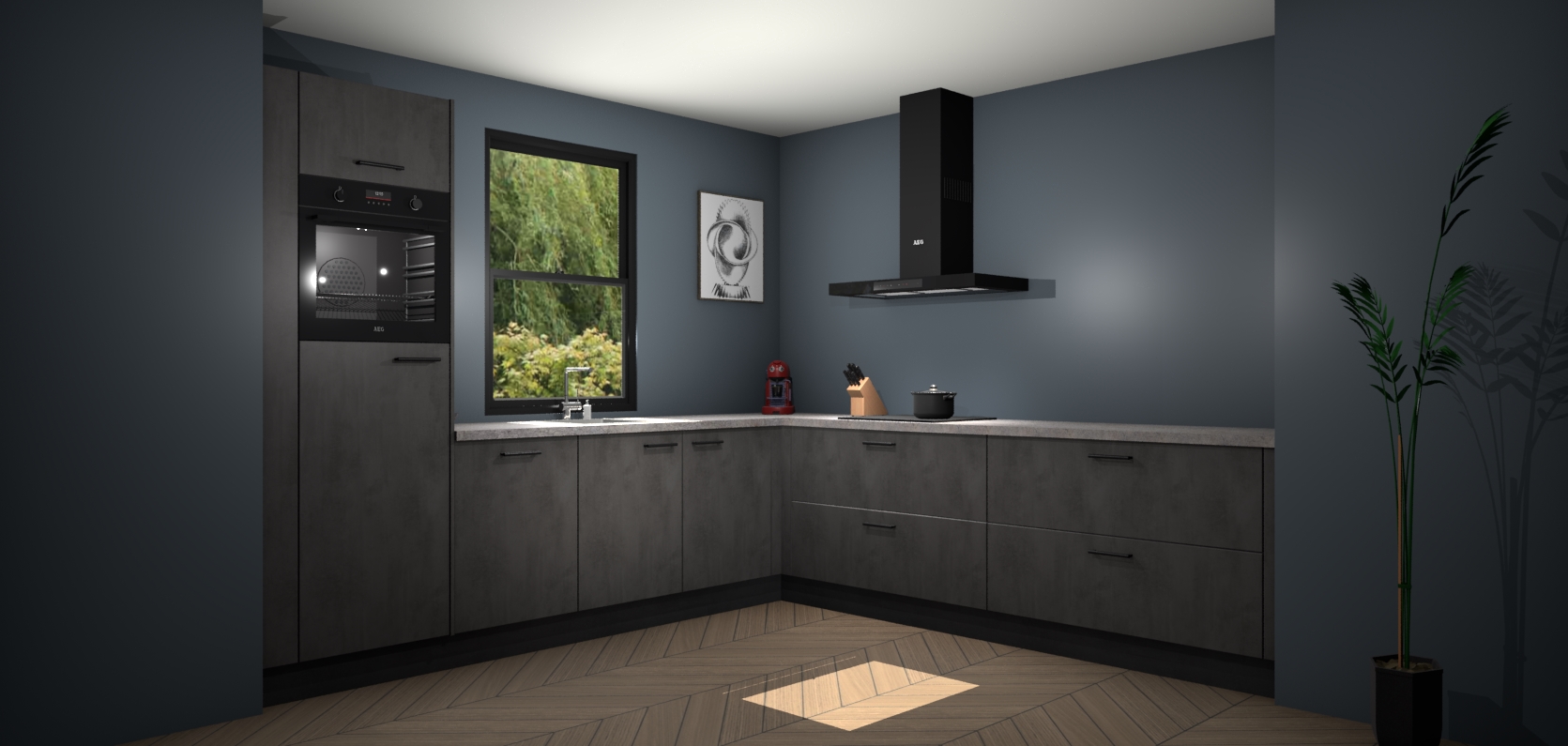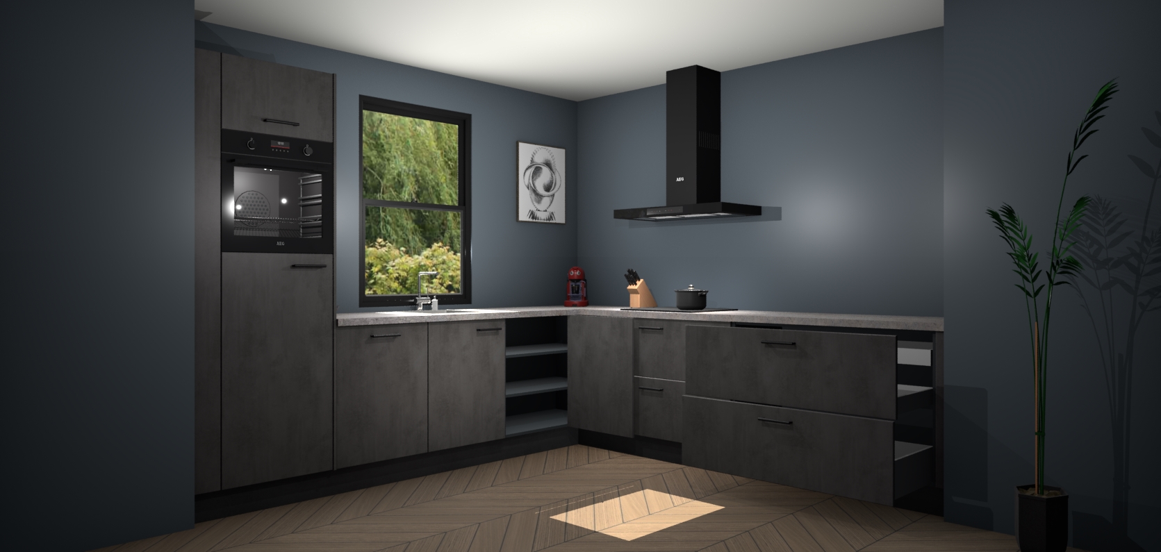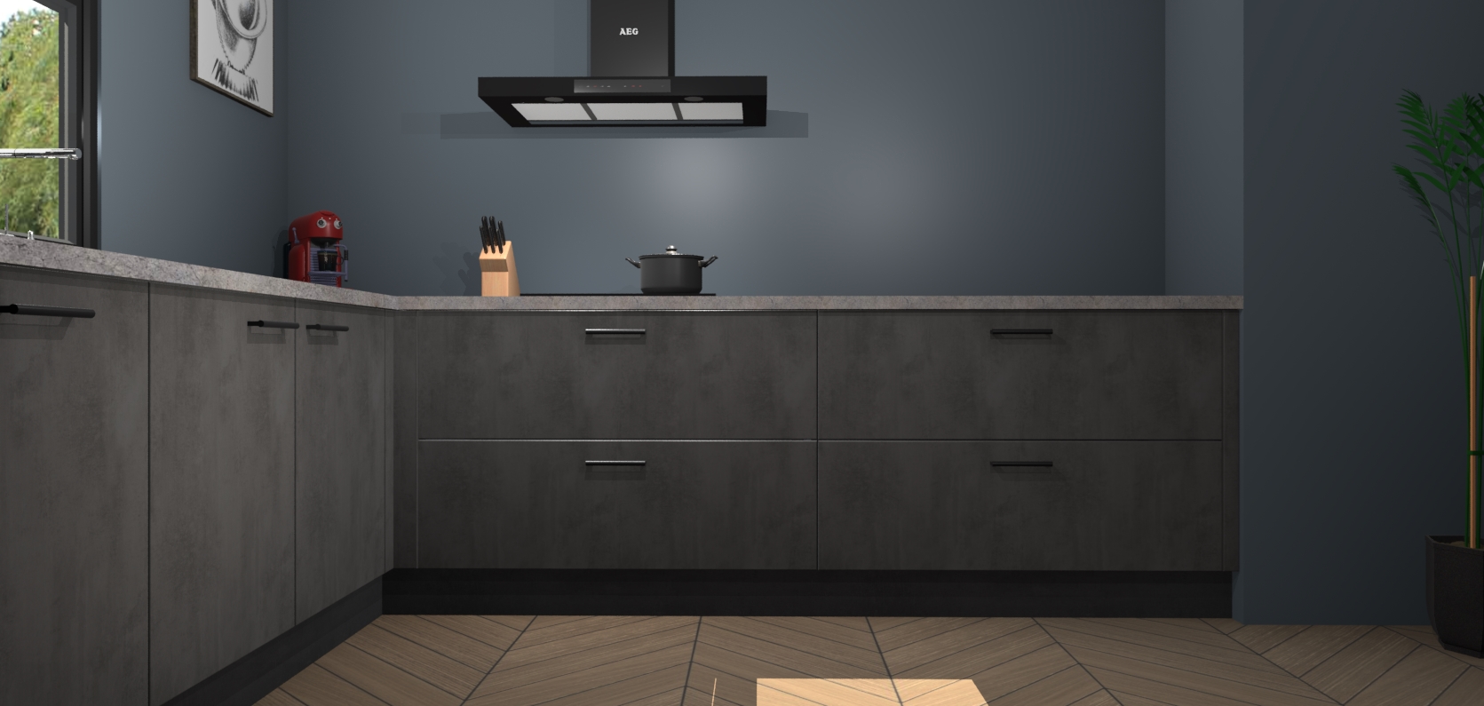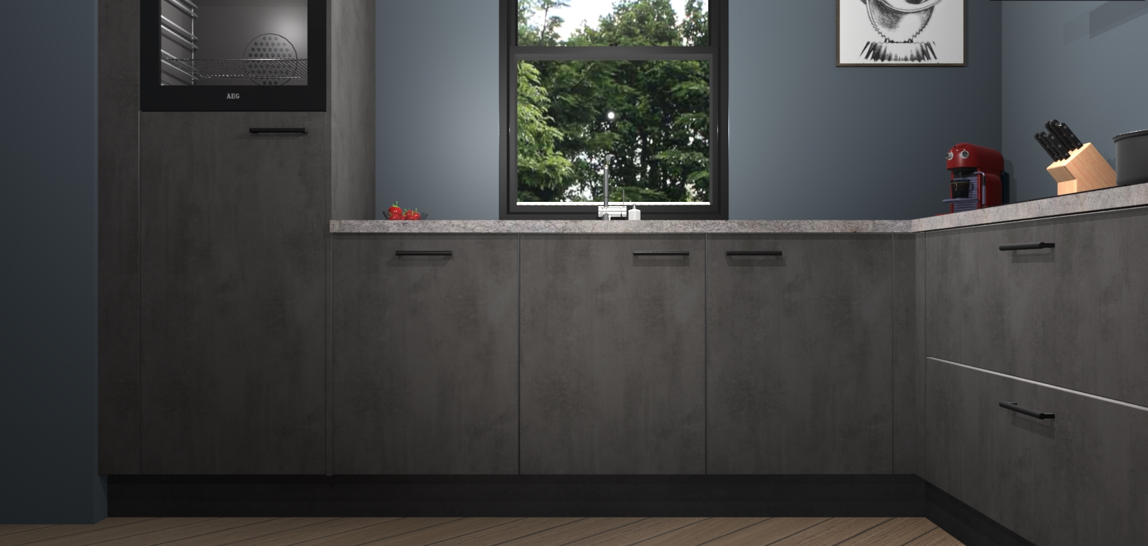 Welkom bij de Beton antraciet keuken Lublin. Deze prachtige keuken zal de komende jaren het middelpunt van de belangstelling in uw huis zijn. Uitgerust met vijf inbouwapparaten komt u nooit kookgereedschap tekort. Bovendien geeft de warme houtlook elke ruimte een uitnodigende en tijdloze uitstraling.