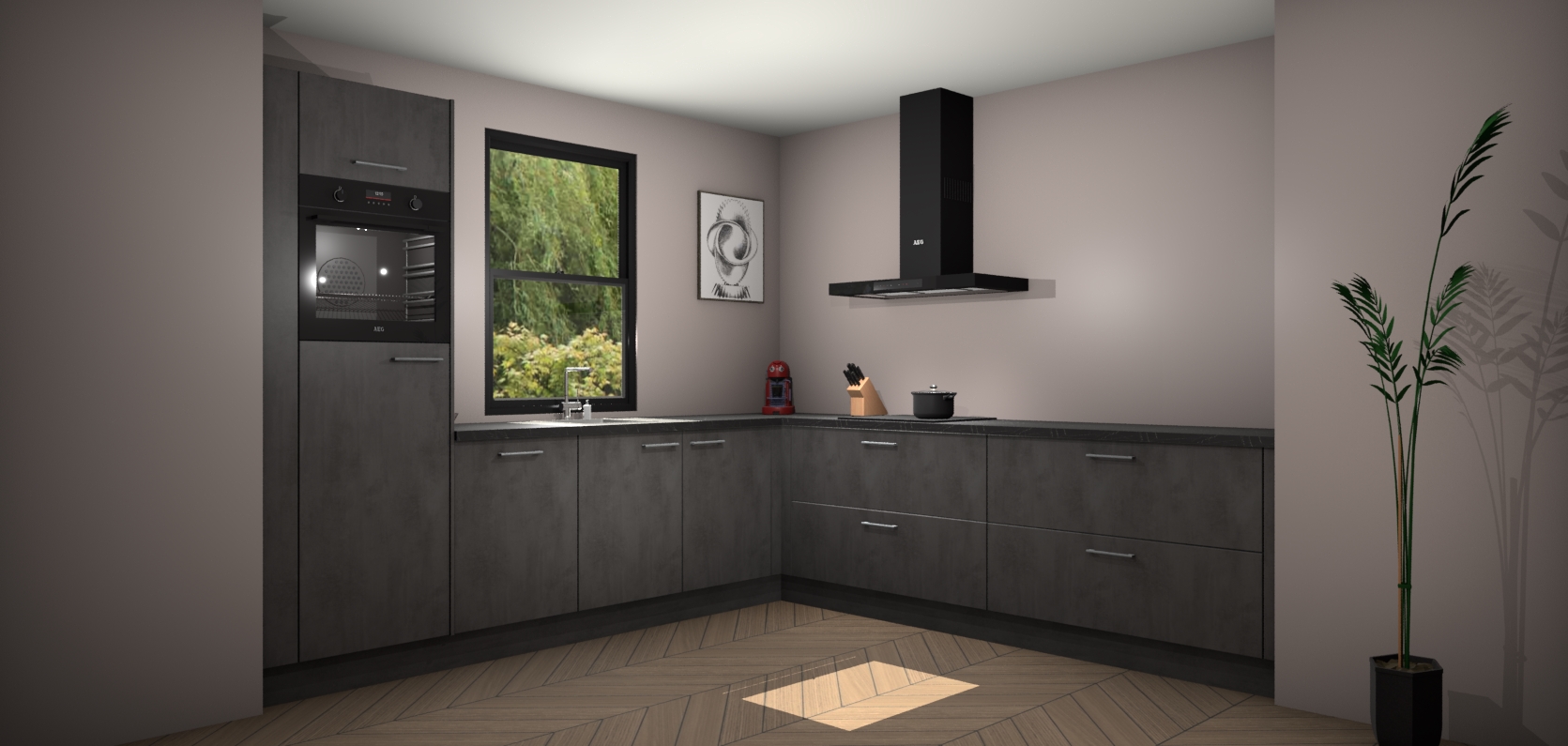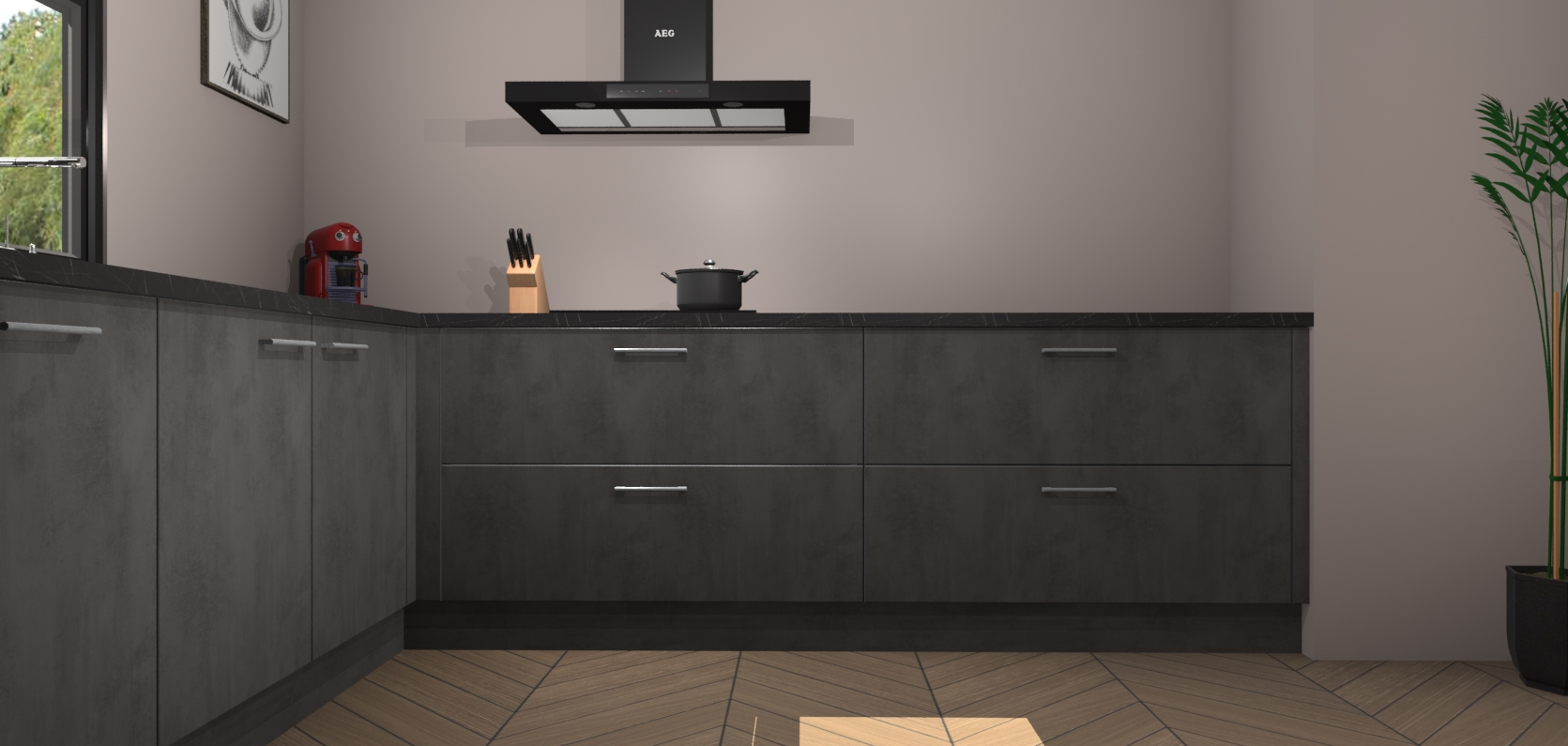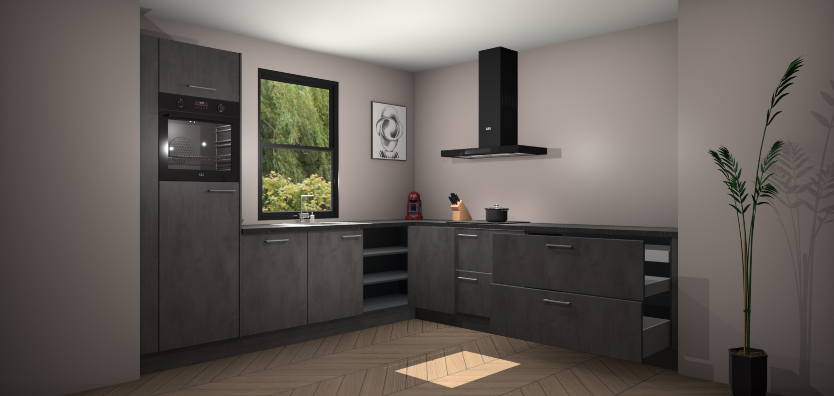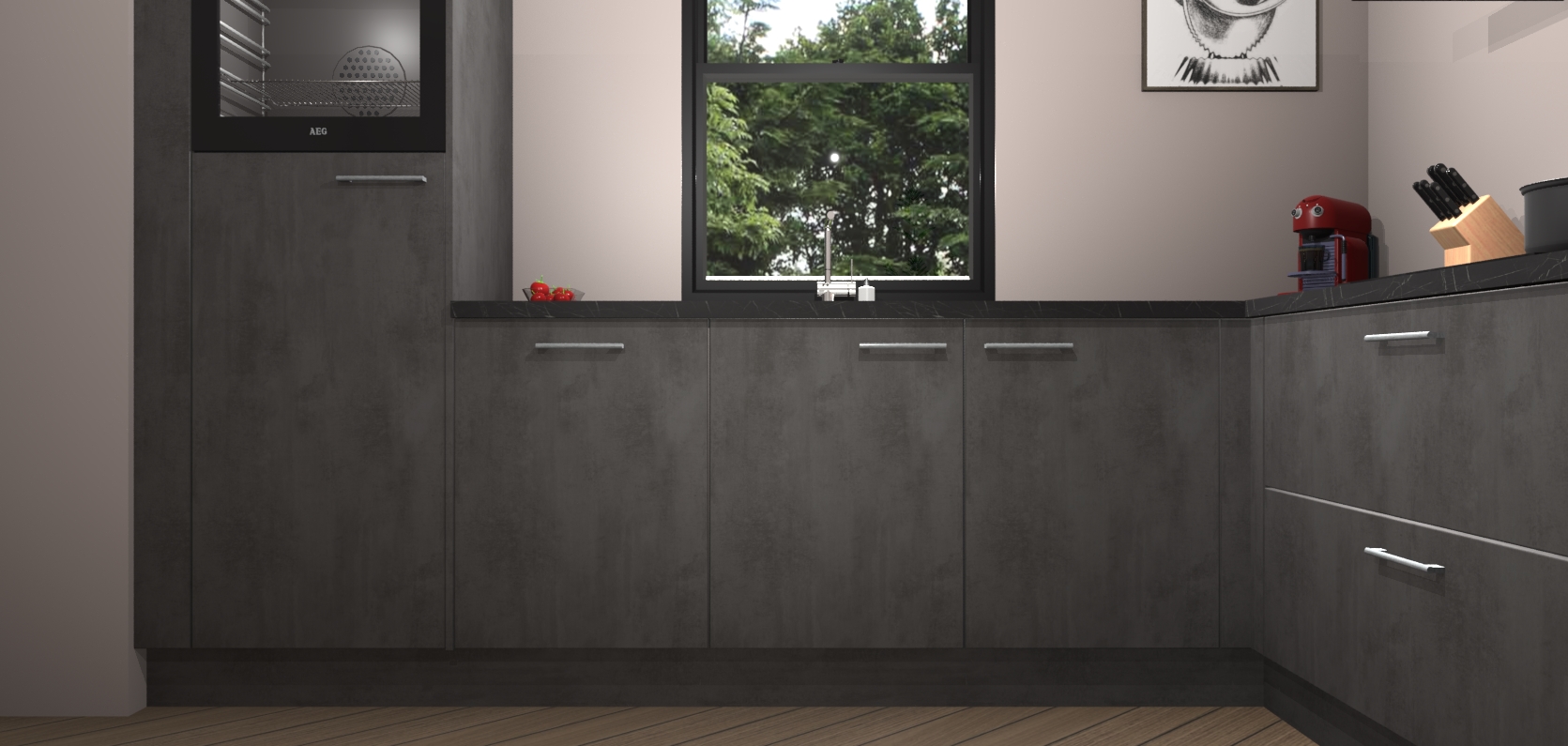 Welkom bij de Beton antraciet keuken Lublin. Deze prachtige keuken zal de komende jaren het middelpunt van de belangstelling in uw huis zijn. Uitgerust met vijf inbouwapparaten komt u nooit kookgereedschap tekort. Bovendien geeft de warme houtlook elke ruimte een uitnodigende en tijdloze uitstraling.