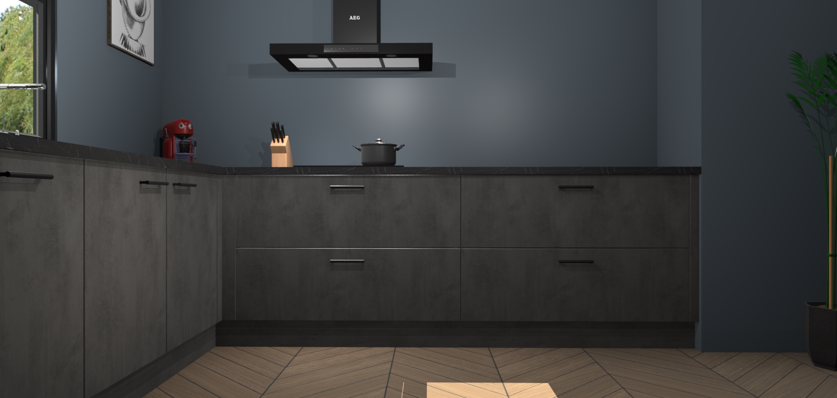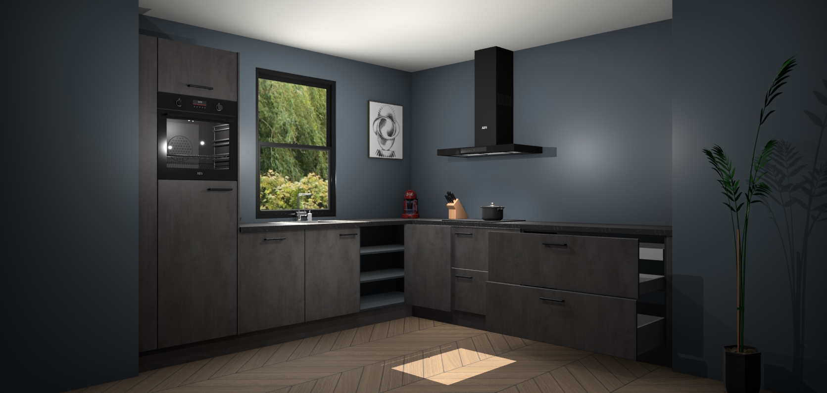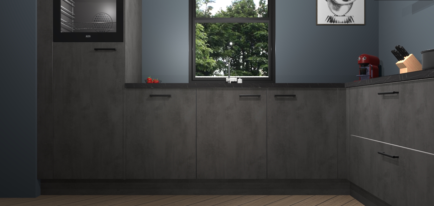 Welkom bij de Beton antraciet keuken Lublin. Deze prachtige keuken zal de komende jaren het middelpunt van de belangstelling in uw huis zijn. Uitgerust met vijf inbouwapparaten komt u nooit kookgereedschap tekort. Bovendien geeft de warme houtlook elke ruimte een uitnodigende en tijdloze uitstraling.