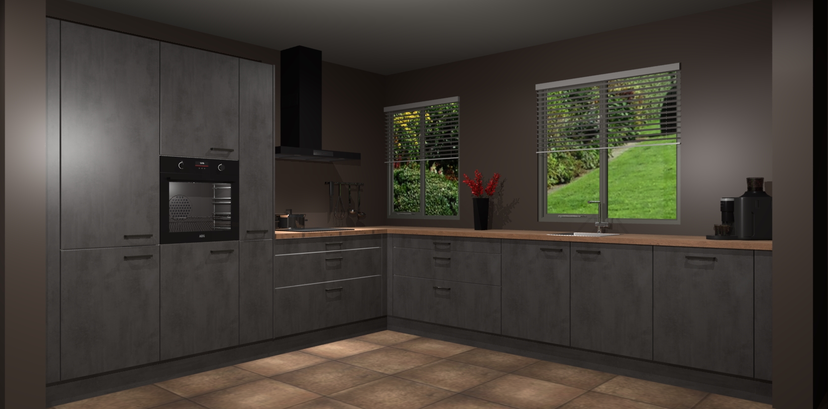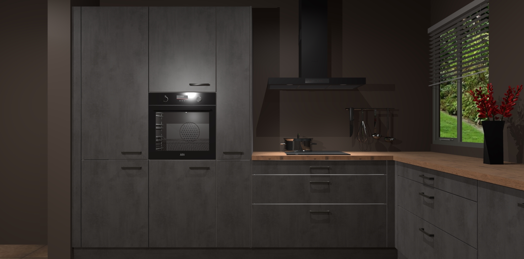 Welkom bij de Beton Antraciet keuken Palermo. Deze prachtige keuken zal de komende jaren het middelpunt van de belangstelling in uw huis zijn. Uitgerust met vijf inbouwapparaten komt u nooit kookgereedschap tekort. Bovendien geeft de warme houtlook elke ruimte een uitnodigende en tijdloze uitstraling.