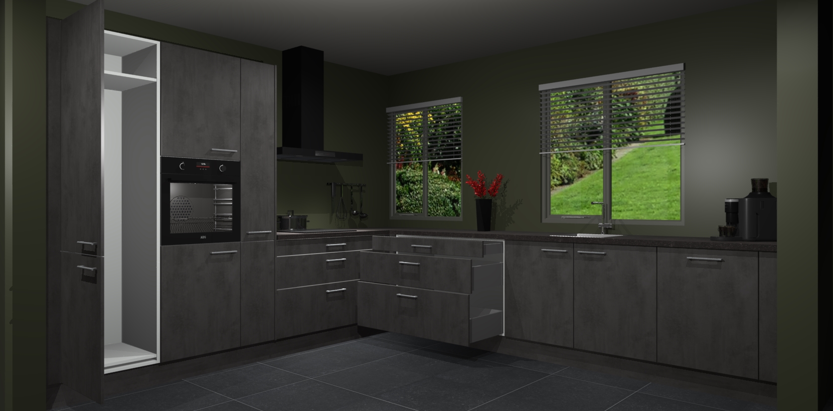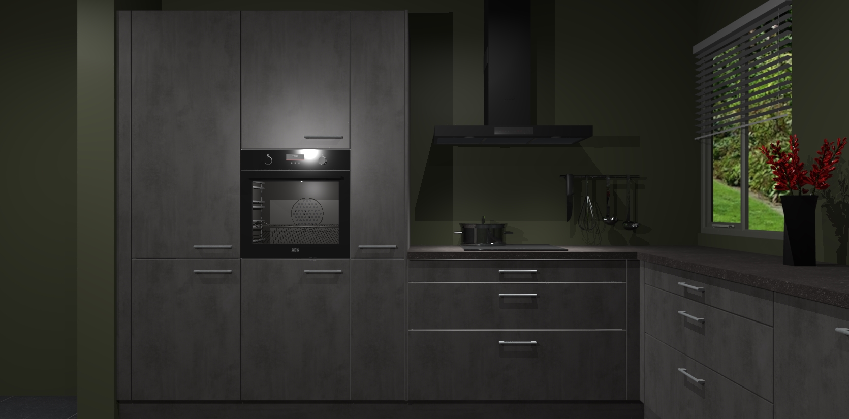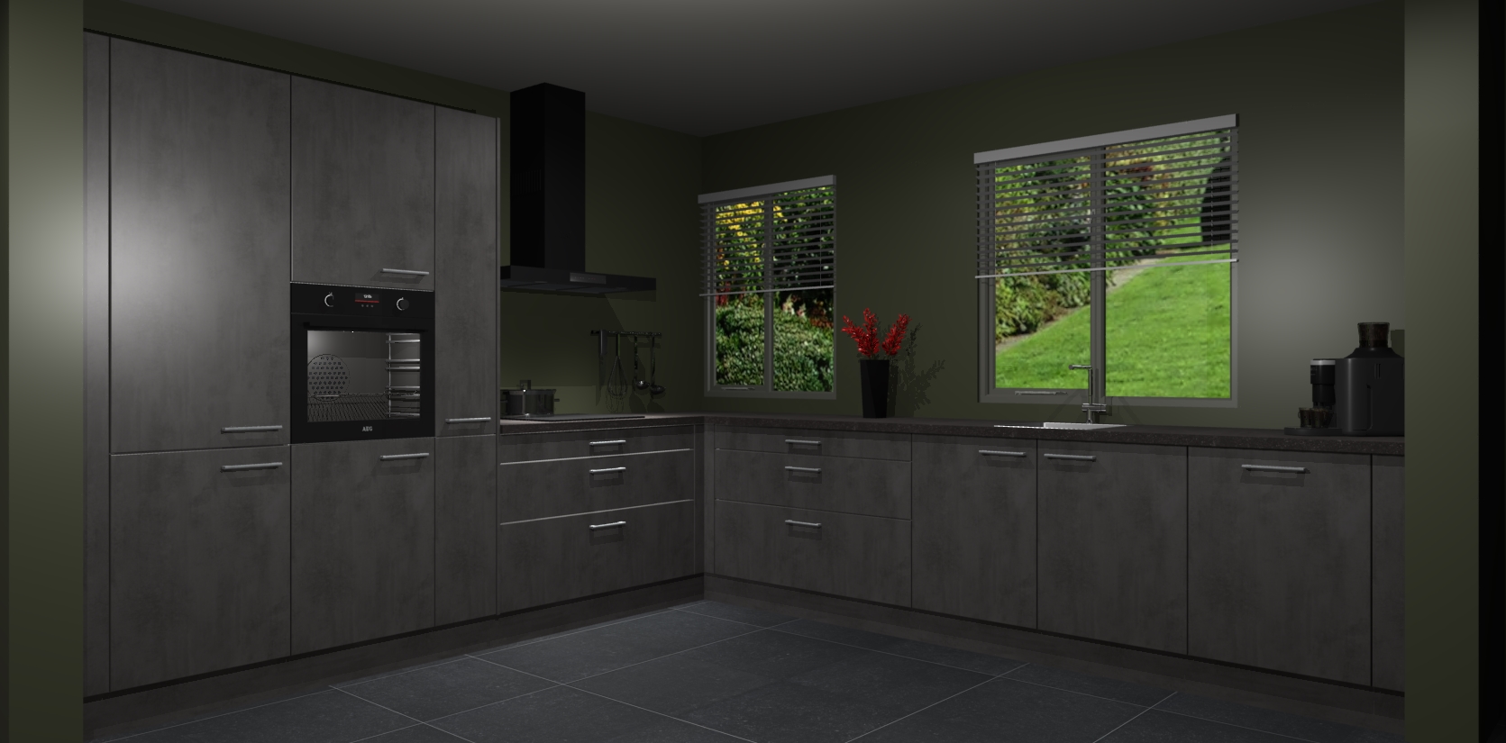 Welkom bij de Beton Antraciet keuken Palermo. Deze prachtige keuken zal de komende jaren het middelpunt van de belangstelling in uw huis zijn. Uitgerust met vijf inbouwapparaten komt u nooit kookgereedschap tekort. Bovendien geeft de warme houtlook elke ruimte een uitnodigende en tijdloze uitstraling.