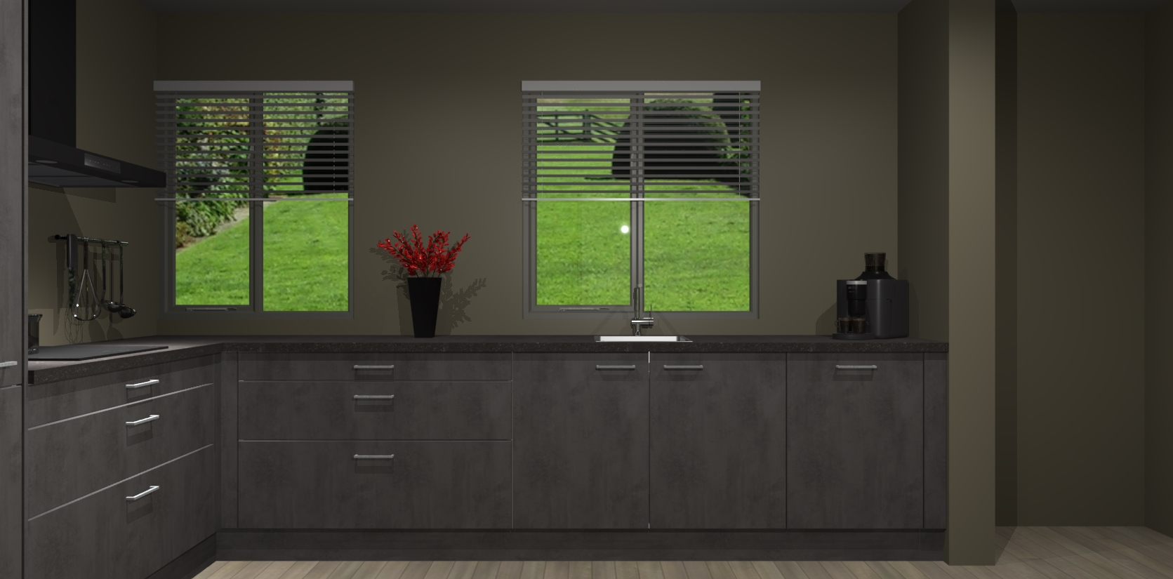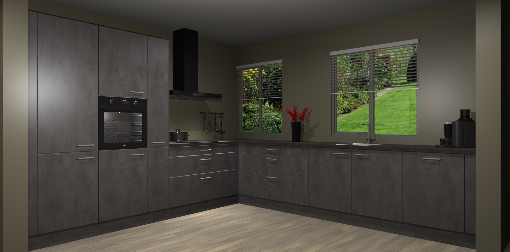 Welkom bij de Beton Antraciet keuken Palermo. Deze prachtige keuken zal de komende jaren het middelpunt van de belangstelling in uw huis zijn. Uitgerust met vijf inbouwapparaten komt u nooit kookgereedschap tekort. Bovendien geeft de warme houtlook elke ruimte een uitnodigende en tijdloze uitstraling.