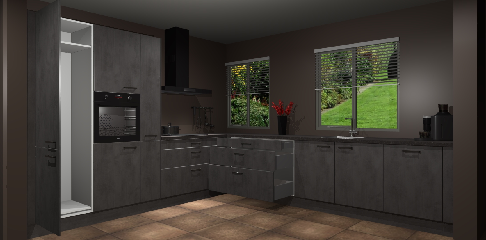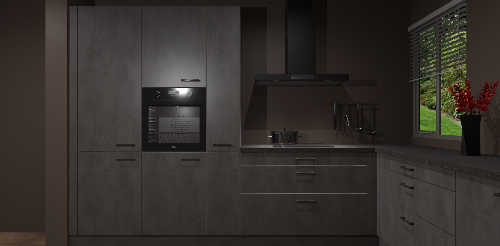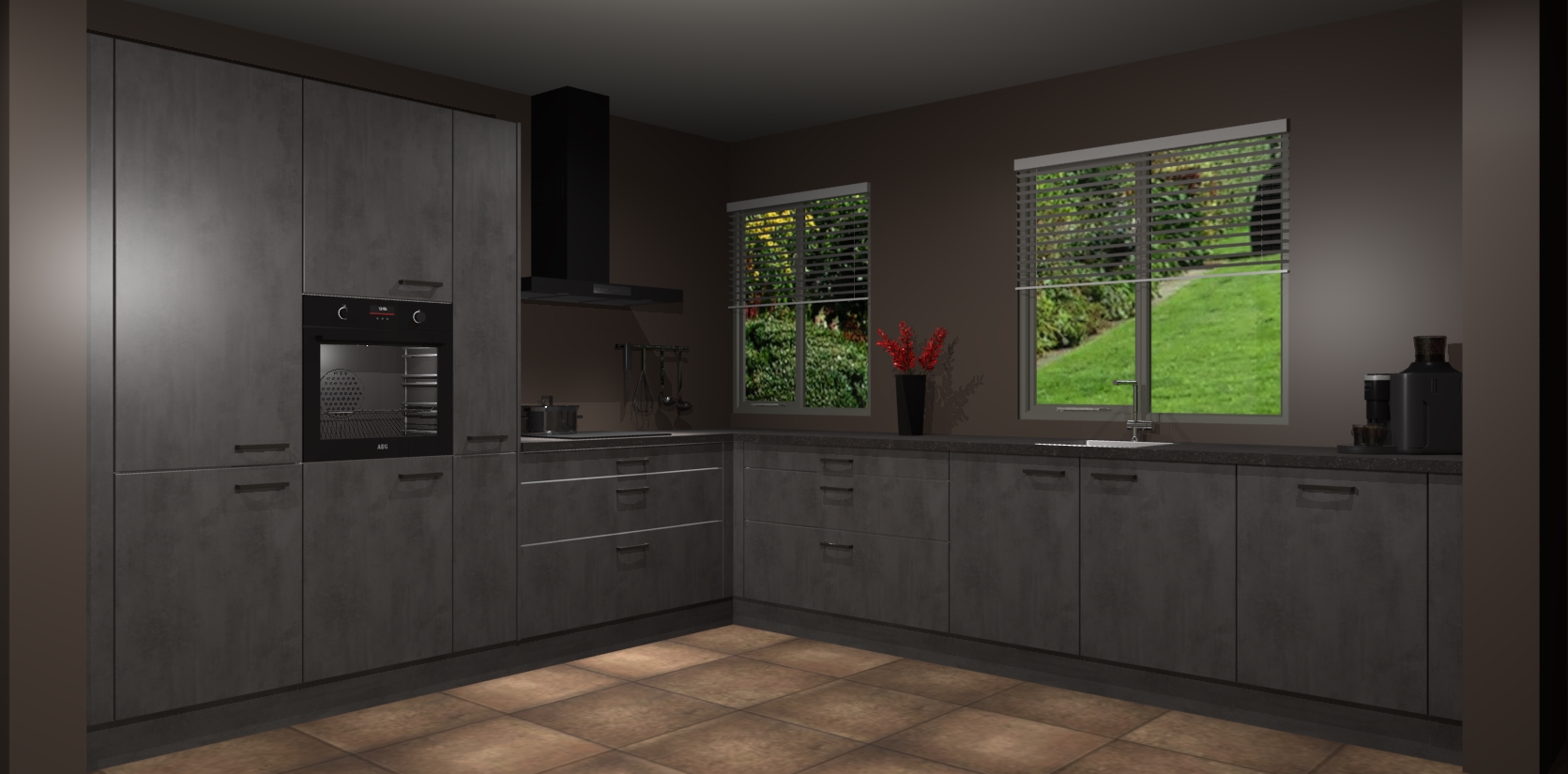 Welkom bij de Beton Antraciet keuken Palermo. Deze prachtige keuken zal de komende jaren het middelpunt van de belangstelling in uw huis zijn. Uitgerust met vijf inbouwapparaten komt u nooit kookgereedschap tekort. Bovendien geeft de warme houtlook elke ruimte een uitnodigende en tijdloze uitstraling.