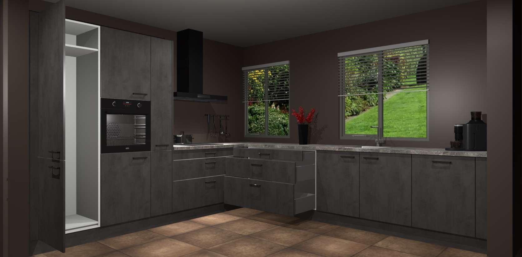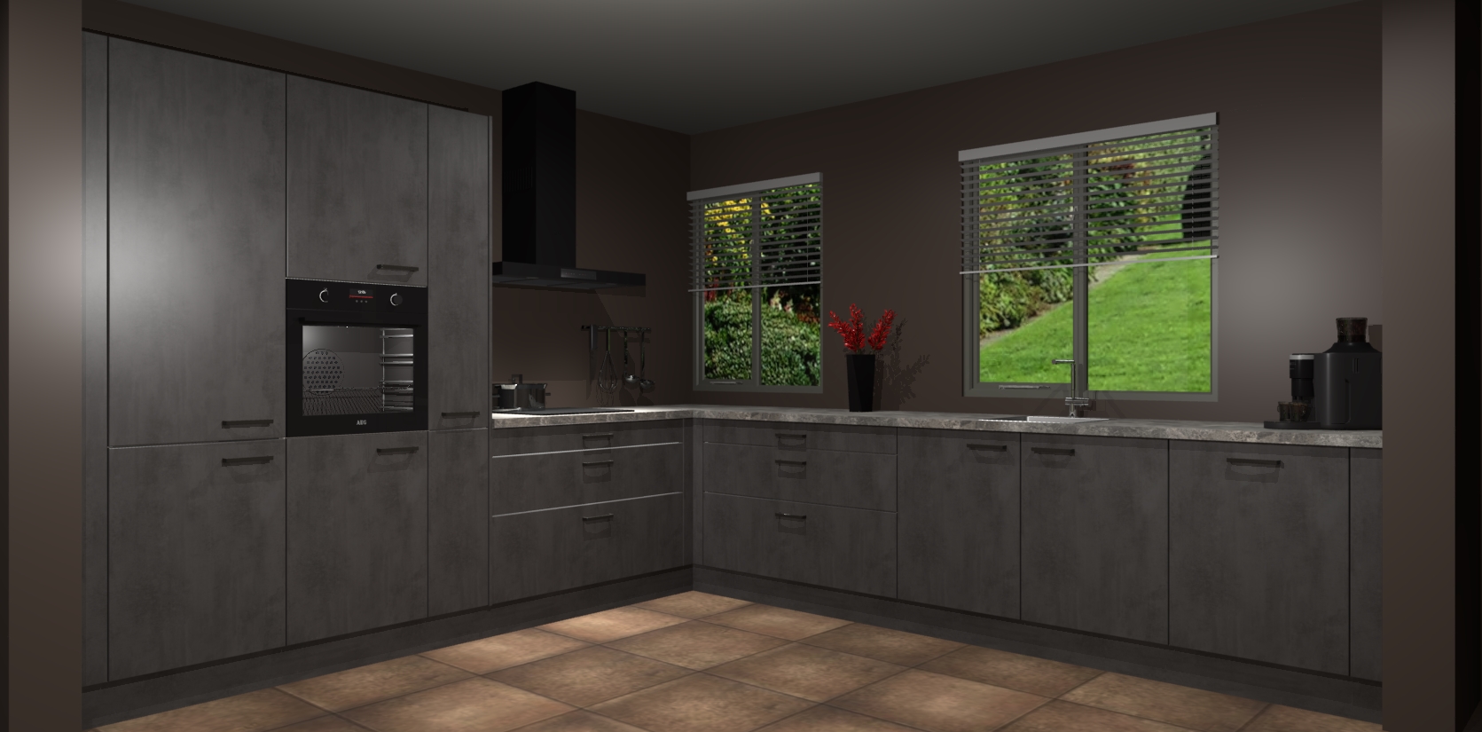 Welkom bij de Beton Antraciet keuken Palermo. Deze prachtige keuken zal de komende jaren het middelpunt van de belangstelling in uw huis zijn. Uitgerust met vijf inbouwapparaten komt u nooit kookgereedschap tekort. Bovendien geeft de warme houtlook elke ruimte een uitnodigende en tijdloze uitstraling.