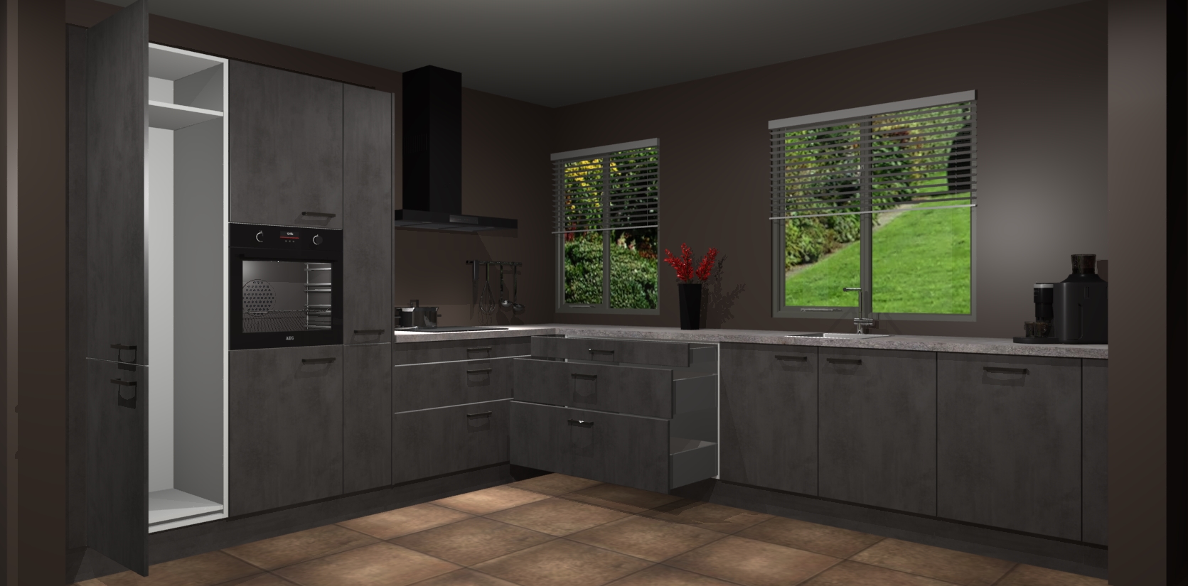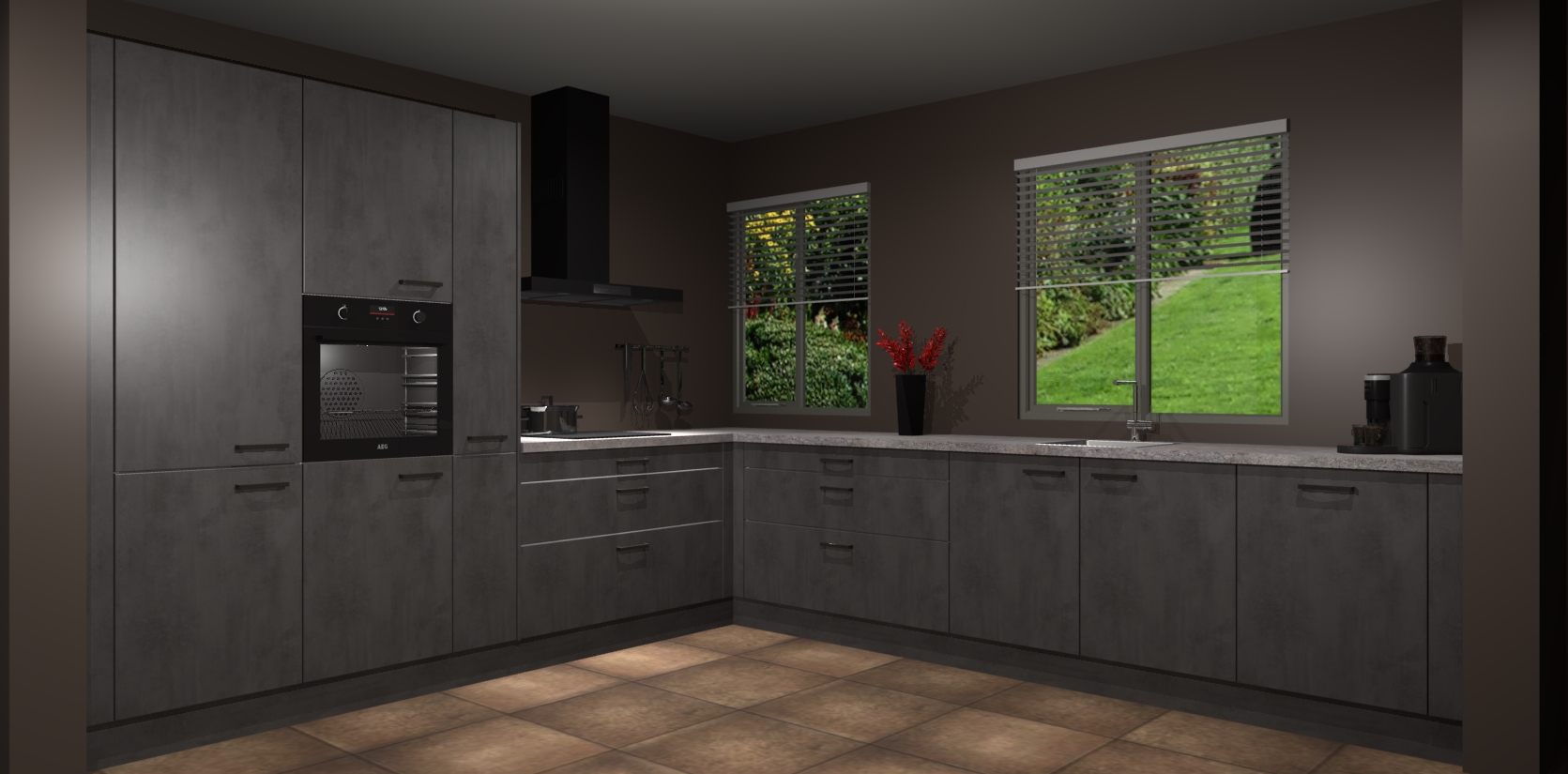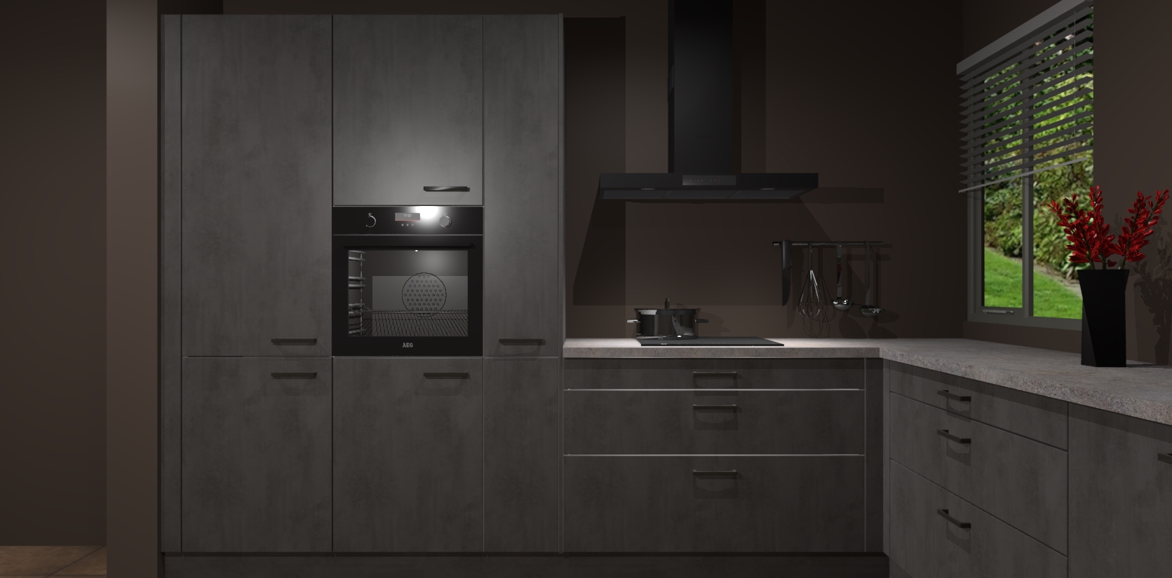 Welkom bij de Beton Antraciet keuken Palermo. Deze prachtige keuken zal de komende jaren het middelpunt van de belangstelling in uw huis zijn. Uitgerust met vijf inbouwapparaten komt u nooit kookgereedschap tekort. Bovendien geeft de warme houtlook elke ruimte een uitnodigende en tijdloze uitstraling.