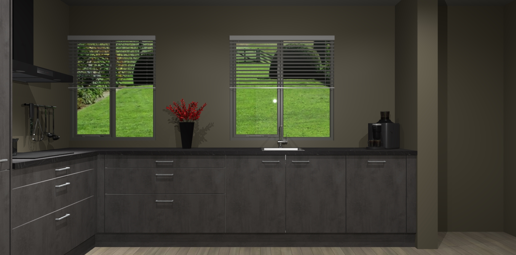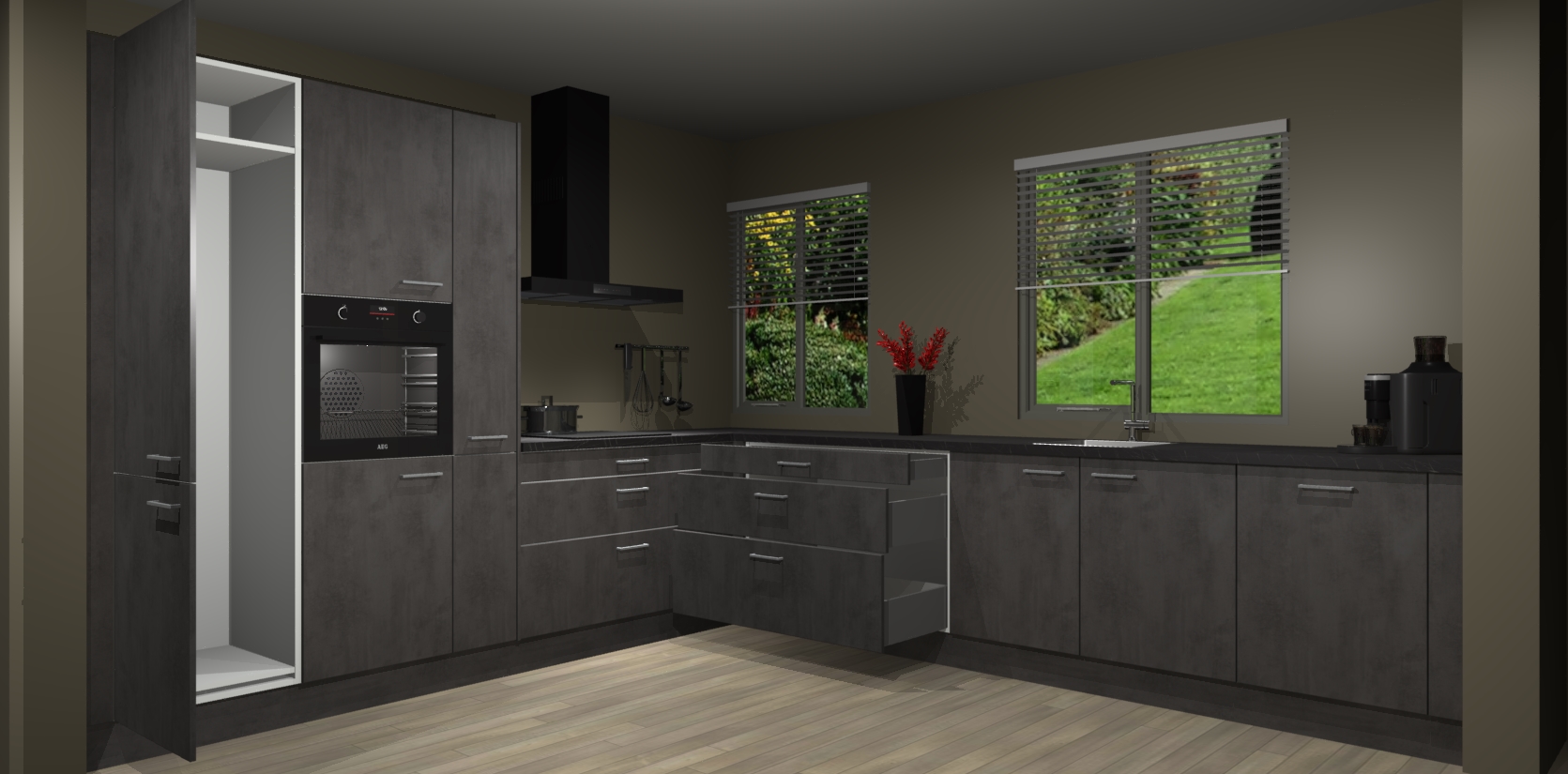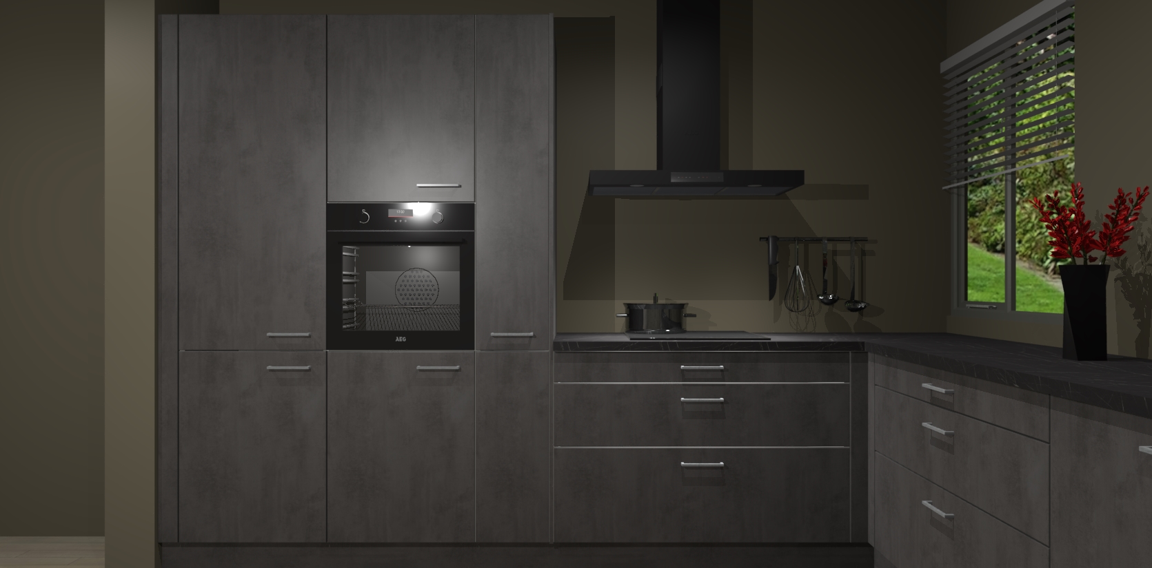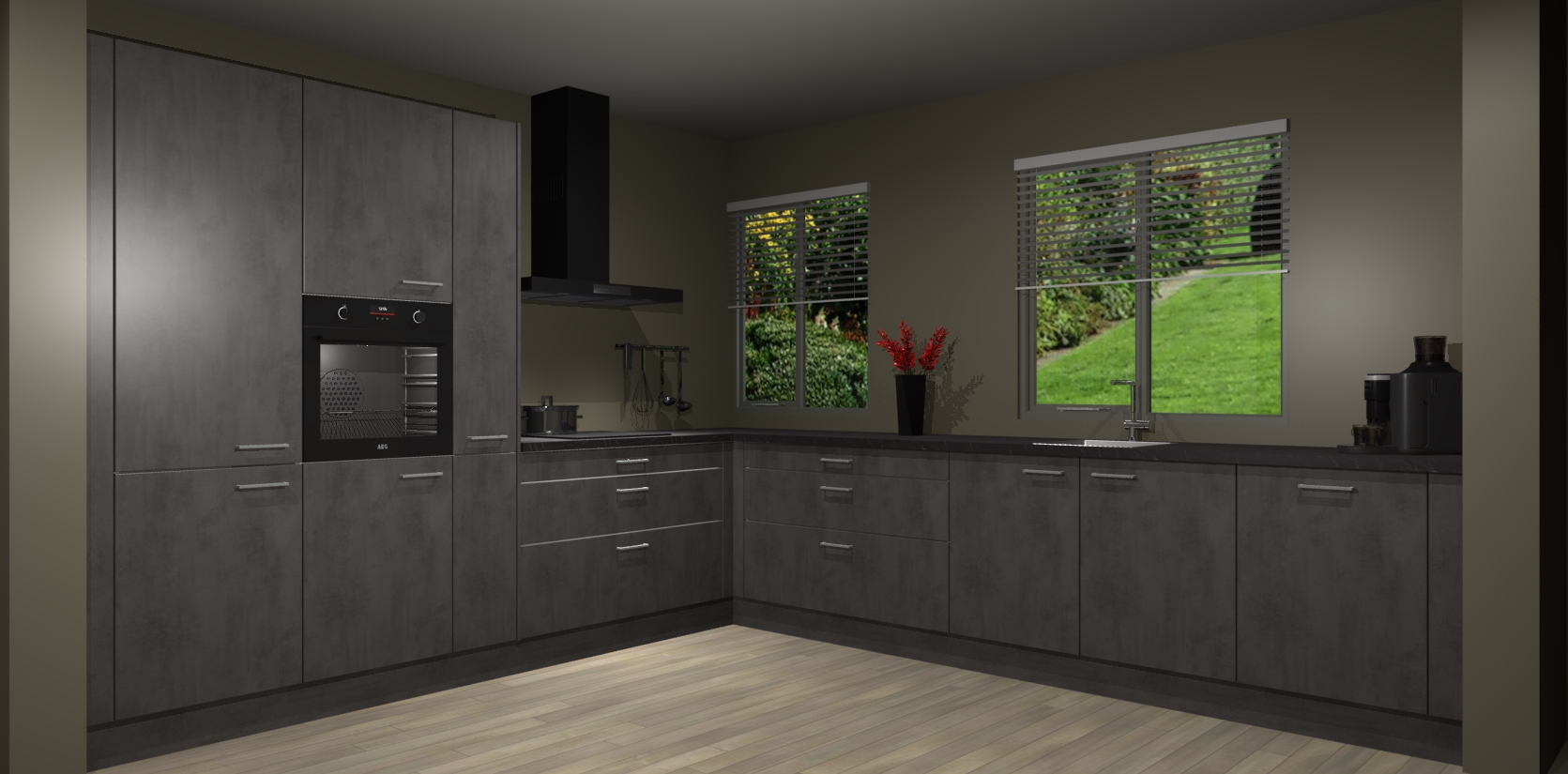 Welkom bij de Beton Antraciet keuken Palermo. Deze prachtige keuken zal de komende jaren het middelpunt van de belangstelling in uw huis zijn. Uitgerust met vijf inbouwapparaten komt u nooit kookgereedschap tekort. Bovendien geeft de warme houtlook elke ruimte een uitnodigende en tijdloze uitstraling.