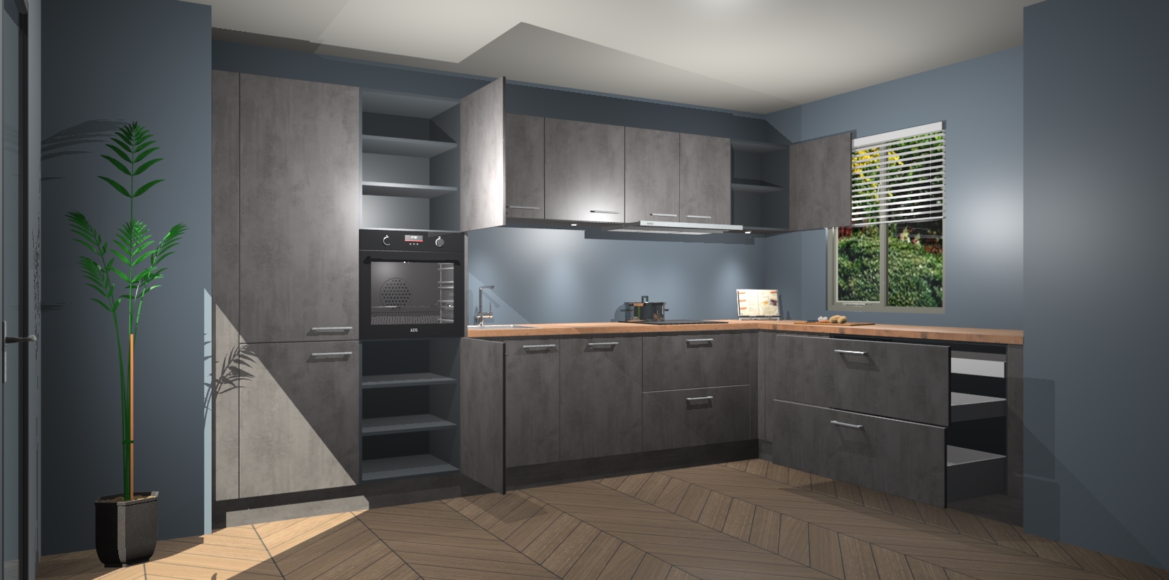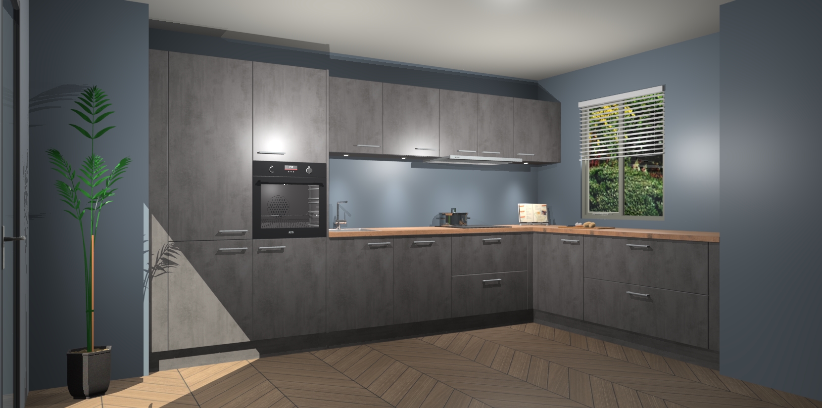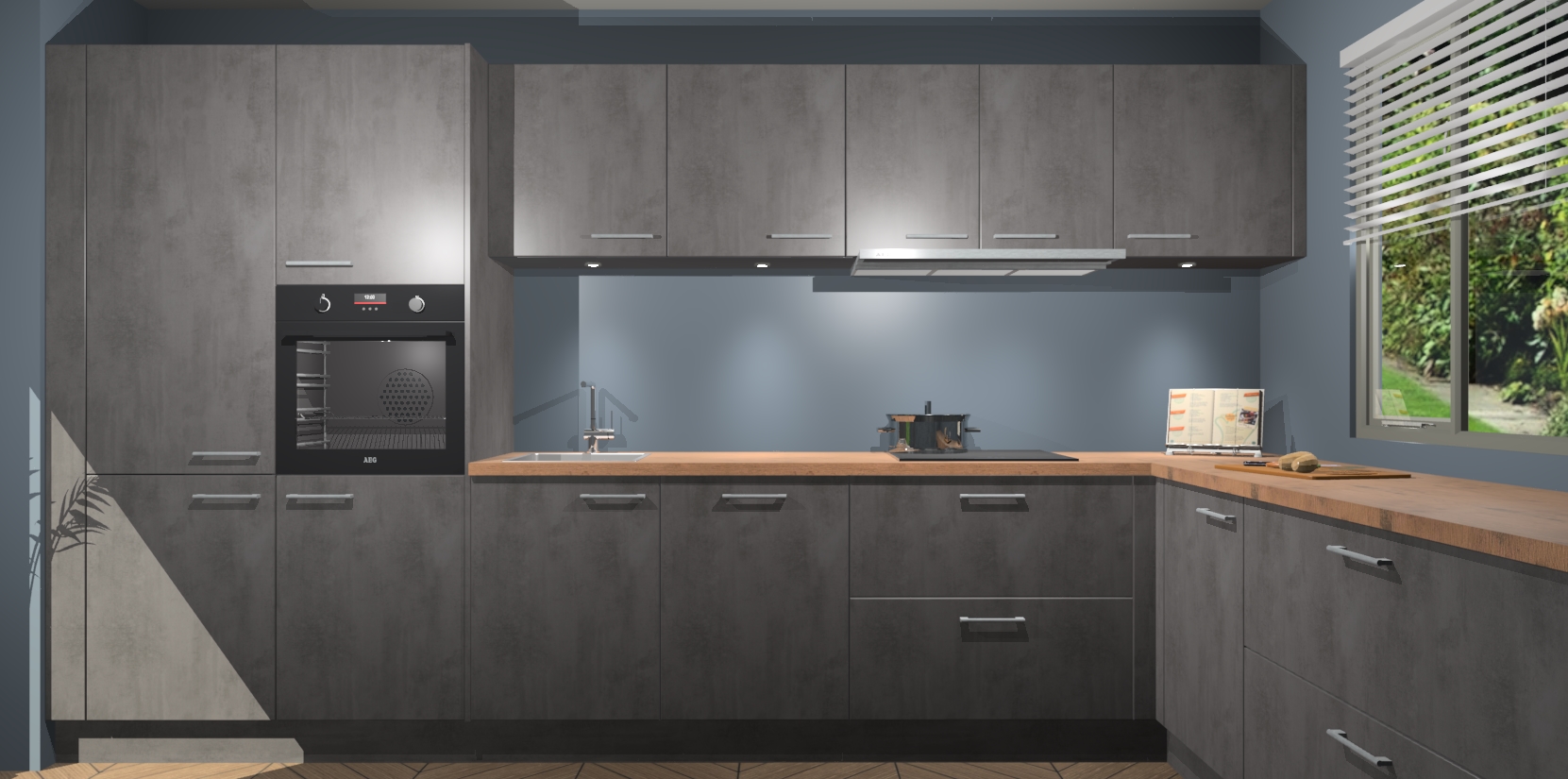 Verwelkom de natuurlijke warmte van de Beton Antraciet keuken Petten in uw huis. Deze prachtige hoekkeuken met zijn moderne design en warme houten look geeft u meer dan genoeg opbergruimte om uw comfortabel te voelen in uw keuken. Geniet van soft-close deuren die al uw gasten het gevoel zullen geven dat ze zich in een luxueuze ruimte bevinden.