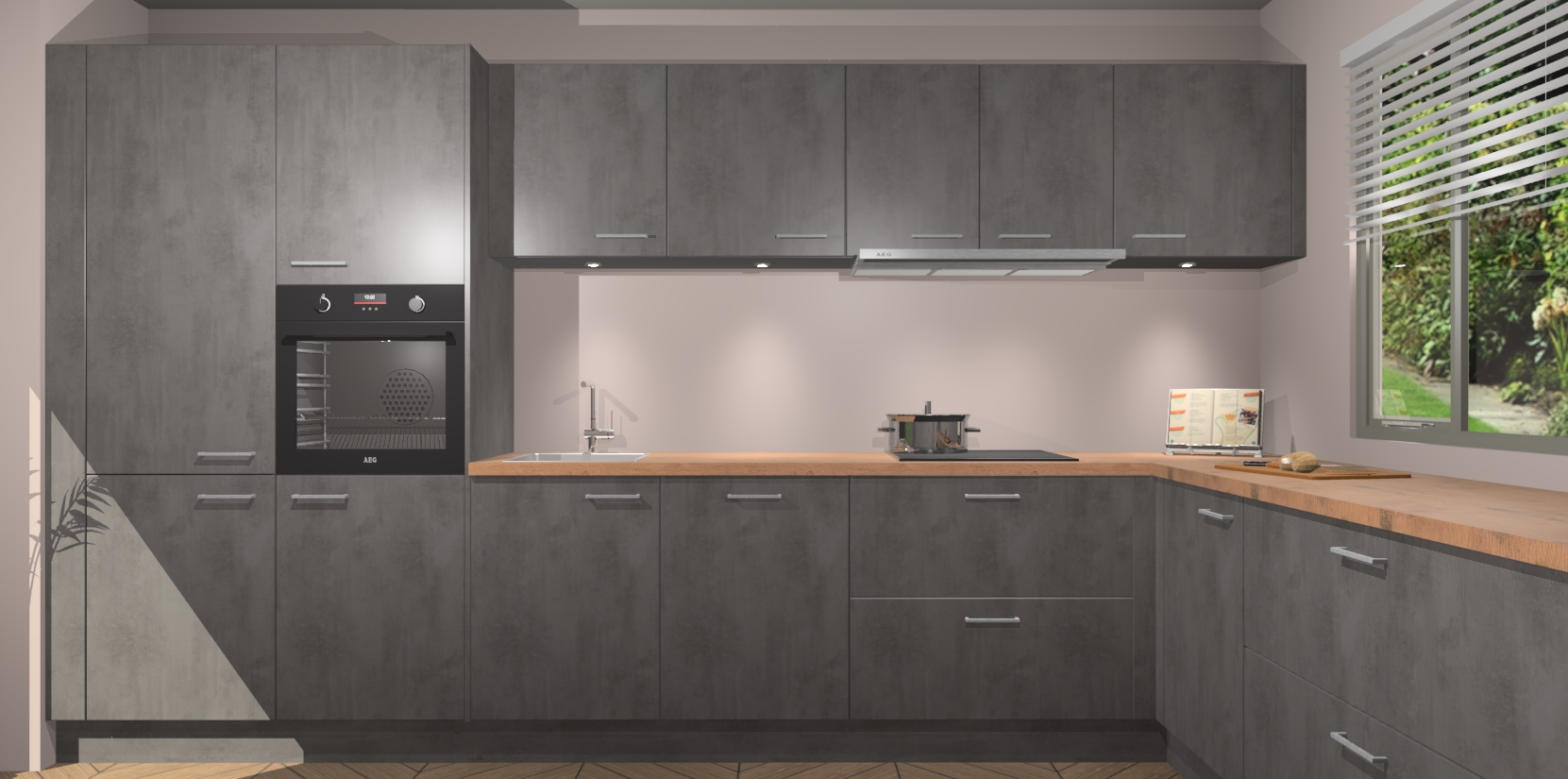 Verwelkom de natuurlijke warmte van de Beton Antraciet keuken Petten in uw huis. Deze prachtige hoekkeuken met zijn moderne design en warme houten look geeft u meer dan genoeg opbergruimte om uw comfortabel te voelen in uw keuken. Geniet van soft-close deuren die al uw gasten het gevoel zullen geven dat ze zich in een luxueuze ruimte bevinden.