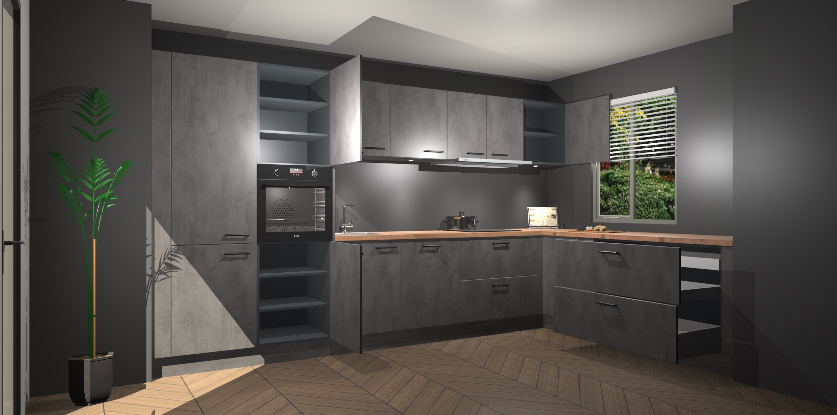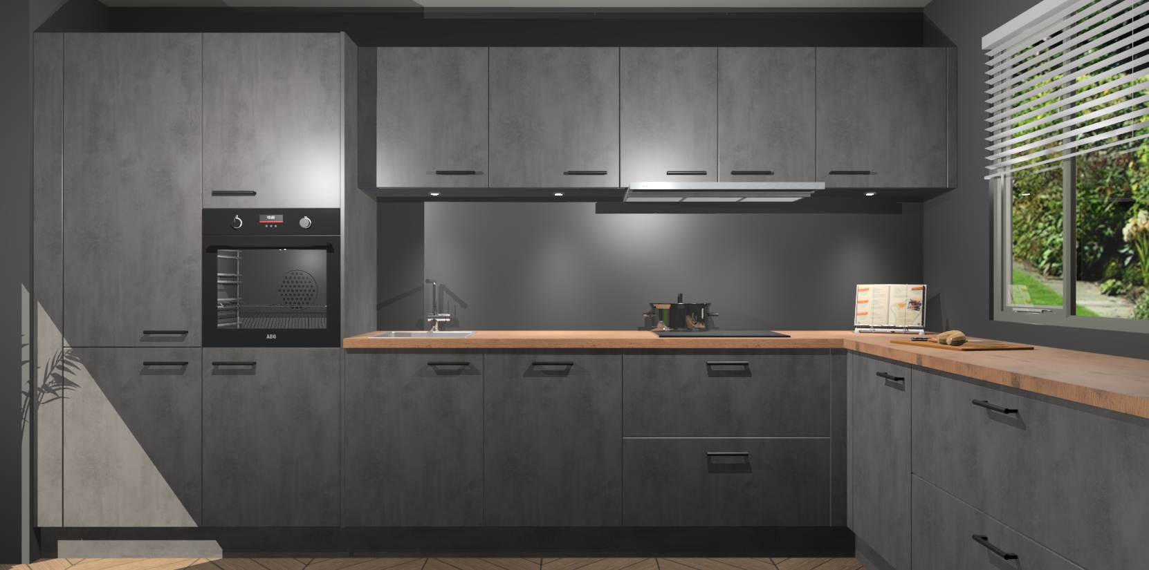 Verwelkom de natuurlijke warmte van de Beton Antraciet keuken Petten in uw huis. Deze prachtige hoekkeuken met zijn moderne design en warme houten look geeft u meer dan genoeg opbergruimte om uw comfortabel te voelen in uw keuken. Geniet van soft-close deuren die al uw gasten het gevoel zullen geven dat ze zich in een luxueuze ruimte bevinden.