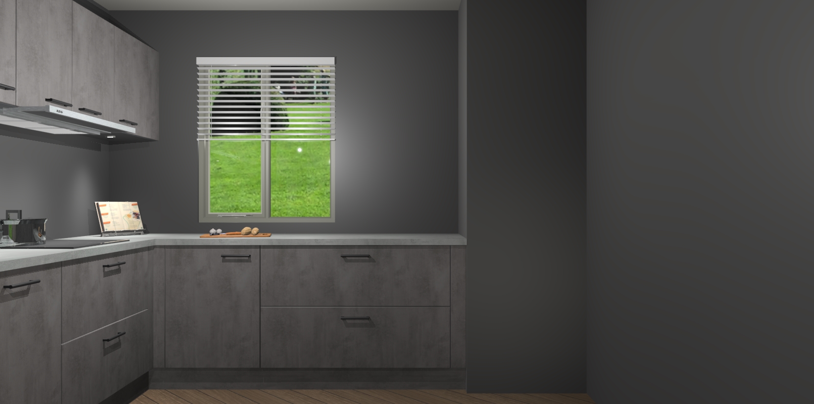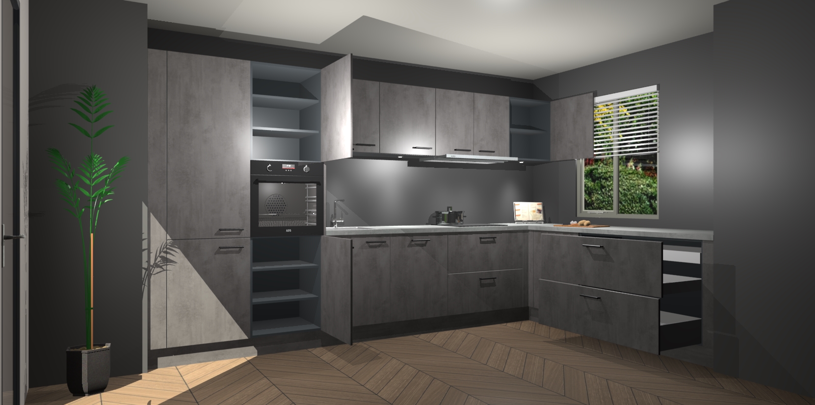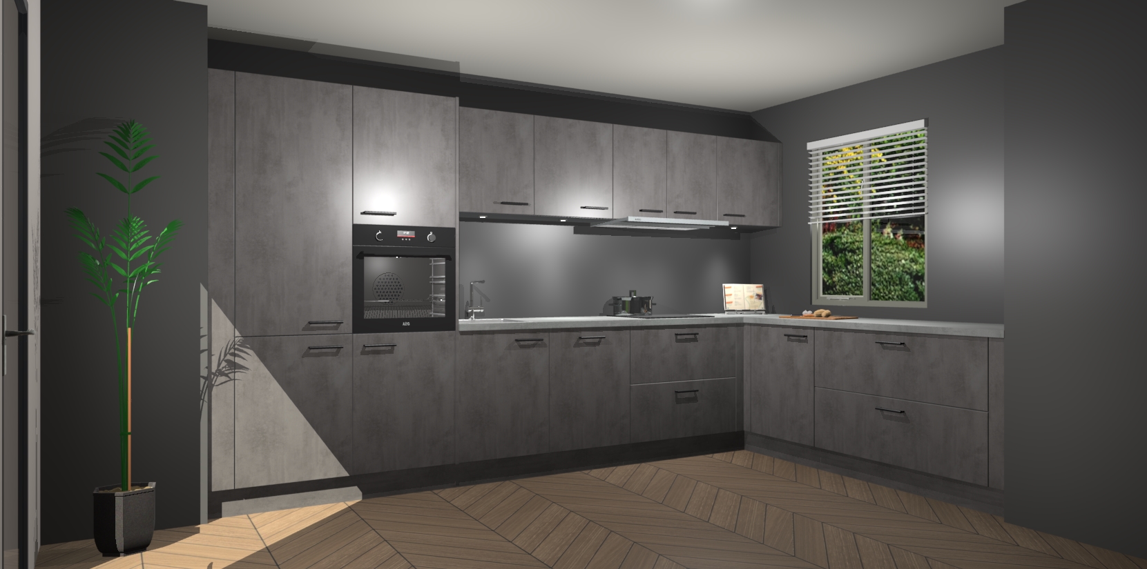 Verwelkom de natuurlijke warmte van de Beton Antraciet keuken Petten in uw huis. Deze prachtige hoekkeuken met zijn moderne design en warme houten look geeft u meer dan genoeg opbergruimte om uw comfortabel te voelen in uw keuken. Geniet van soft-close deuren die al uw gasten het gevoel zullen geven dat ze zich in een luxueuze ruimte bevinden.