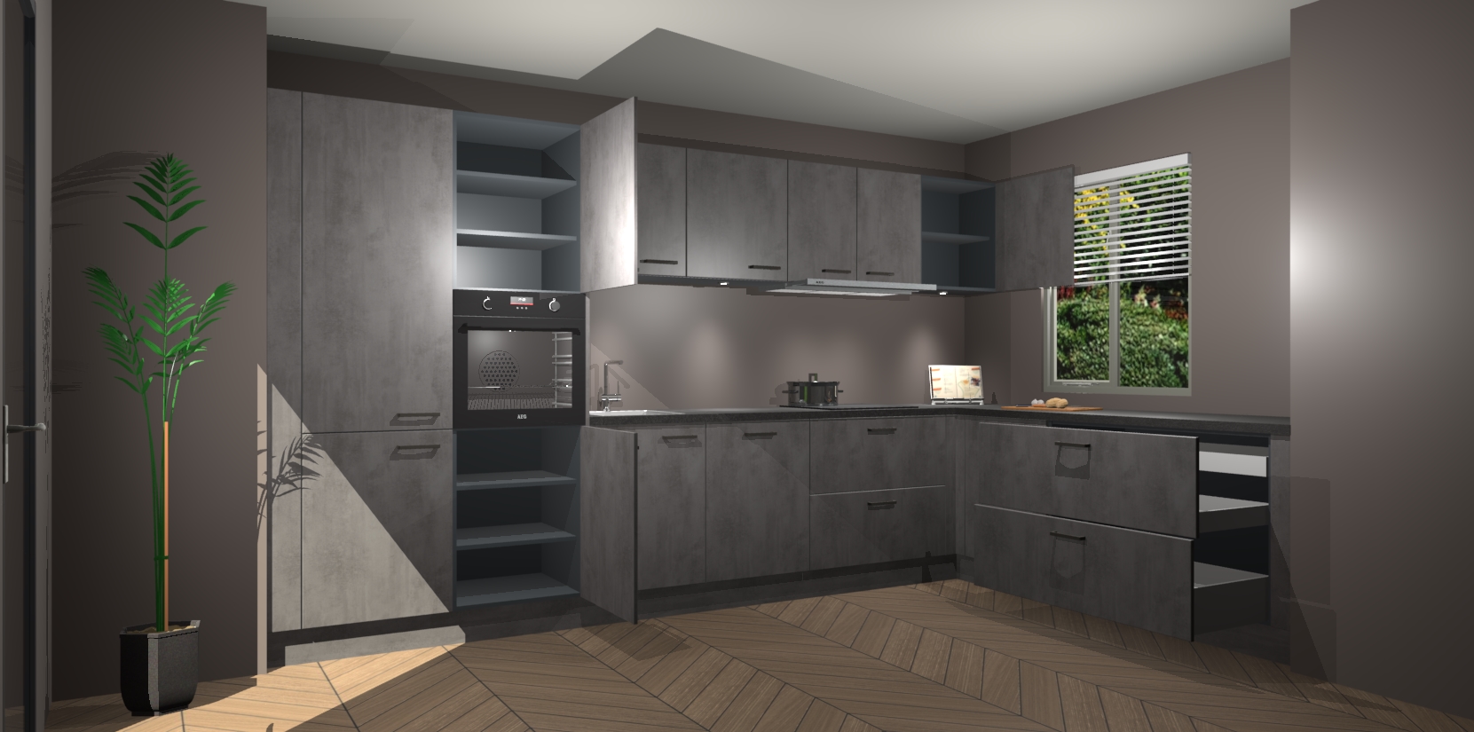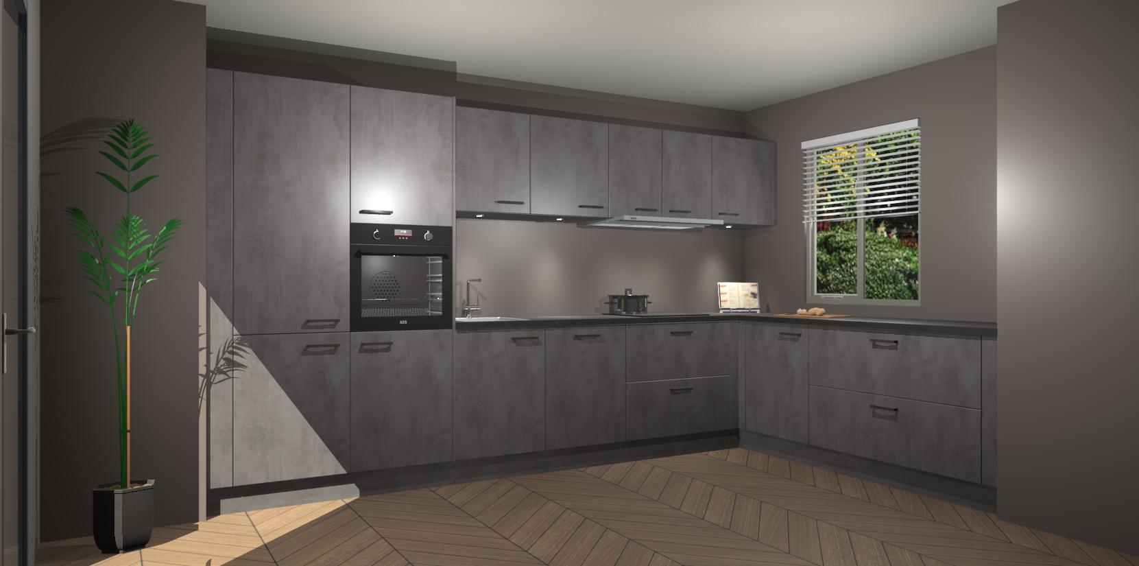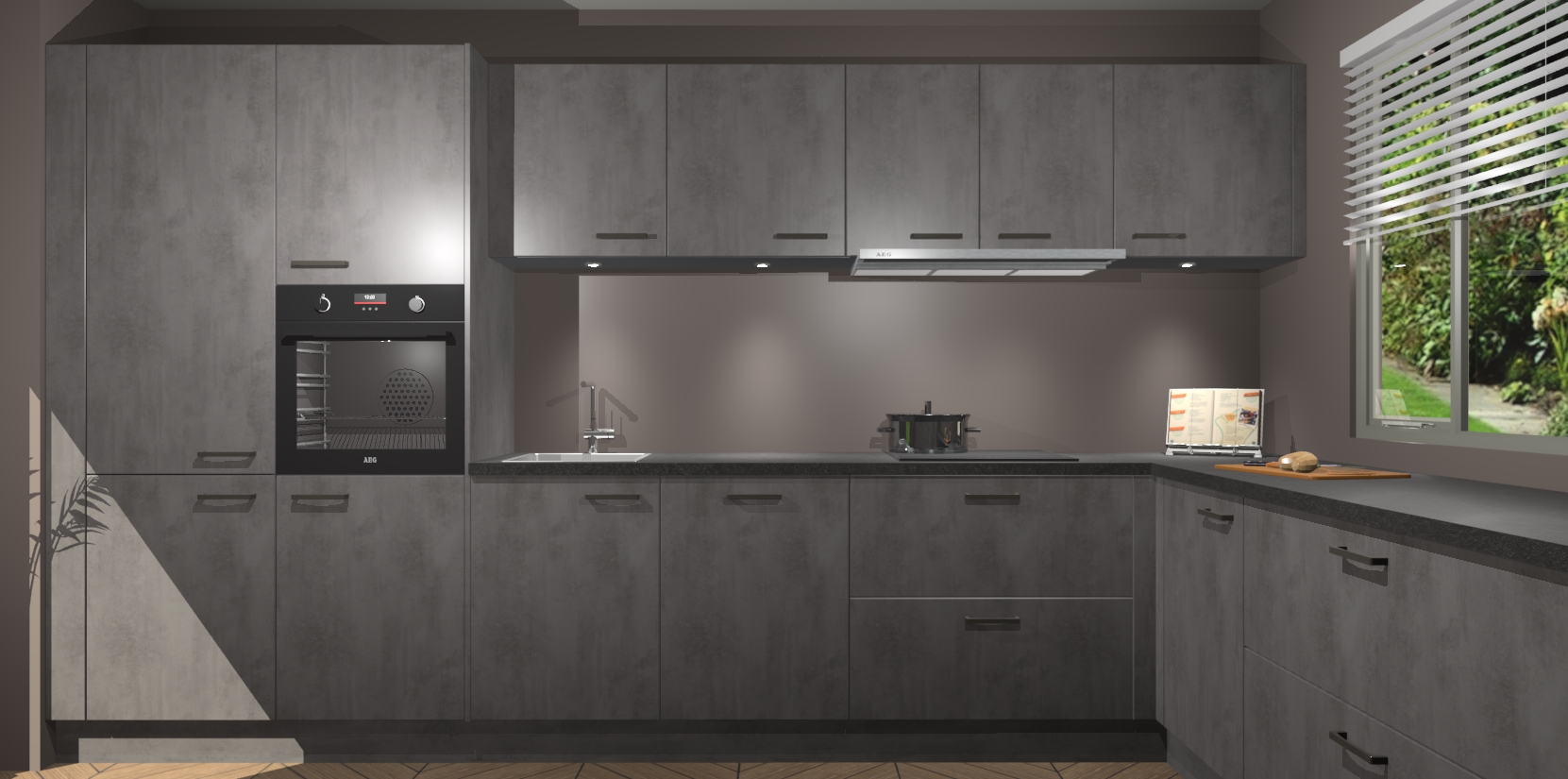 Verwelkom de natuurlijke warmte van de Beton Antraciet keuken Petten in uw huis. Deze prachtige hoekkeuken met zijn moderne design en warme houten look geeft u meer dan genoeg opbergruimte om uw comfortabel te voelen in uw keuken. Geniet van soft-close deuren die al uw gasten het gevoel zullen geven dat ze zich in een luxueuze ruimte bevinden.