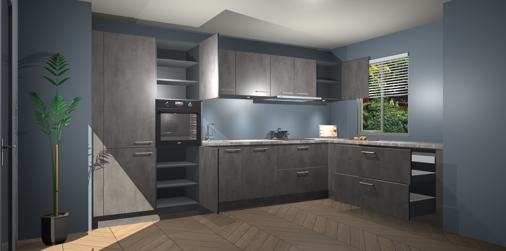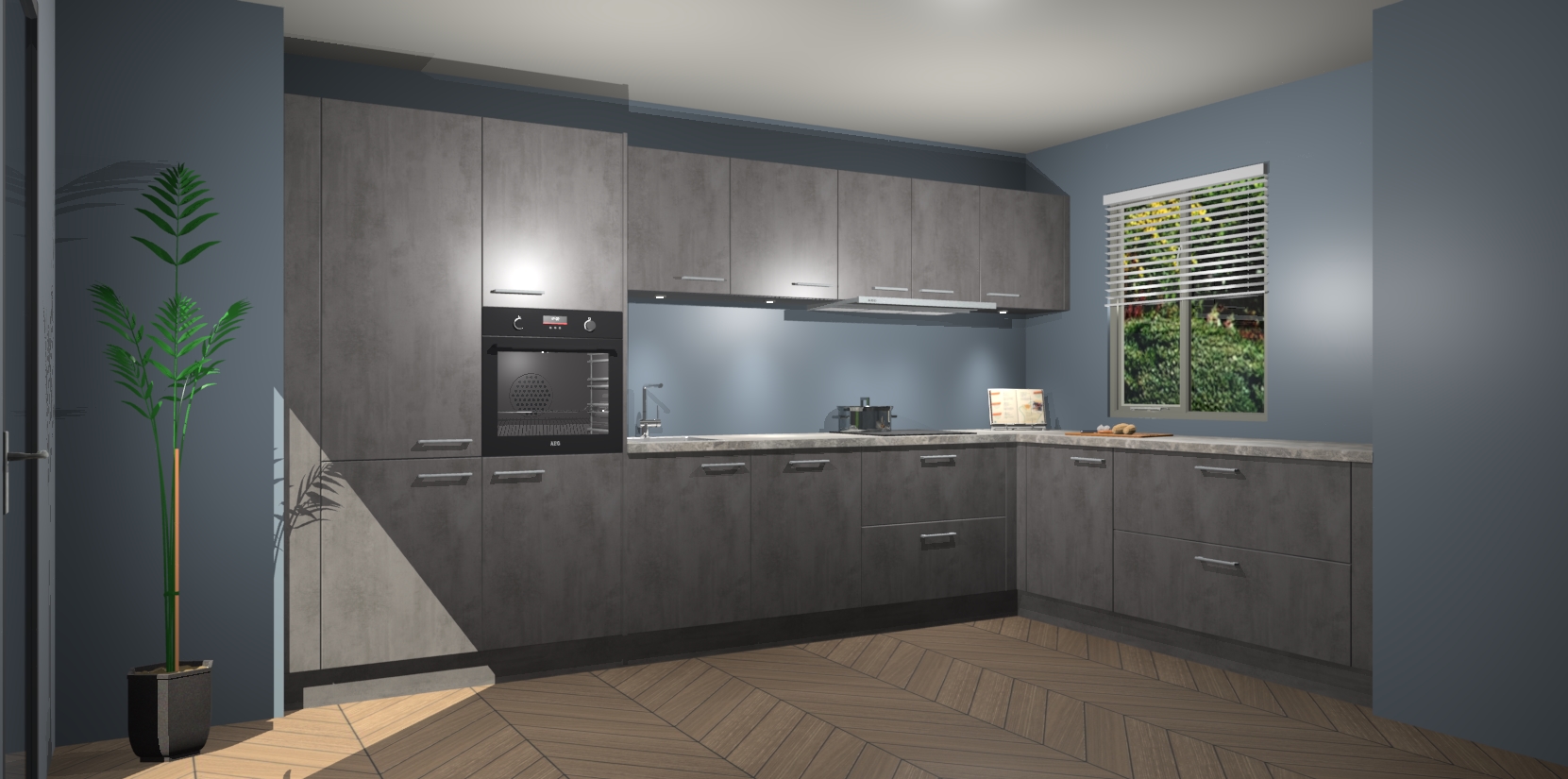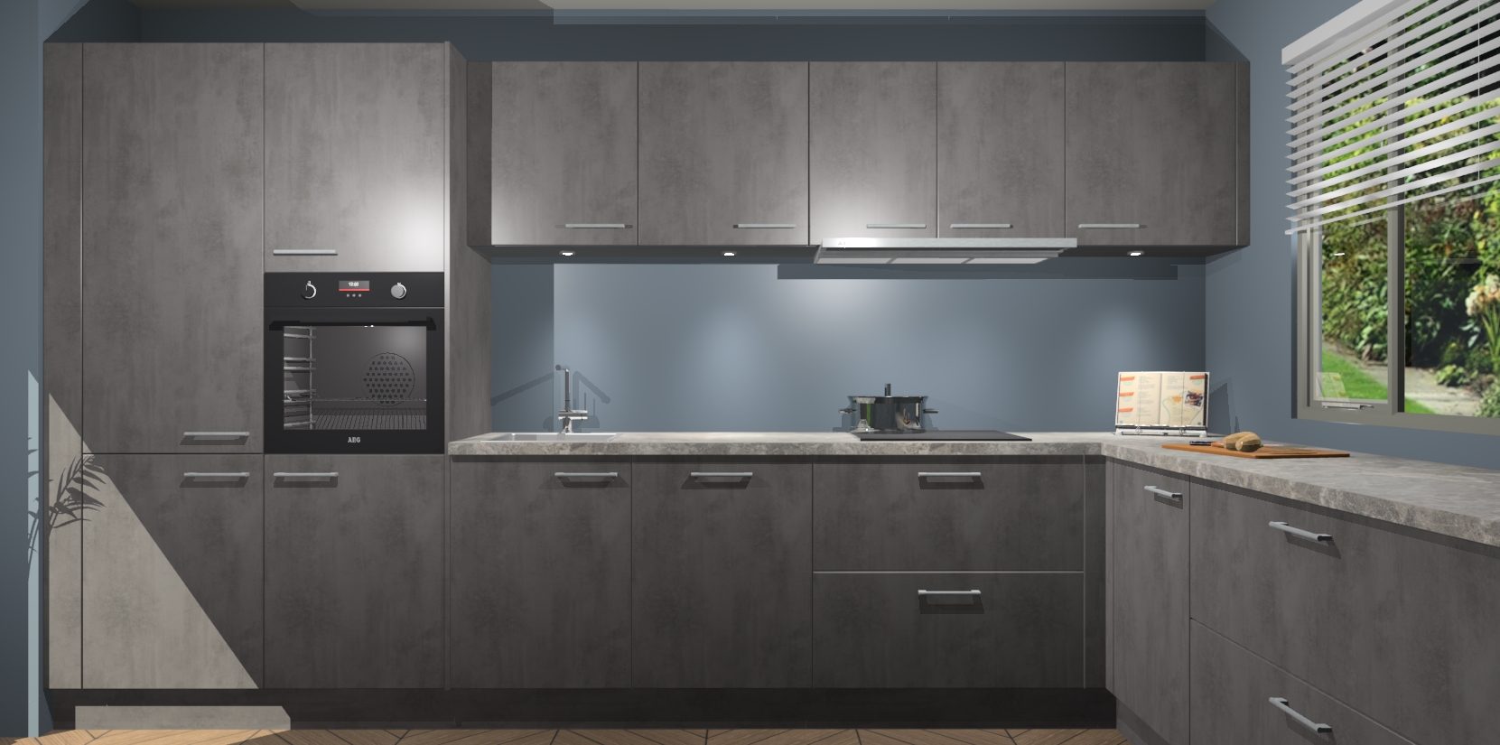 Verwelkom de natuurlijke warmte van de Beton Antraciet keuken Petten in uw huis. Deze prachtige hoekkeuken met zijn moderne design en warme houten look geeft u meer dan genoeg opbergruimte om uw comfortabel te voelen in uw keuken. Geniet van soft-close deuren die al uw gasten het gevoel zullen geven dat ze zich in een luxueuze ruimte bevinden.