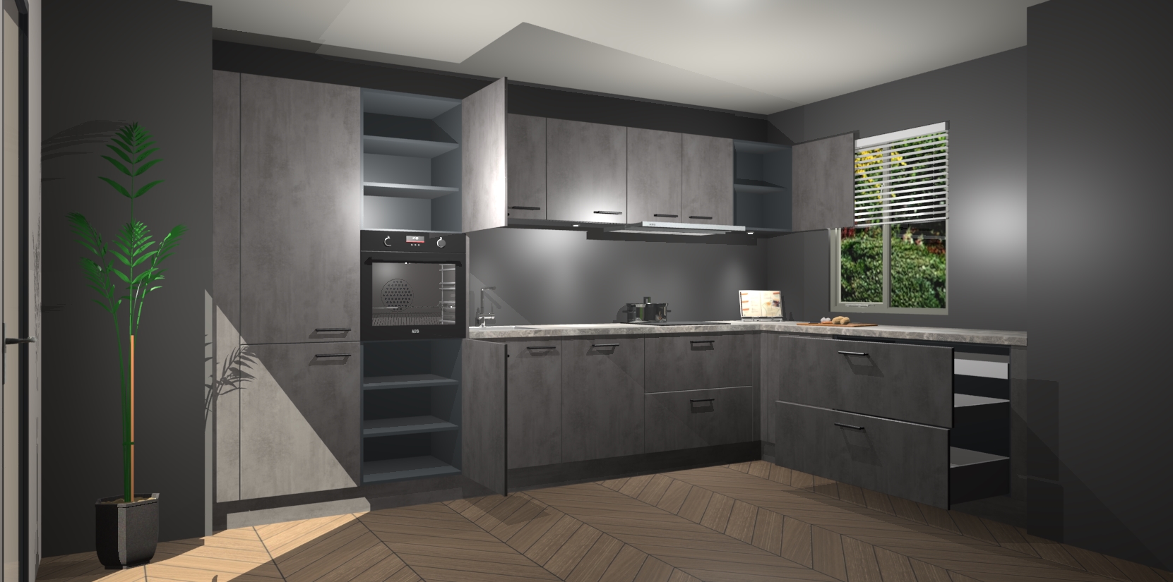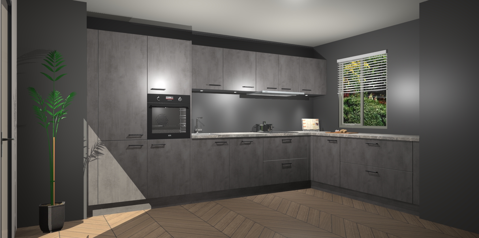 Verwelkom de natuurlijke warmte van de Beton Antraciet keuken Petten in uw huis. Deze prachtige hoekkeuken met zijn moderne design en warme houten look geeft u meer dan genoeg opbergruimte om uw comfortabel te voelen in uw keuken. Geniet van soft-close deuren die al uw gasten het gevoel zullen geven dat ze zich in een luxueuze ruimte bevinden.