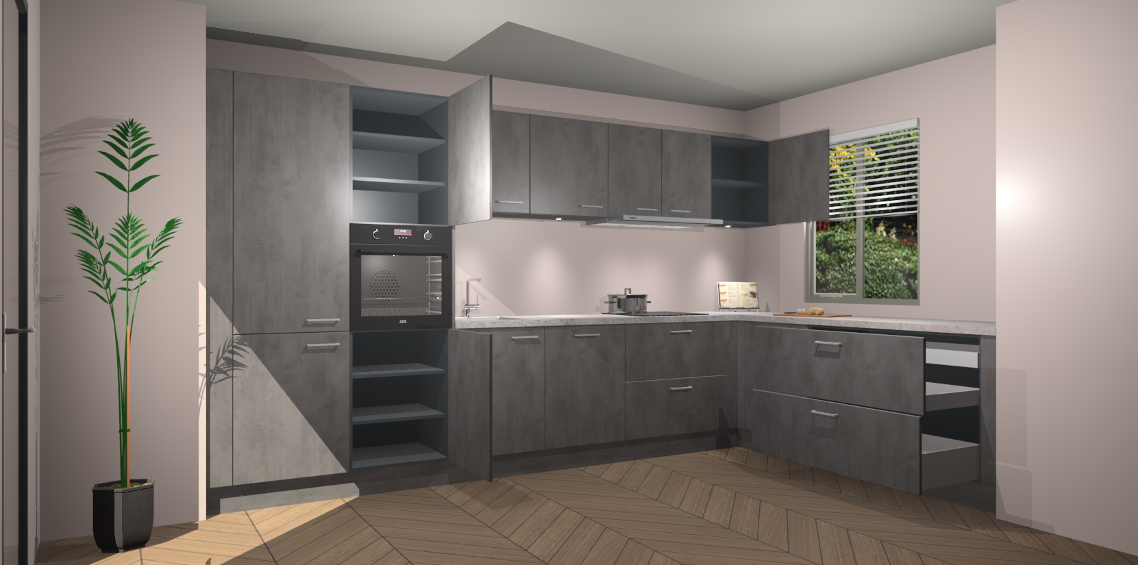 Verwelkom de natuurlijke warmte van de Beton Antraciet keuken Petten in uw huis. Deze prachtige hoekkeuken met zijn moderne design en warme houten look geeft u meer dan genoeg opbergruimte om uw comfortabel te voelen in uw keuken. Geniet van soft-close deuren die al uw gasten het gevoel zullen geven dat ze zich in een luxueuze ruimte bevinden.