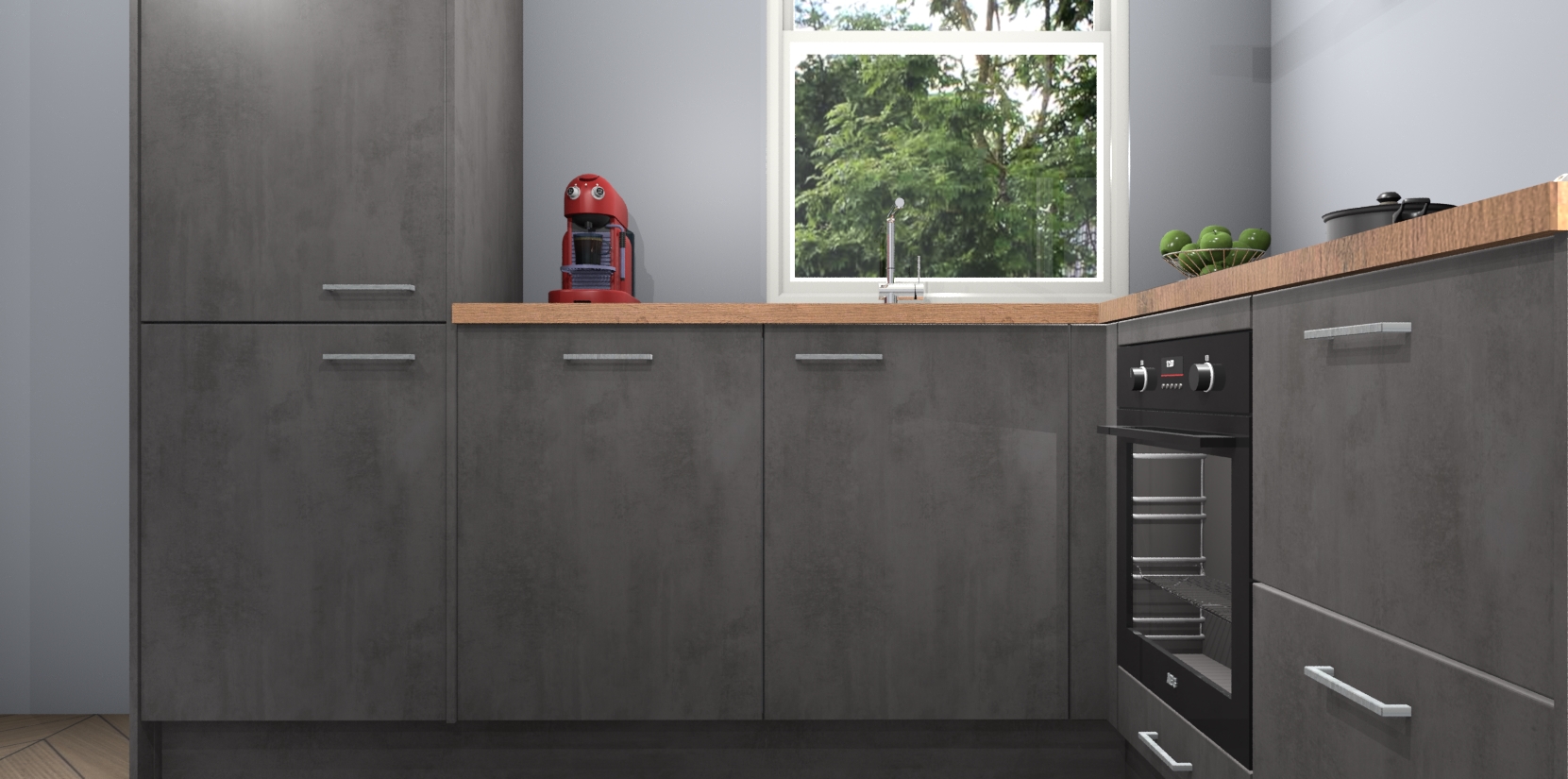 De Beton Antraciet keuken Phuket heeft alles wat u maar kunt wensen. Niet alleen zijn er softclose deuren, maar ook 5 ingebouwde apparaten: een oven, inductiekookplaat, afzuigkap, vaatwasser en koelkast - waarbij u later gemakkelijk naar het AEG merk, van inductiekookplaat naar kookplaat met geïntegreerde afzuiging of van oven naar combimagnetron kunt upgraden. Dat alles tegen een vast laag tarief! Bovendien geeft de Beton Antraciet keuken Phuket supersnelle levering van 7 weken. Echt iets voor u als u er niet op wilt wachten om het resultaat te zien in eigen keuken!