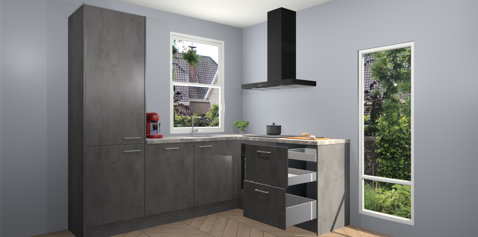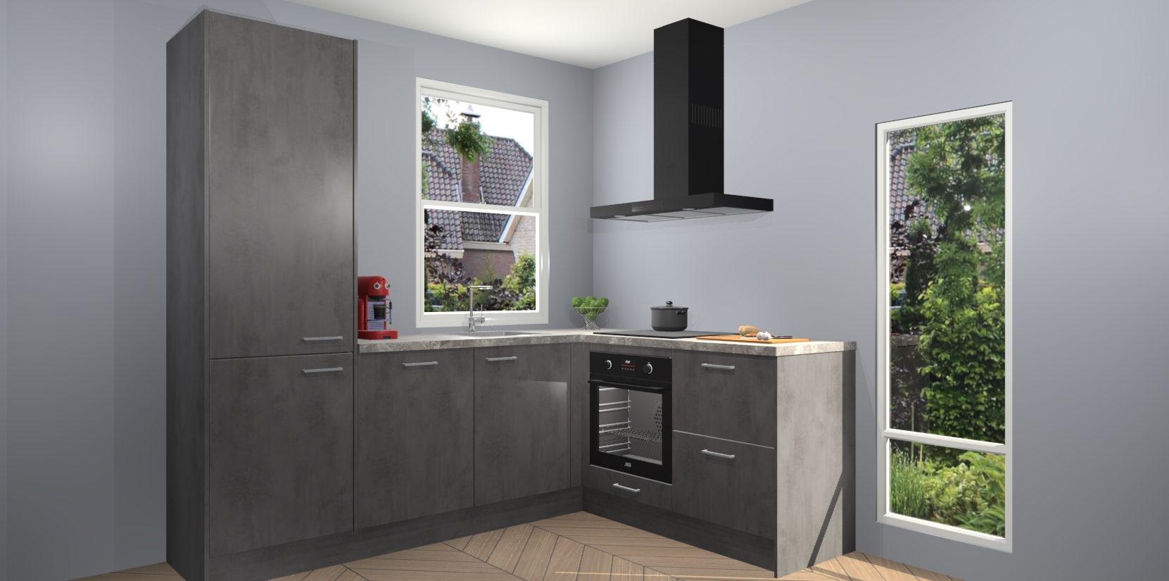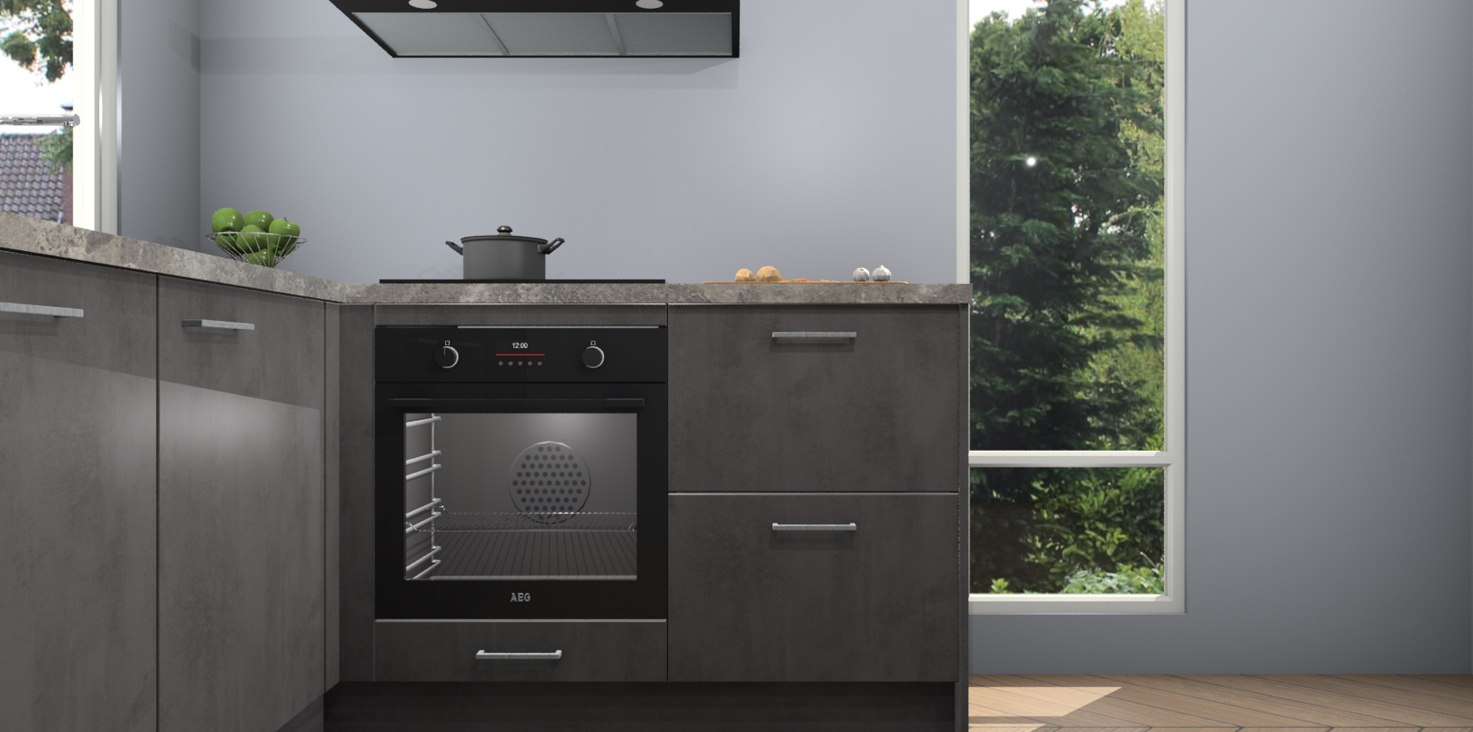 De Beton Antraciet keuken Phuket heeft alles wat u maar kunt wensen. Niet alleen zijn er softclose deuren, maar ook 5 ingebouwde apparaten: een oven, inductiekookplaat, afzuigkap, vaatwasser en koelkast - waarbij u later gemakkelijk naar het AEG merk, van inductiekookplaat naar kookplaat met geïntegreerde afzuiging of van oven naar combimagnetron kunt upgraden. Dat alles tegen een vast laag tarief! Bovendien geeft de Beton Antraciet keuken Phuket supersnelle levering van 7 weken. Echt iets voor u als u er niet op wilt wachten om het resultaat te zien in eigen keuken!