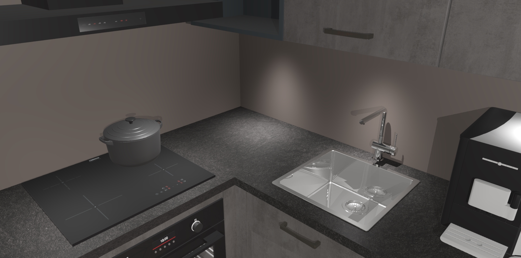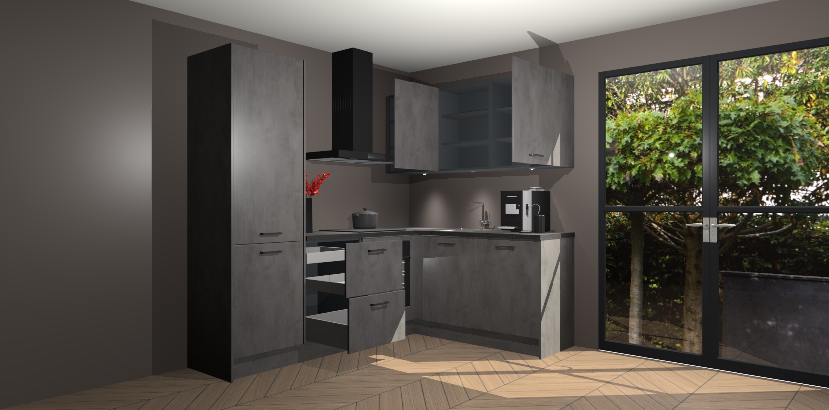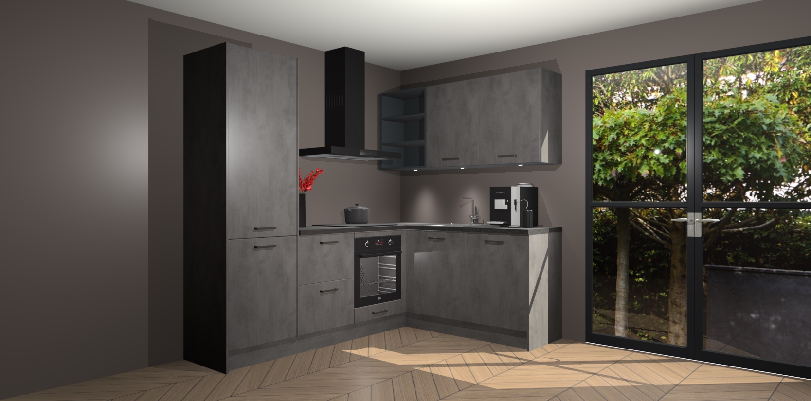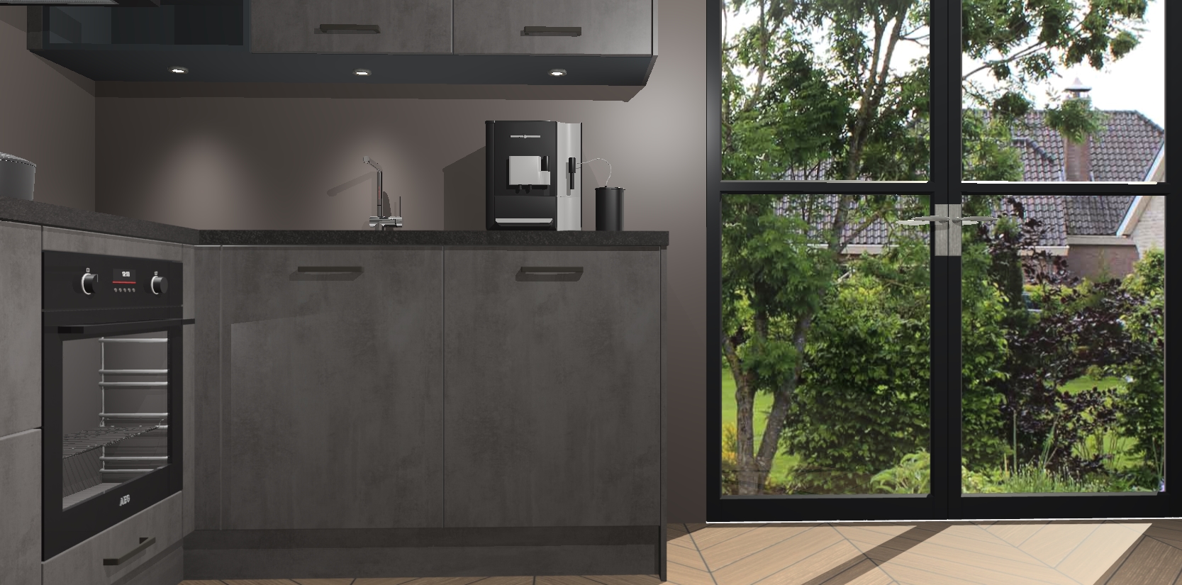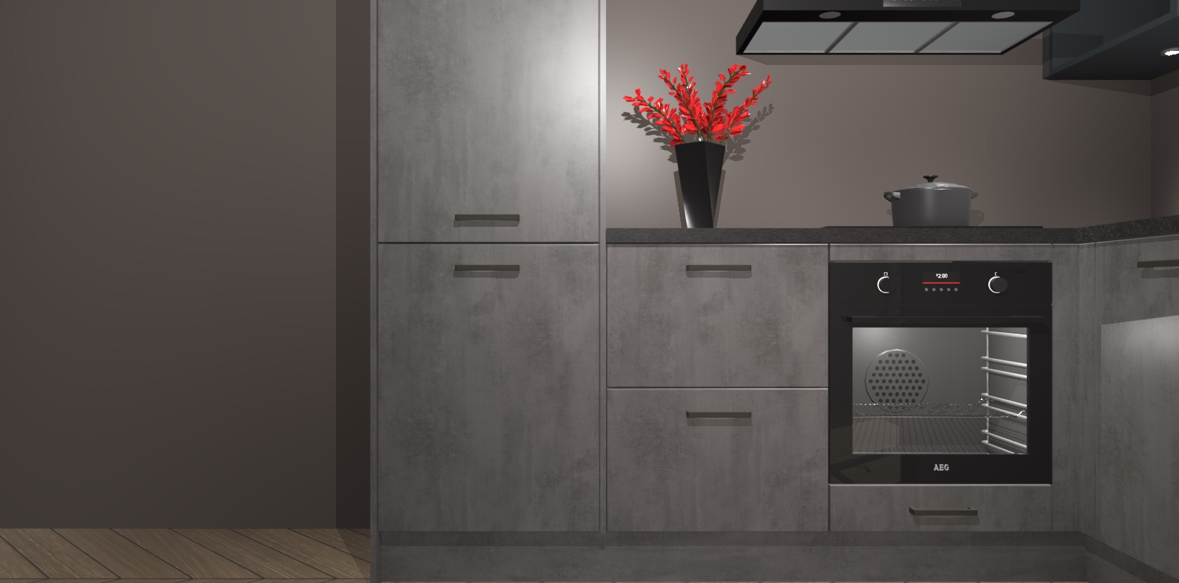 Wauw, dit is de Beton Antraciet keuken Pilsen! U kunt gerust zeggen dat u elegantie combineert met functionaliteit met deze keuken. Met een modern en chique ontwerp is de keuken precies wat u nodig heeft om uw ruimte te verfraaien. De binnenzijde van de kasten is in dezelfde donkere kleur als de buitenzijde voor een uniforme look, compleet met softclose-kasten die stil sluiten.