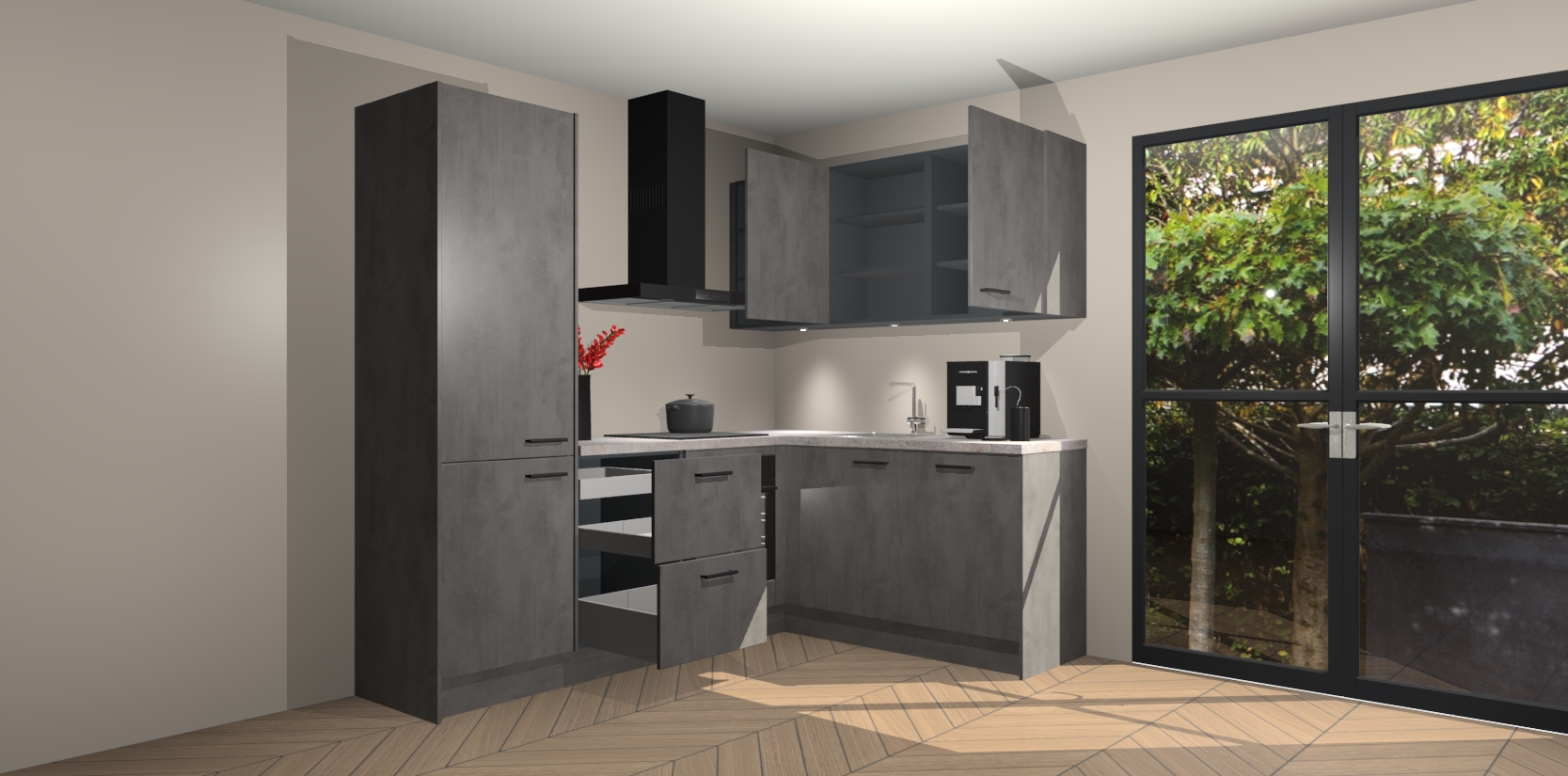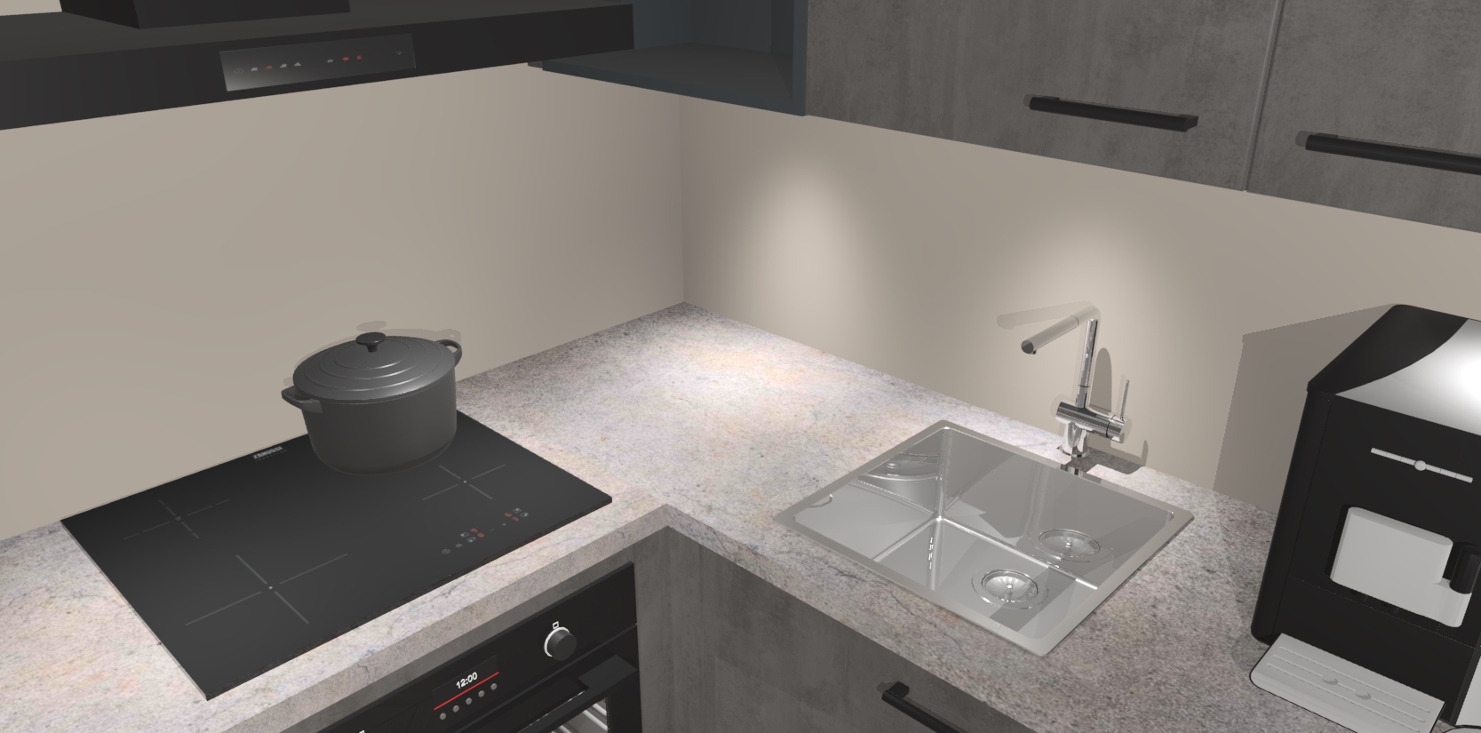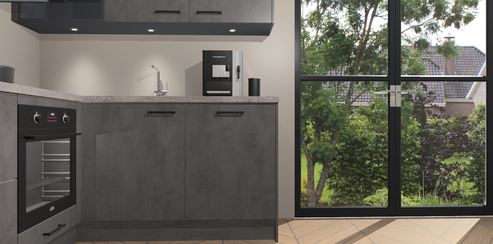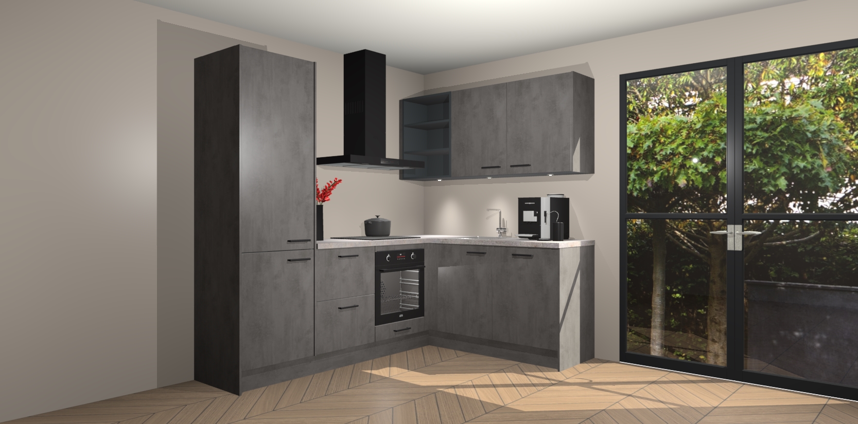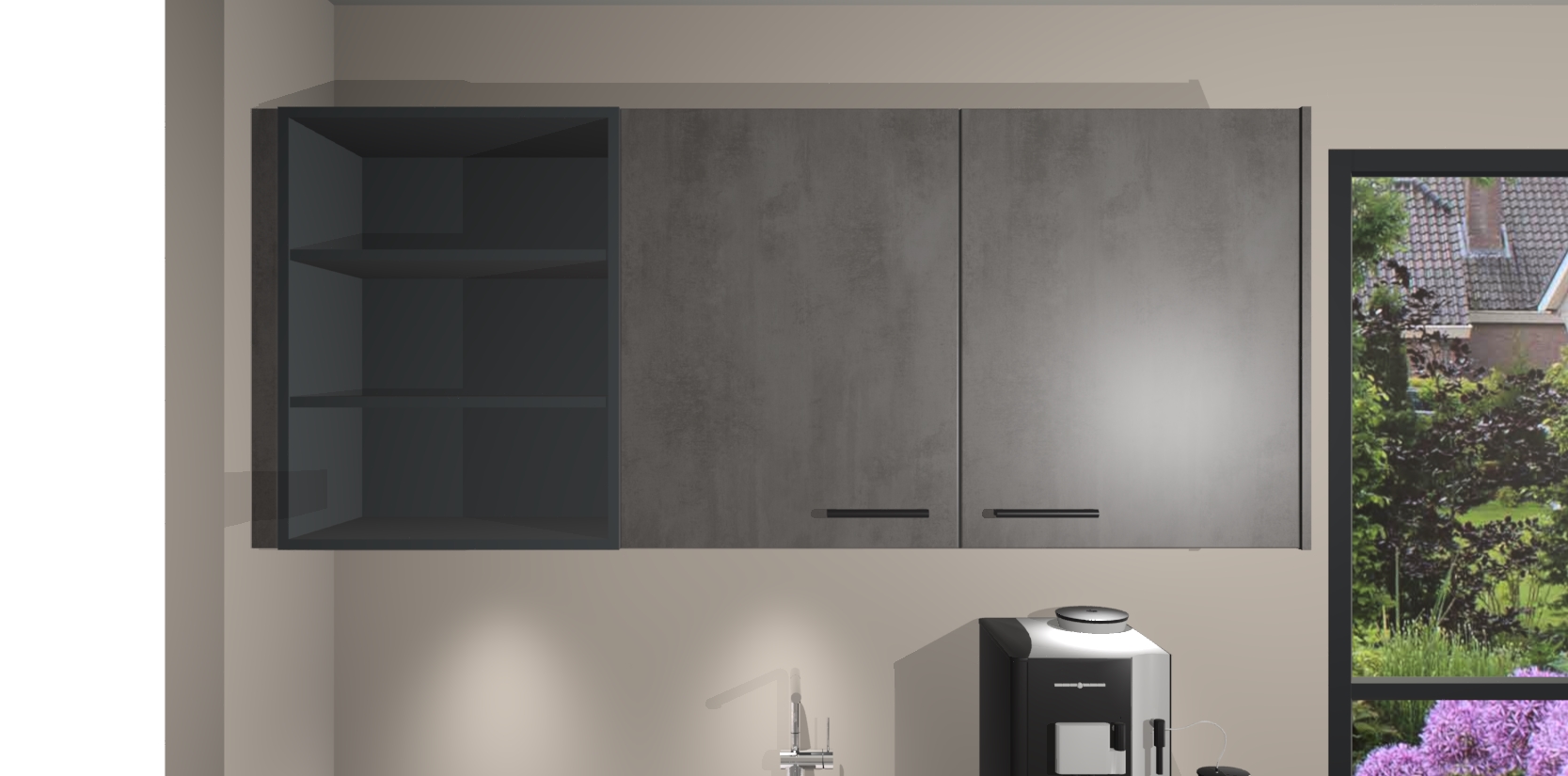 Wauw, dit is de Beton Antraciet keuken Pilsen! U kunt gerust zeggen dat u elegantie combineert met functionaliteit met deze keuken. Met een modern en chique ontwerp is de keuken precies wat u nodig heeft om uw ruimte te verfraaien. De binnenzijde van de kasten is in dezelfde donkere kleur als de buitenzijde voor een uniforme look, compleet met softclose-kasten die stil sluiten.