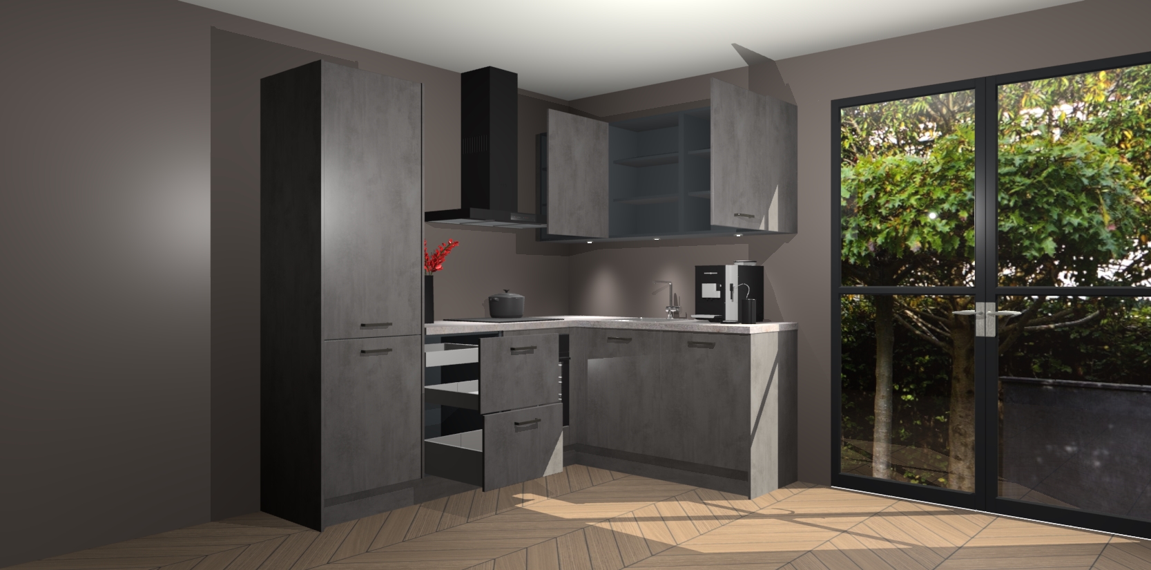 Wauw, dit is de Beton Antraciet keuken Pilsen! U kunt gerust zeggen dat u elegantie combineert met functionaliteit met deze keuken. Met een modern en chique ontwerp is de keuken precies wat u nodig heeft om uw ruimte te verfraaien. De binnenzijde van de kasten is in dezelfde donkere kleur als de buitenzijde voor een uniforme look, compleet met softclose-kasten die stil sluiten.