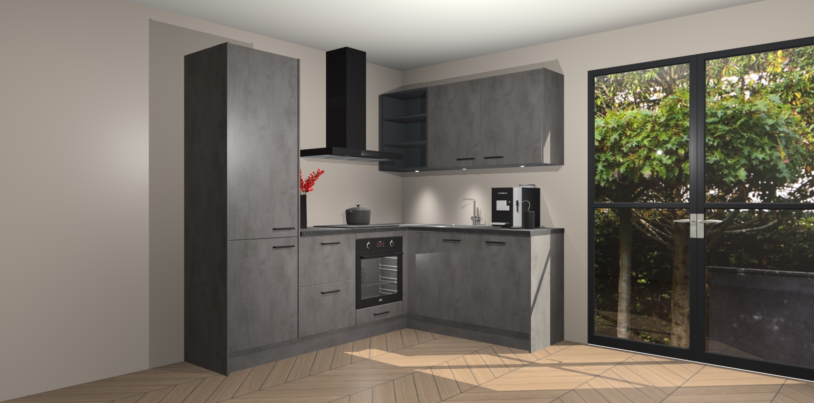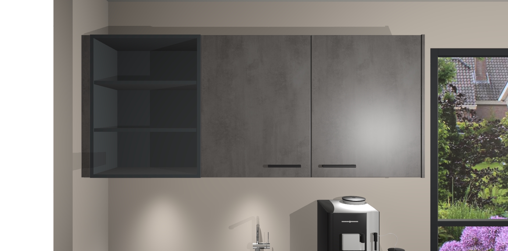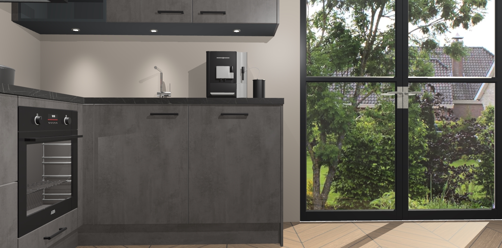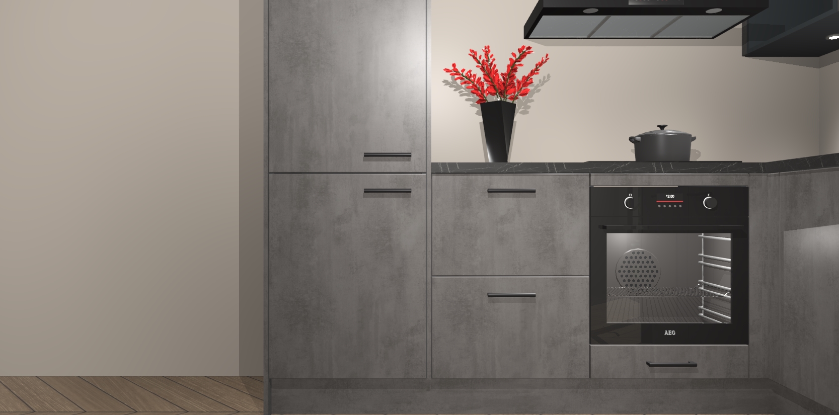 Wauw, dit is de Beton Antraciet keuken Pilsen! U kunt gerust zeggen dat u elegantie combineert met functionaliteit met deze keuken. Met een modern en chique ontwerp is de keuken precies wat u nodig heeft om uw ruimte te verfraaien. De binnenzijde van de kasten is in dezelfde donkere kleur als de buitenzijde voor een uniforme look, compleet met softclose-kasten die stil sluiten.