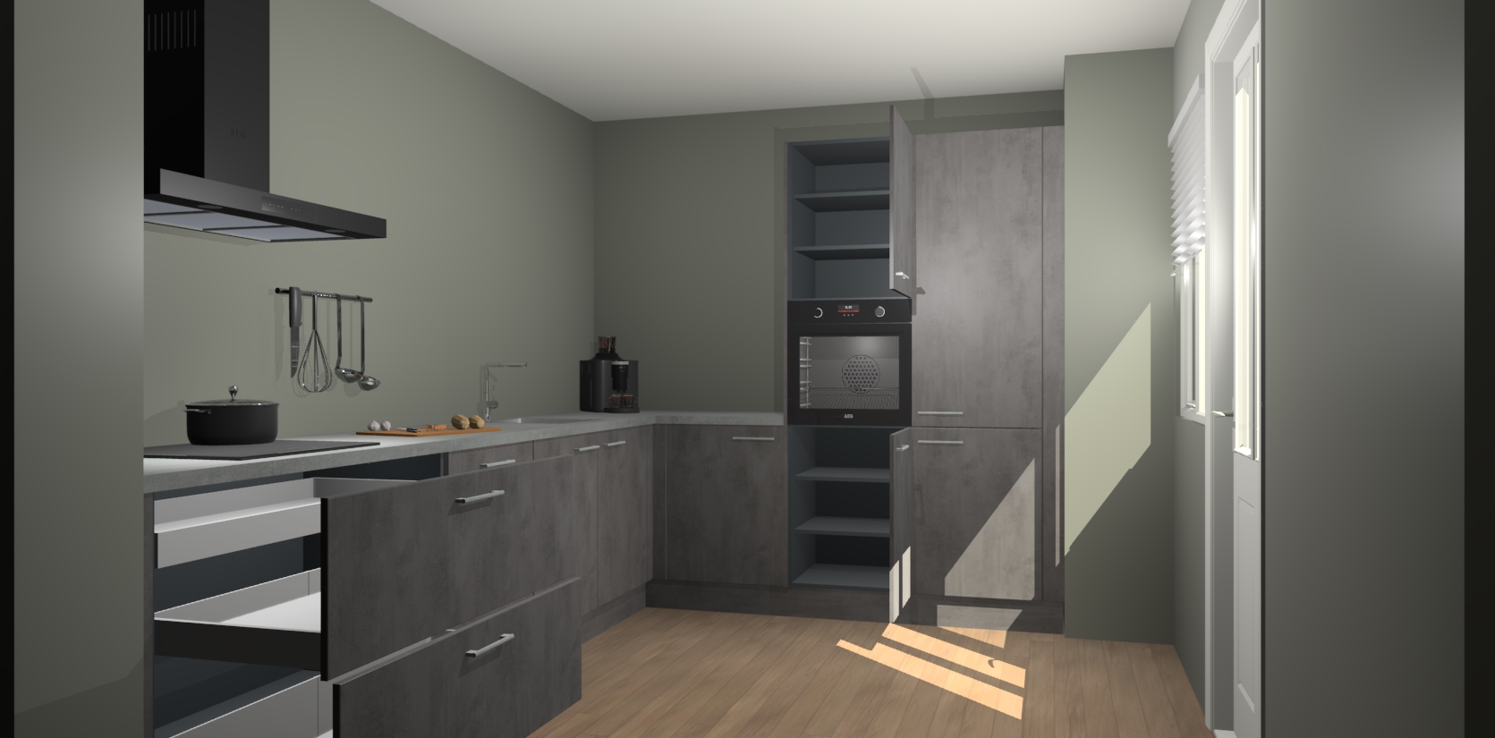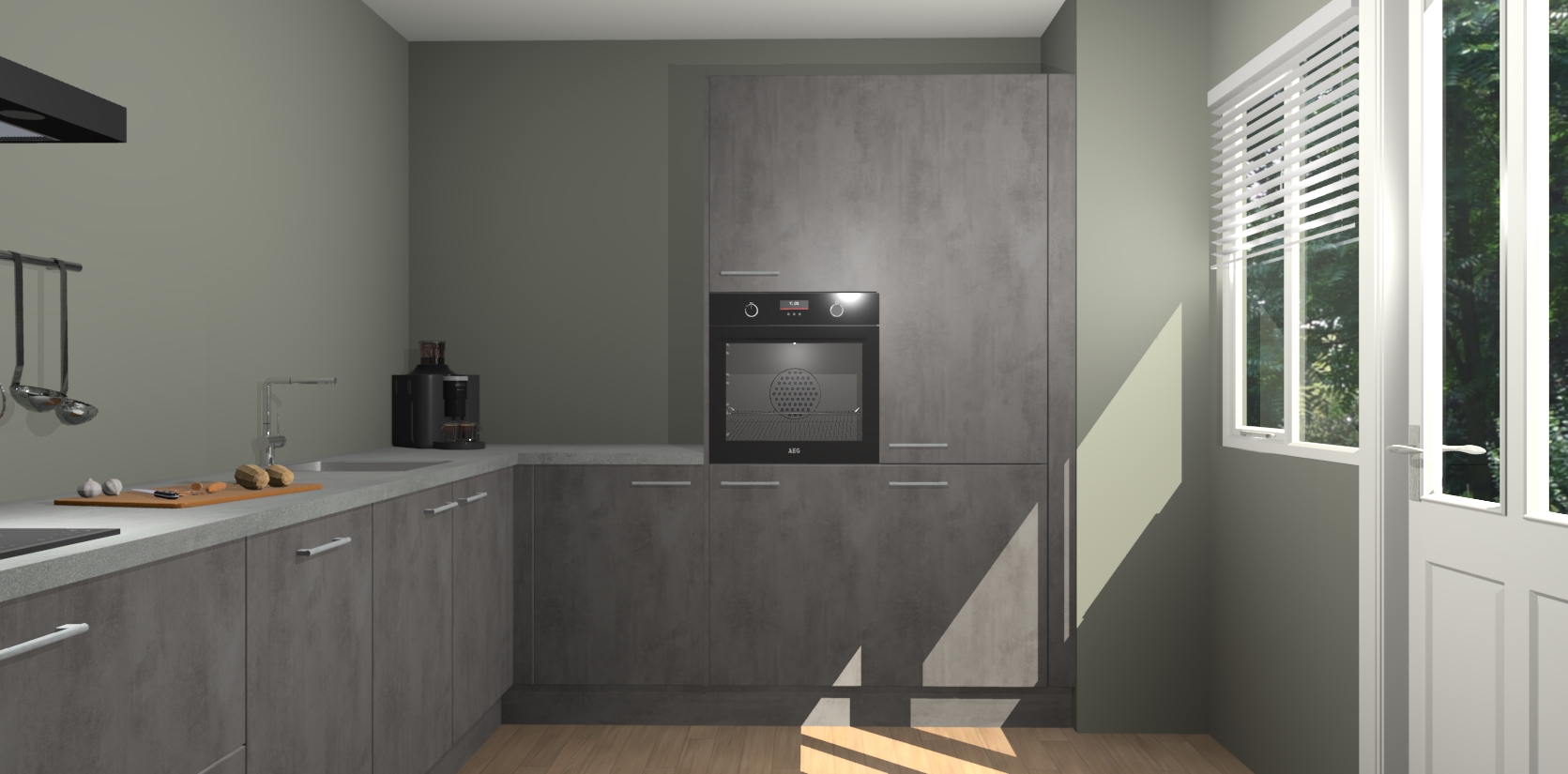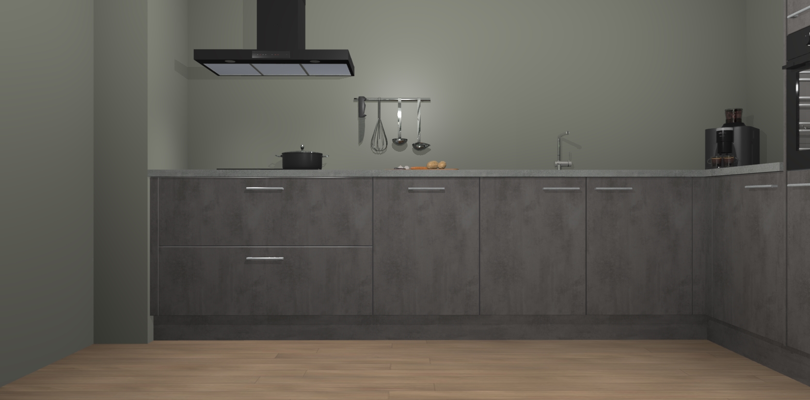 Welkom bij de Beton Antraciet keuken Portland. Deze prachtige keuken zal de komende jaren het middelpunt van de belangstelling in uw huis zijn. Uitgerust met vijf inbouwapparaten komt u nooit kookgereedschap tekort. Bovendien geeft de warme houtlook elke ruimte een uitnodigende en tijdloze uitstraling.