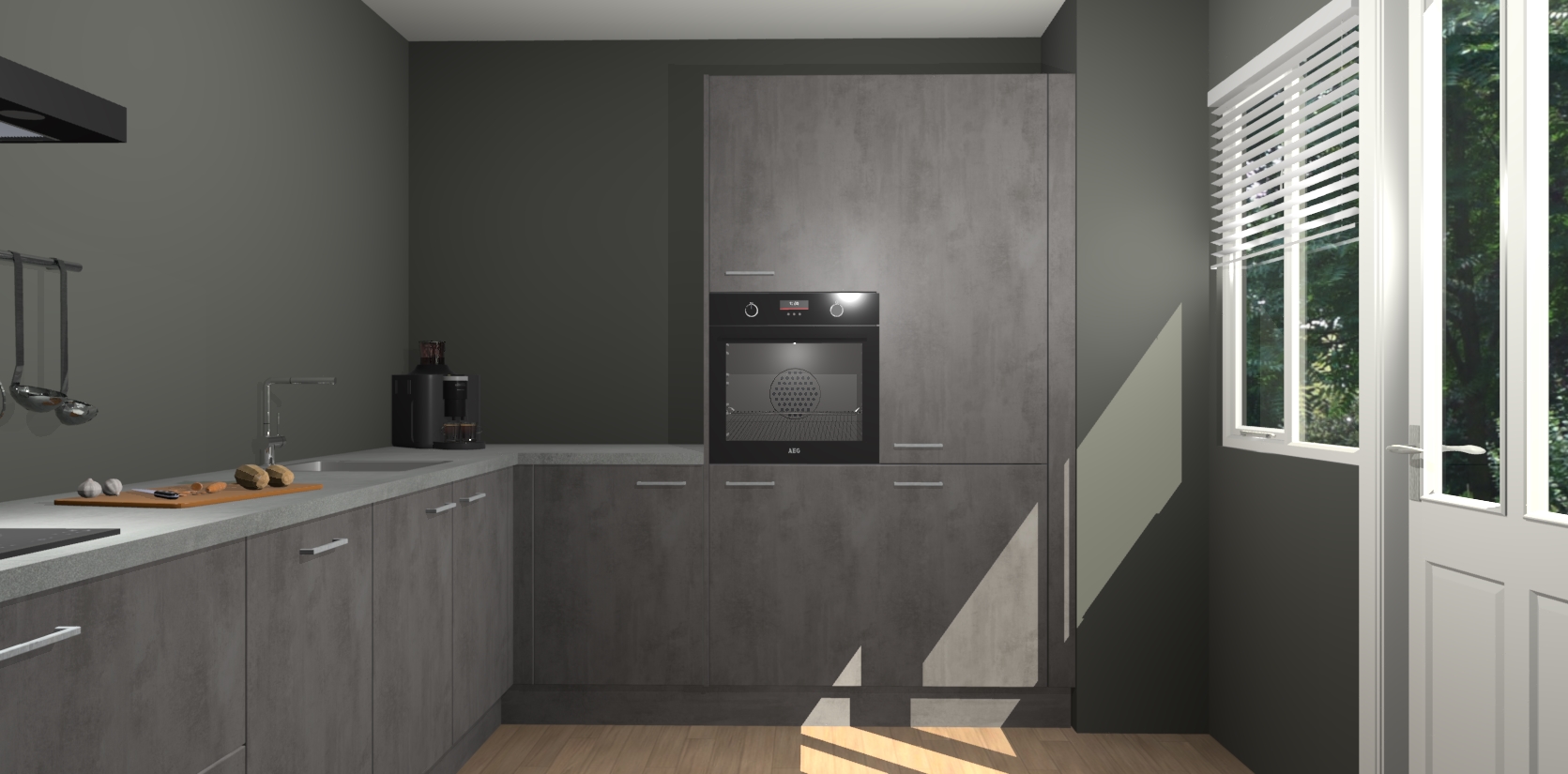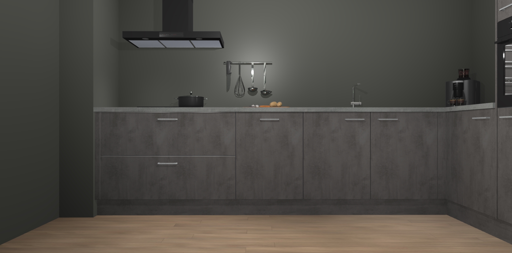 Welkom bij de Beton Antraciet keuken Portland. Deze prachtige keuken zal de komende jaren het middelpunt van de belangstelling in uw huis zijn. Uitgerust met vijf inbouwapparaten komt u nooit kookgereedschap tekort. Bovendien geeft de warme houtlook elke ruimte een uitnodigende en tijdloze uitstraling.