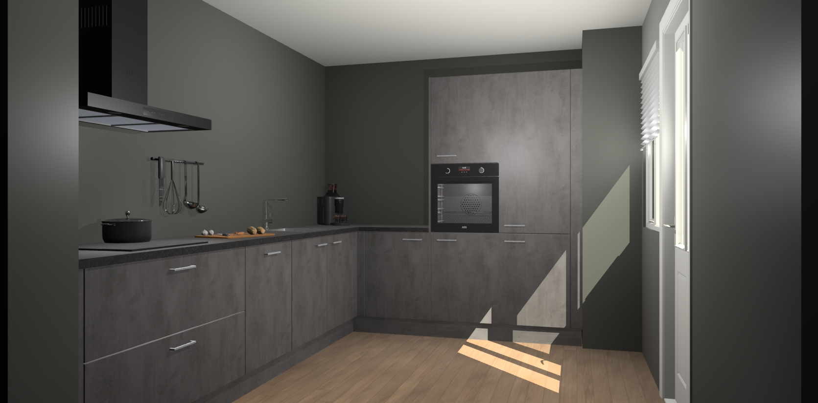 Welkom bij de Beton Antraciet keuken Portland. Deze prachtige keuken zal de komende jaren het middelpunt van de belangstelling in uw huis zijn. Uitgerust met vijf inbouwapparaten komt u nooit kookgereedschap tekort. Bovendien geeft de warme houtlook elke ruimte een uitnodigende en tijdloze uitstraling.