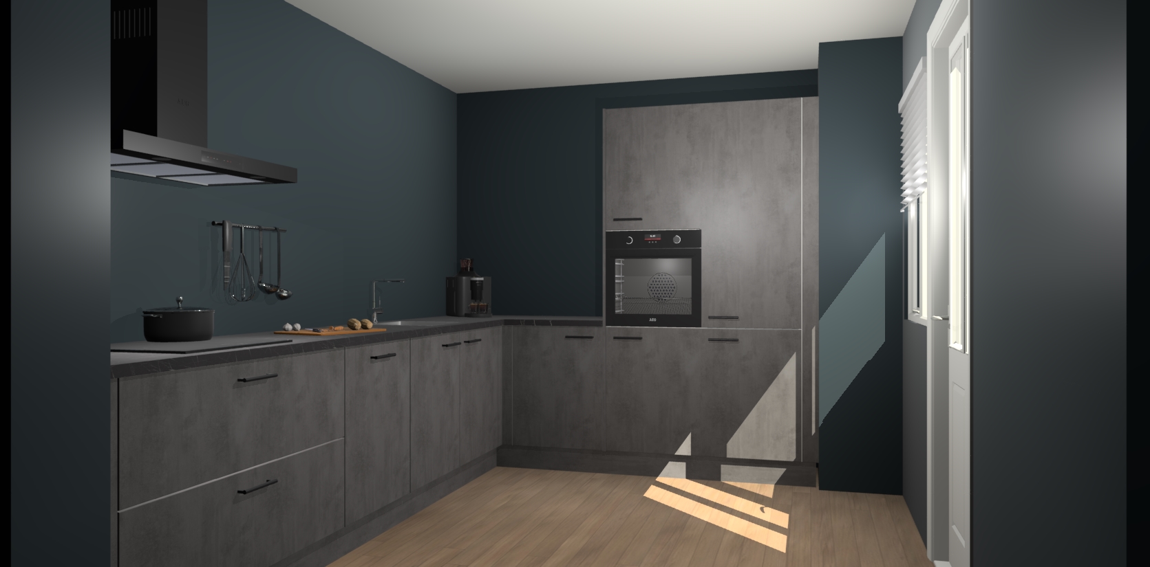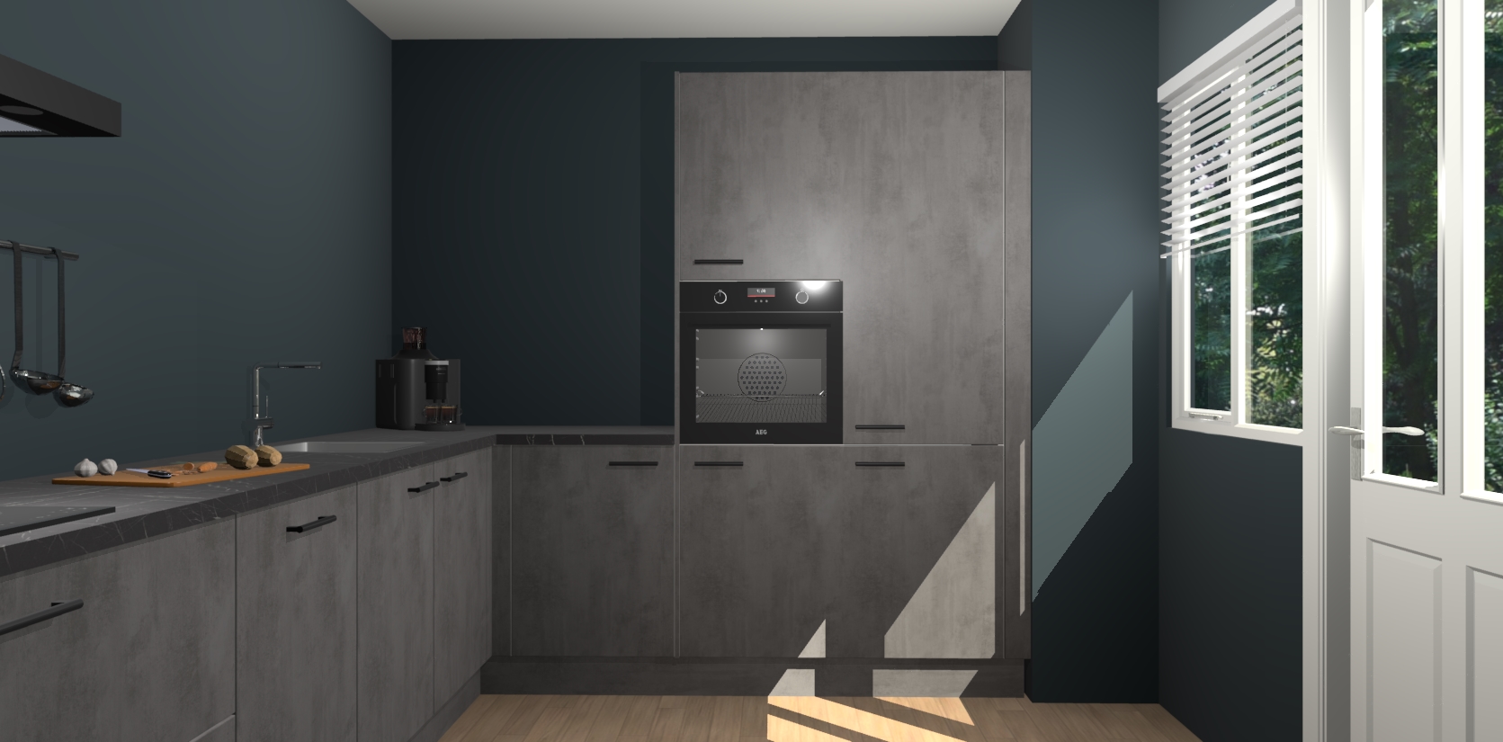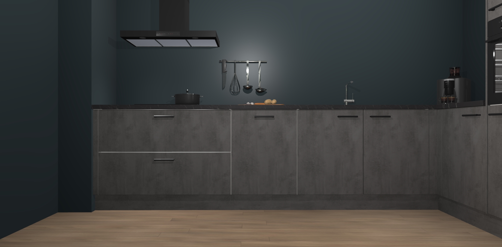 Welkom bij de Beton Antraciet keuken Portland. Deze prachtige keuken zal de komende jaren het middelpunt van de belangstelling in uw huis zijn. Uitgerust met vijf inbouwapparaten komt u nooit kookgereedschap tekort. Bovendien geeft de warme houtlook elke ruimte een uitnodigende en tijdloze uitstraling.